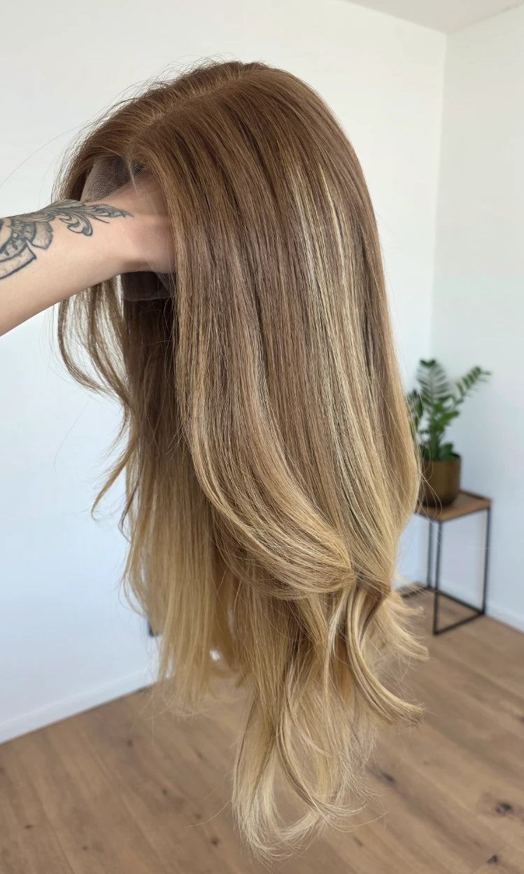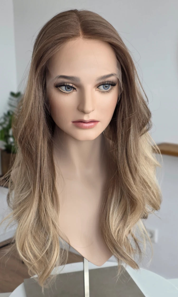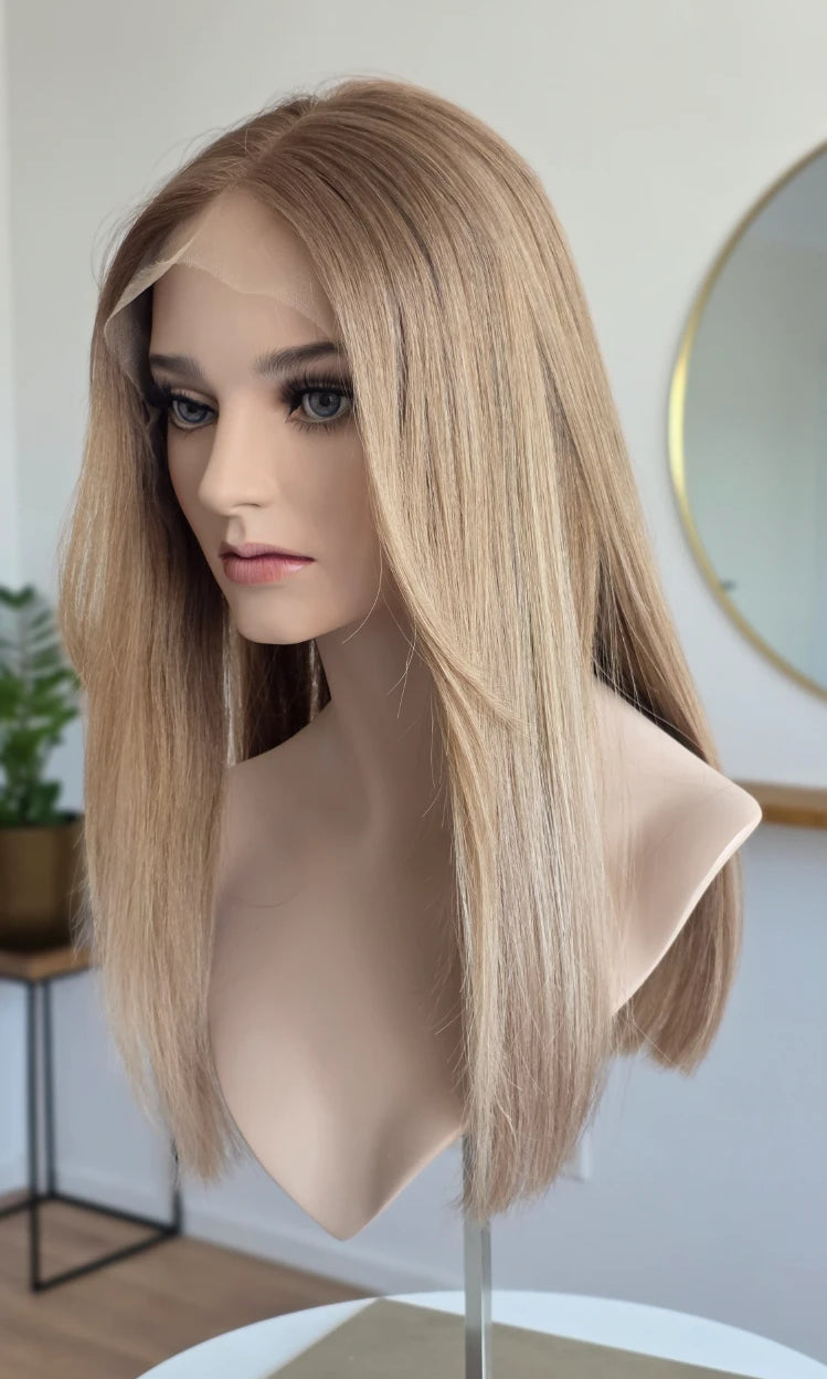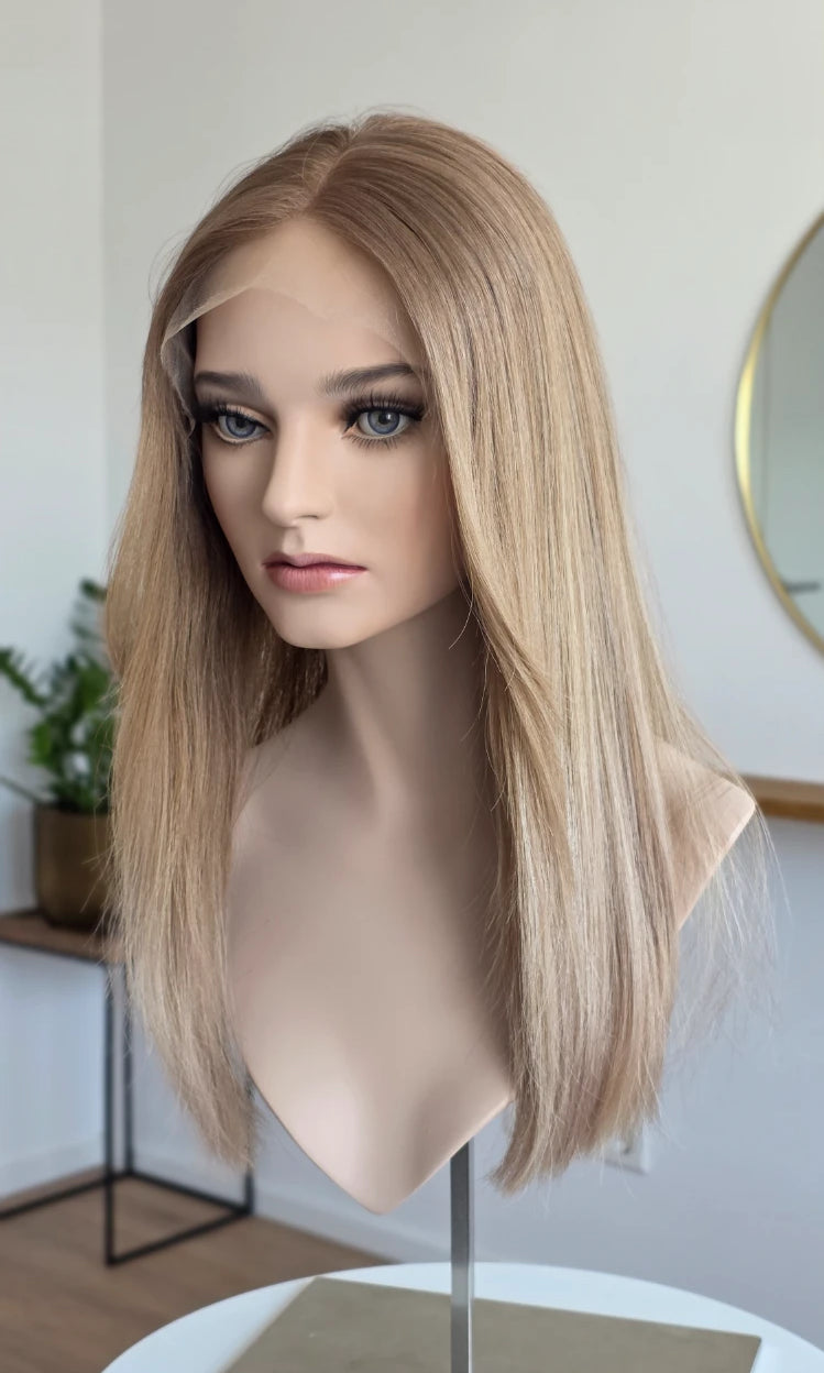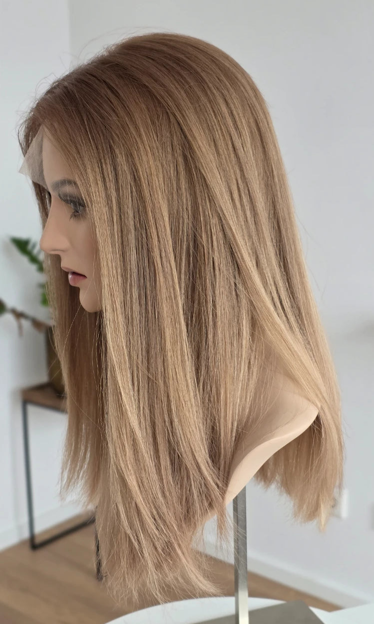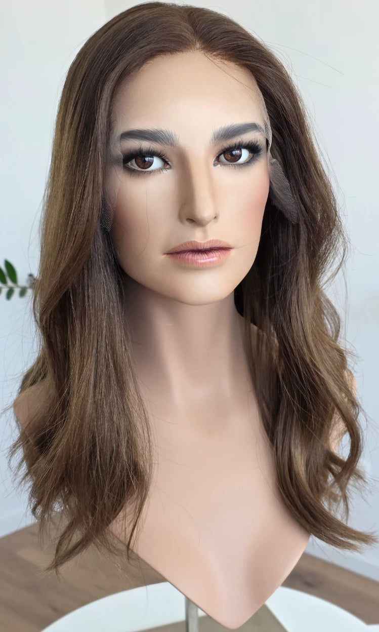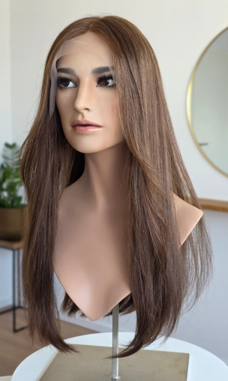 Eine Perücke bedeckt den gesamten Kopf und besteht aus verschiedenen Verarbeitungstechnicken, die gemeinsam für ein natürliches Aussehen sorgen.