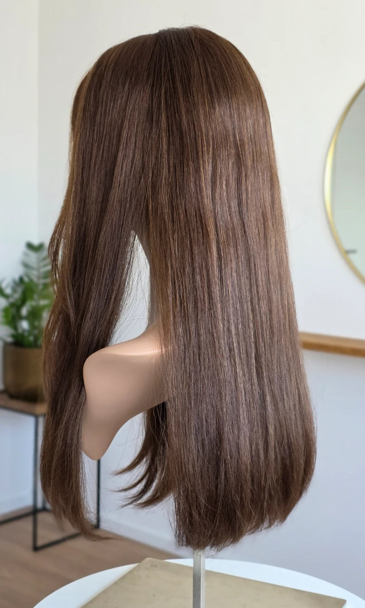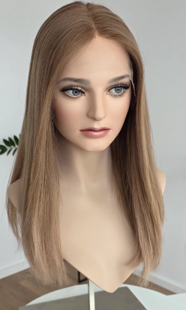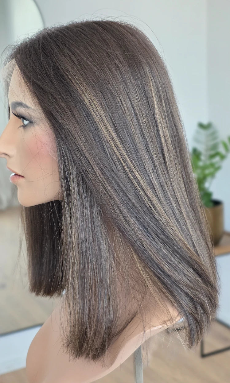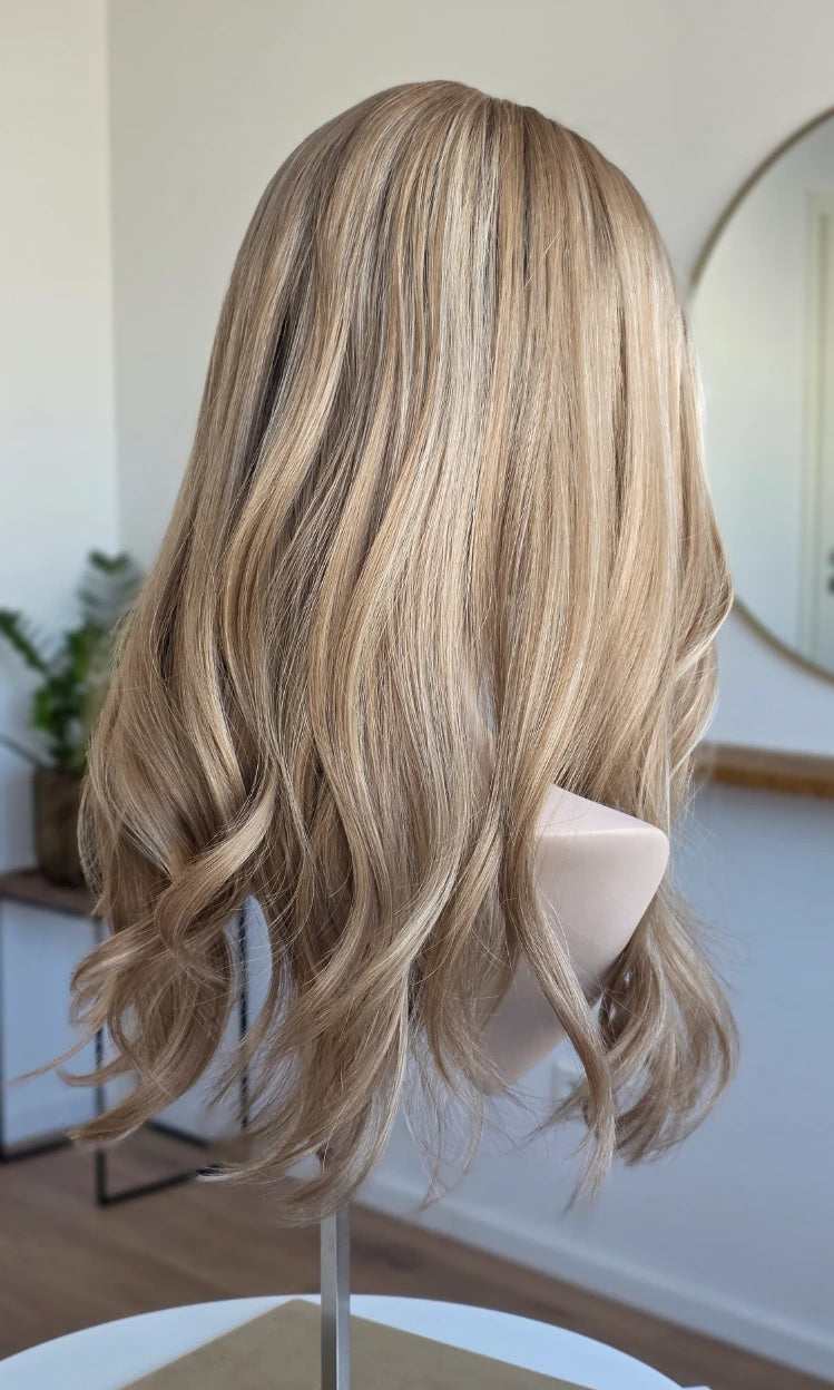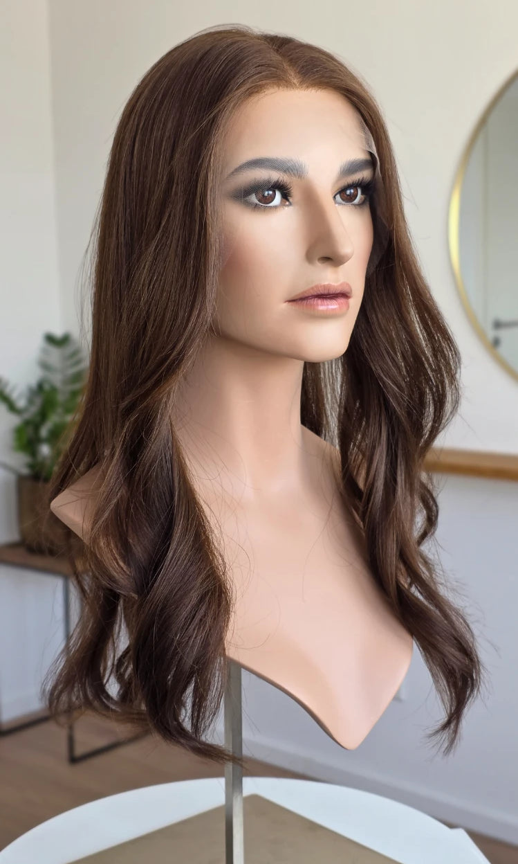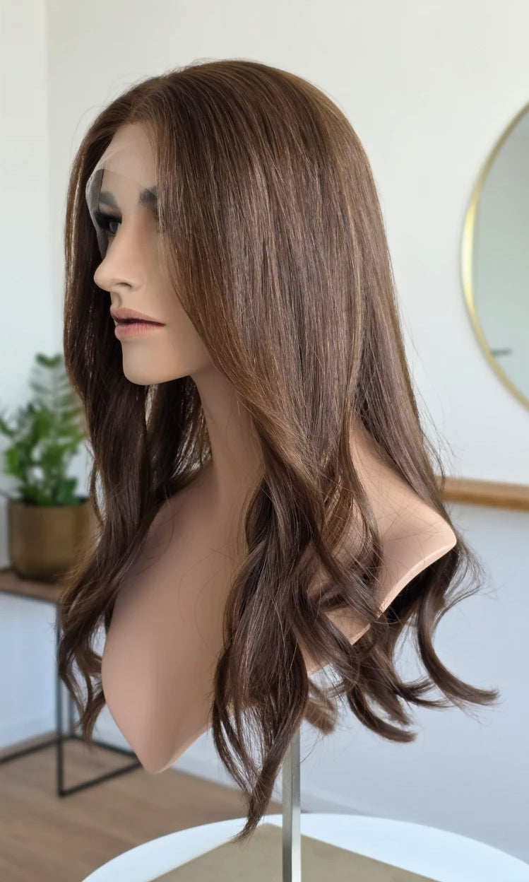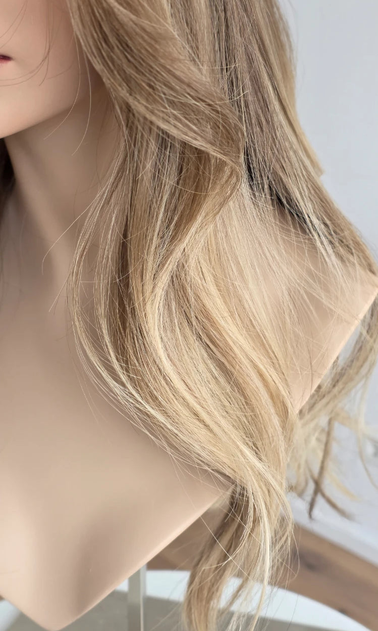 Eine Perücke bedeckt den gesamten Kopf und besteht aus verschiedenen Verarbeitungstechnicken, die gemeinsam für ein natürliches Aussehen sorgen.