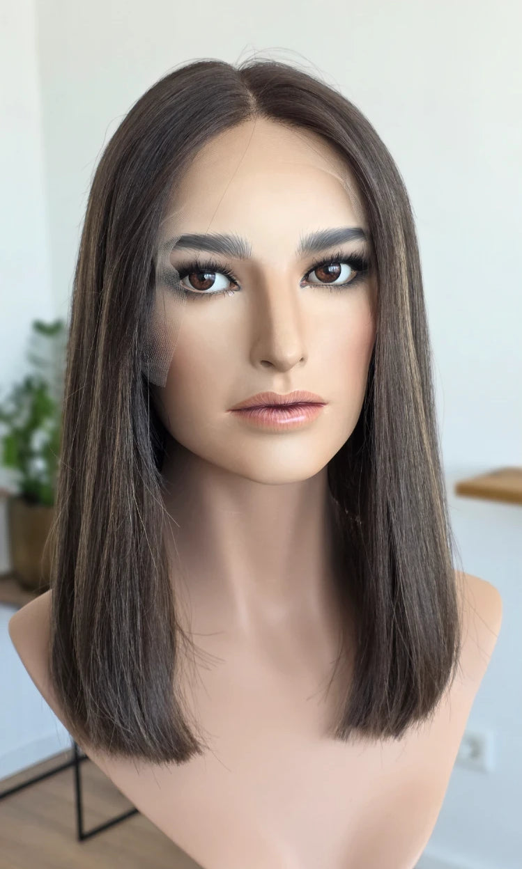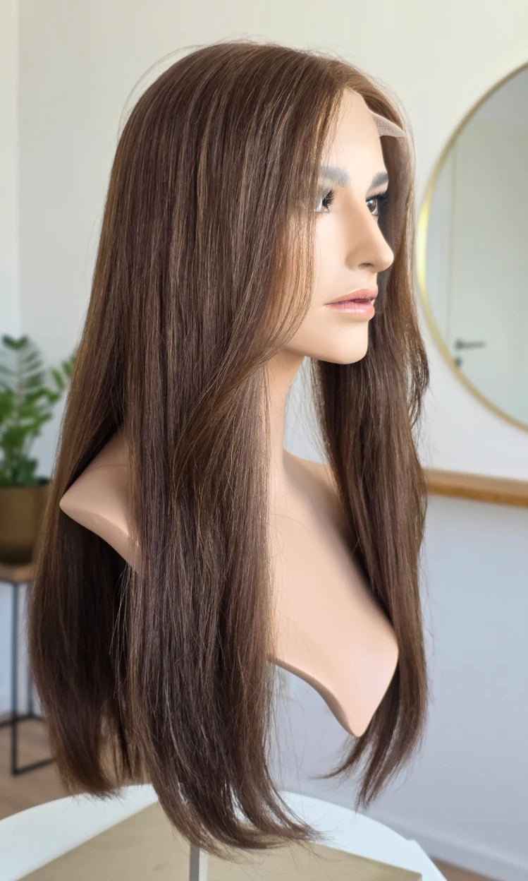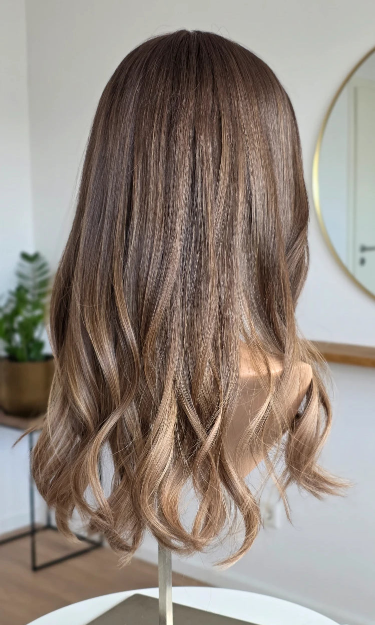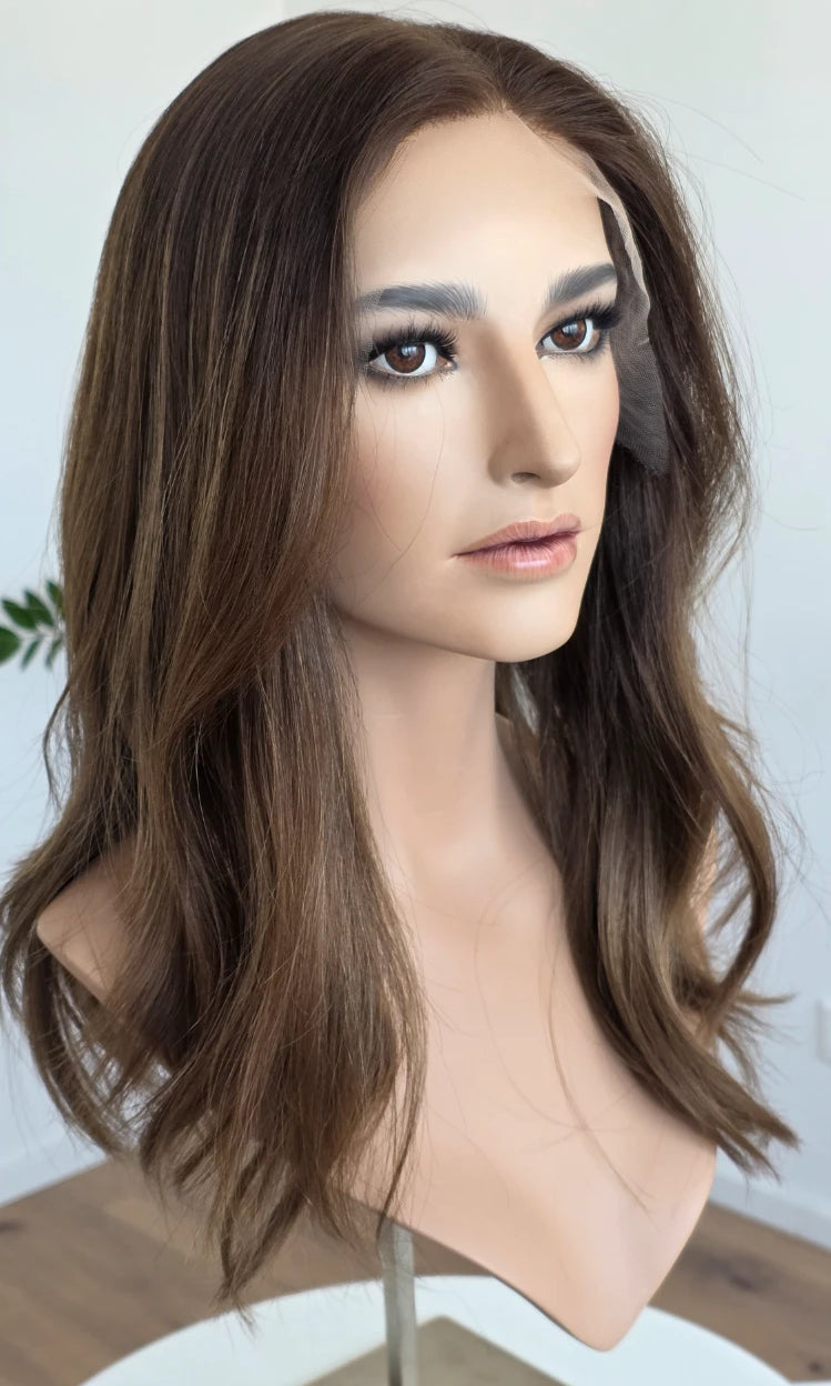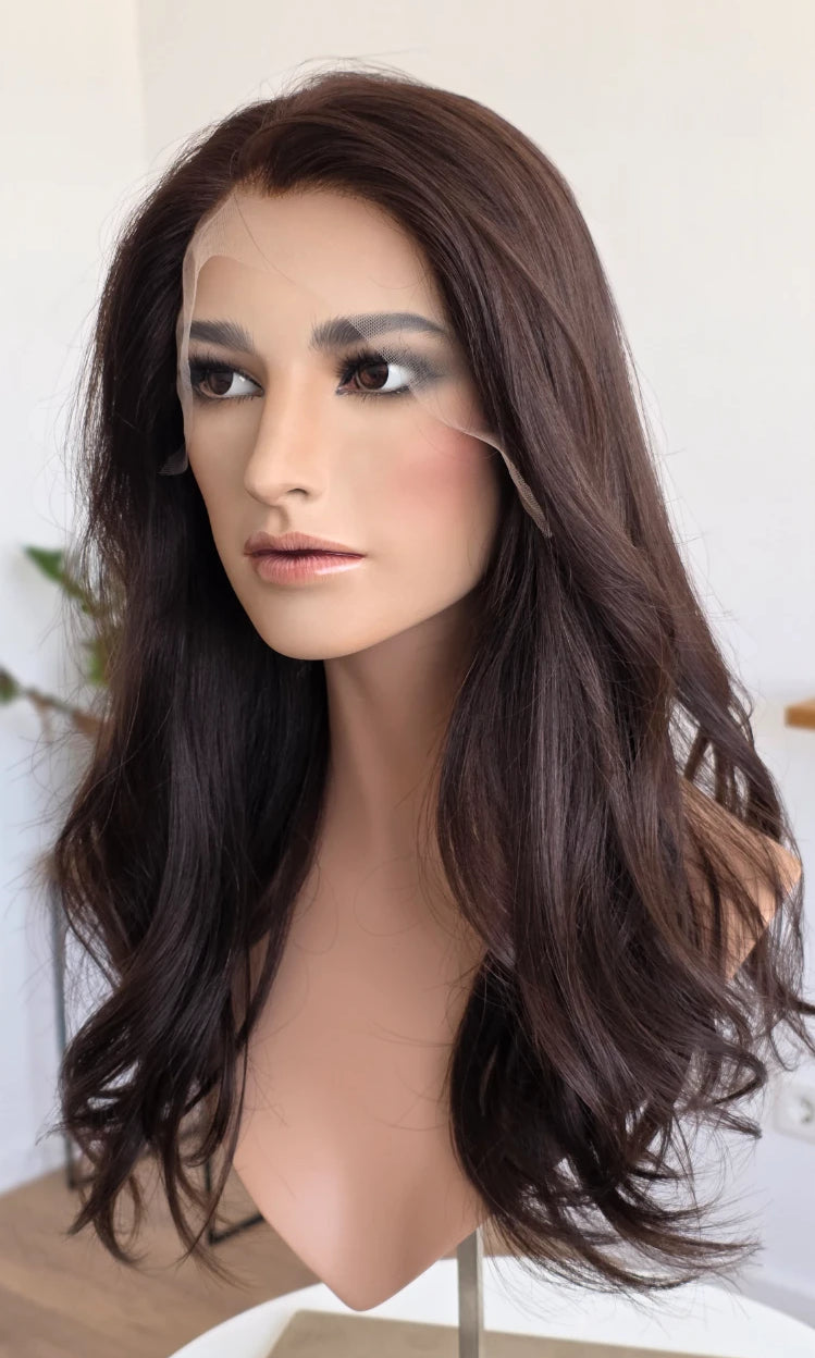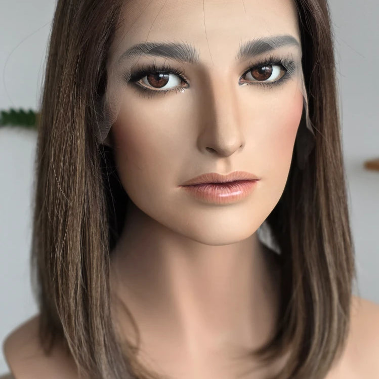 Eine Perücke bedeckt den gesamten Kopf und besteht aus verschiedenen Verarbeitungstechnicken, die gemeinsam für ein natürliches Aussehen sorgen.