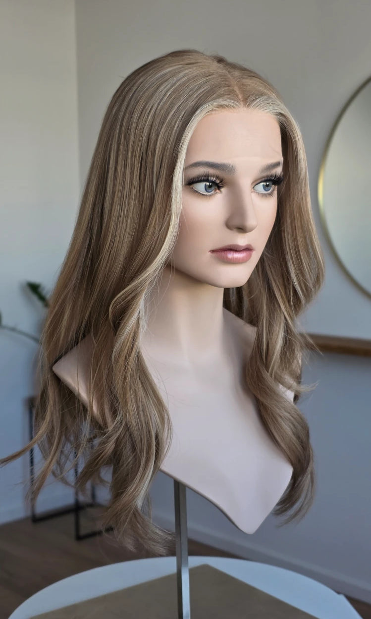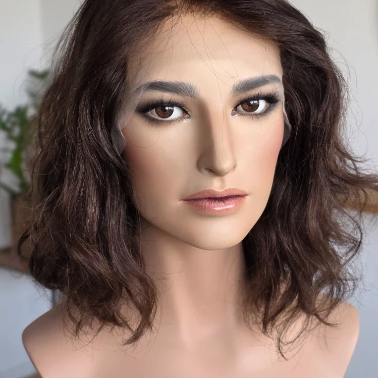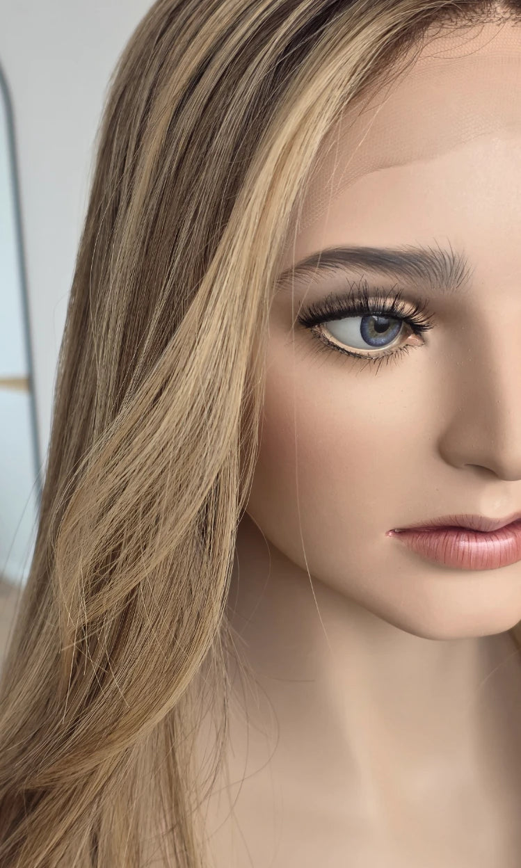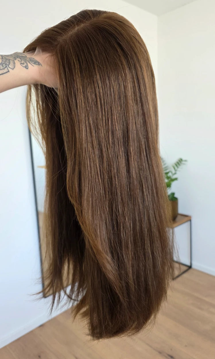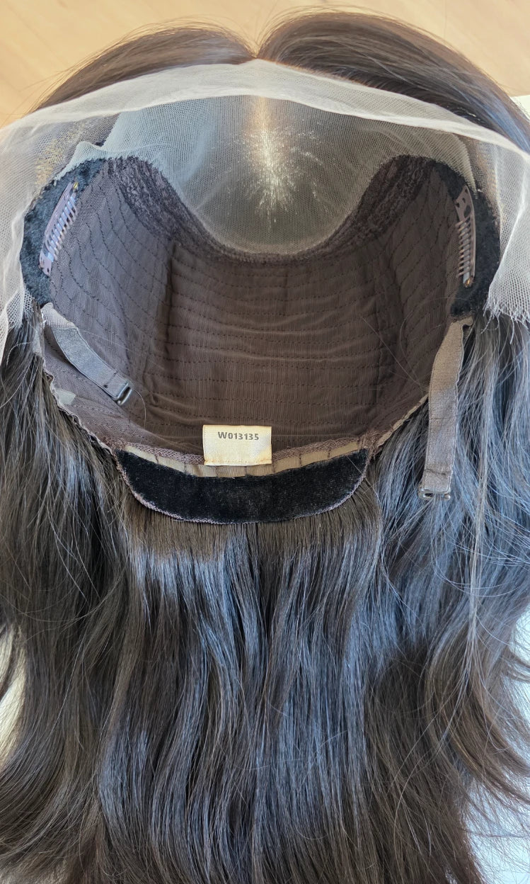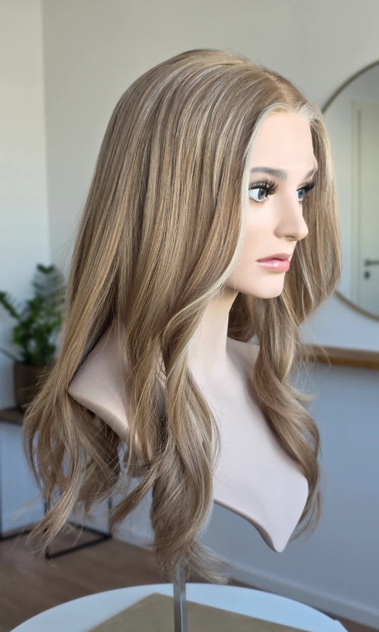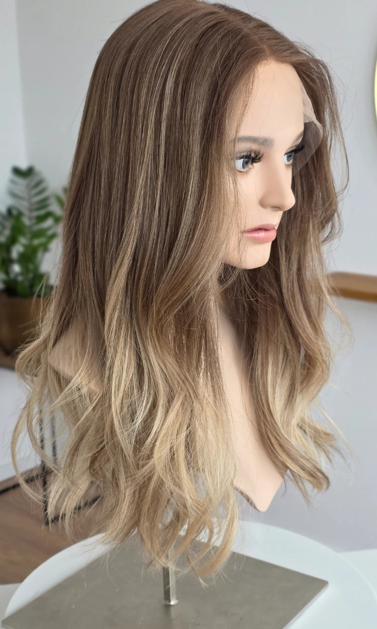 Eine Perücke bedeckt den gesamten Kopf und besteht aus verschiedenen Verarbeitungstechnicken, die gemeinsam für ein natürliches Aussehen sorgen.