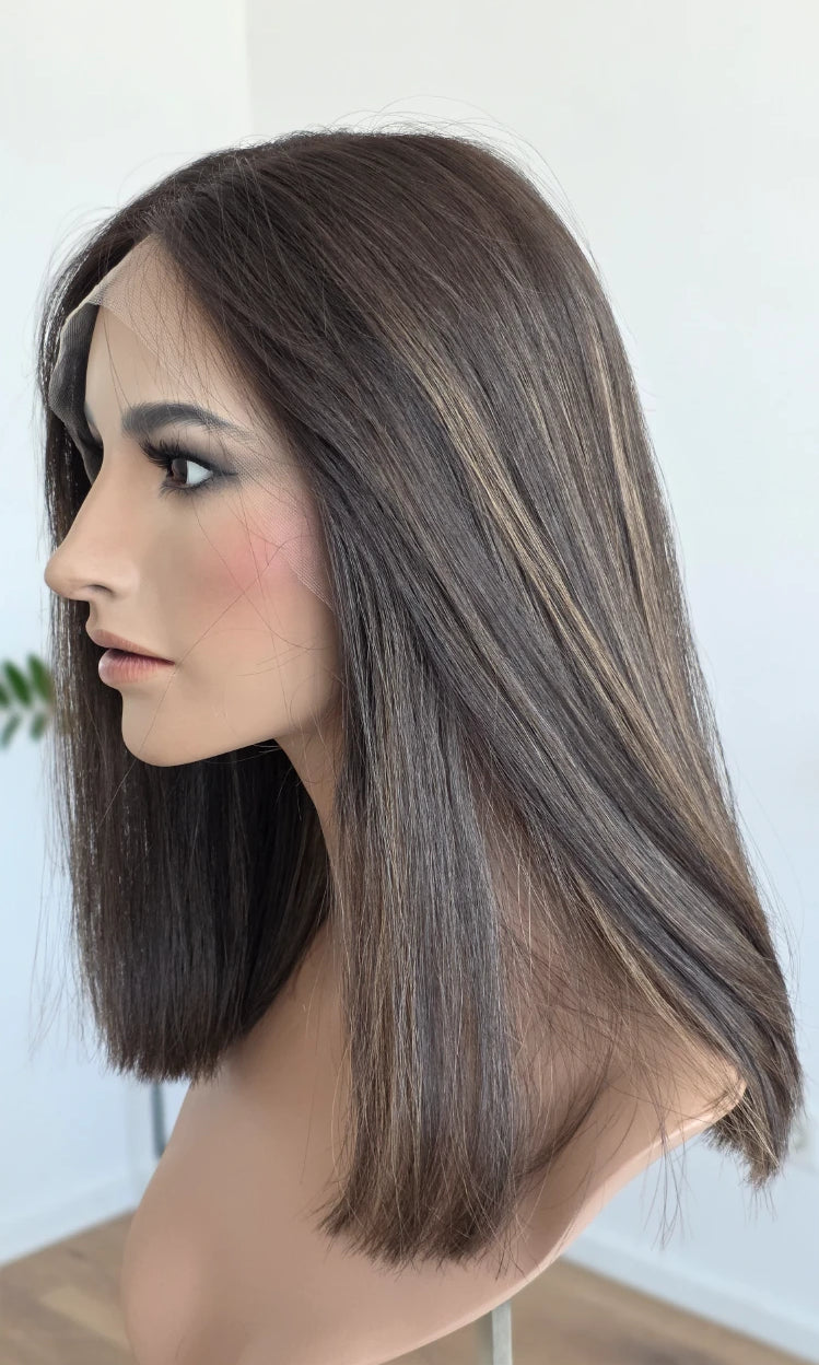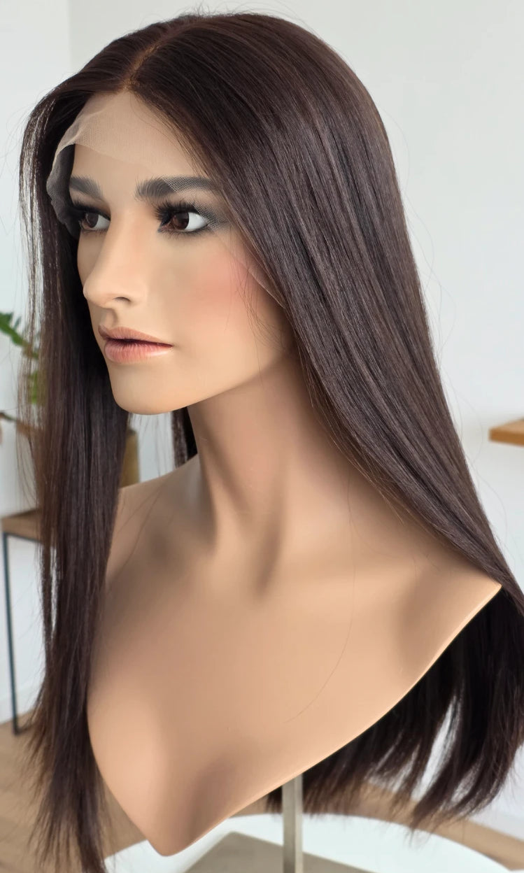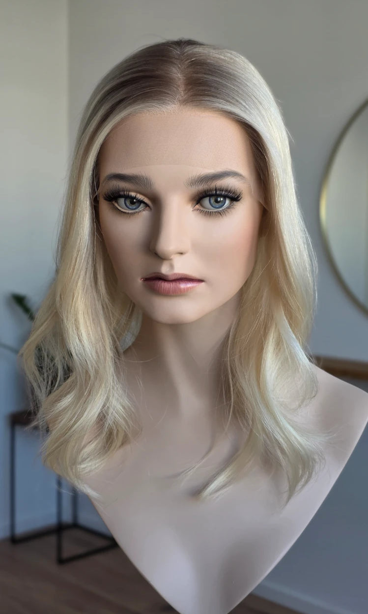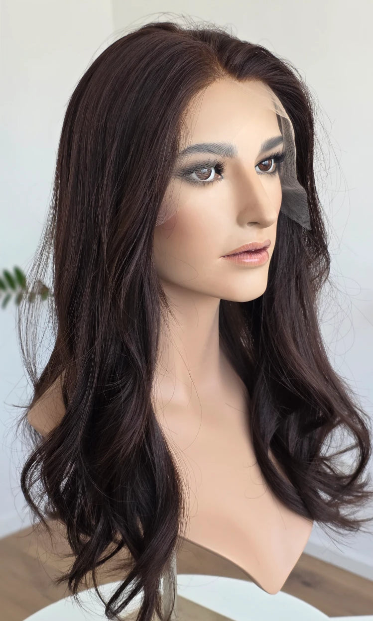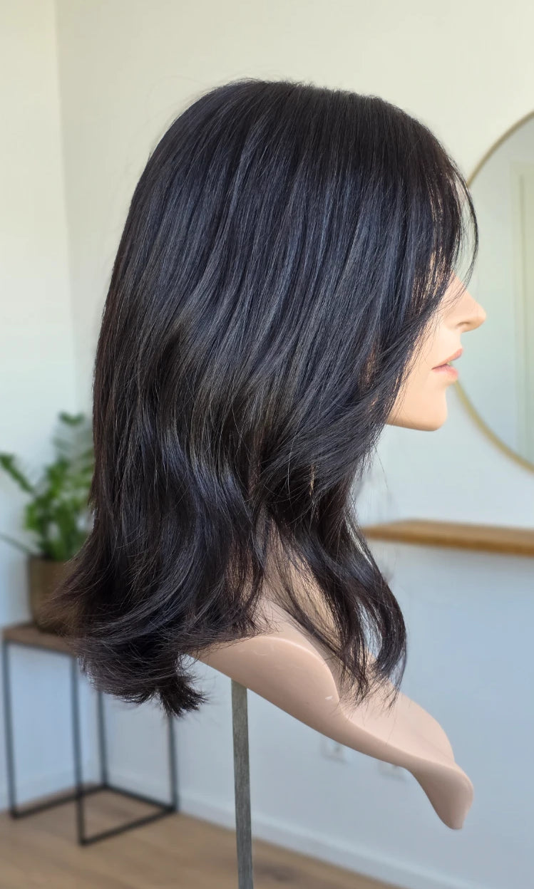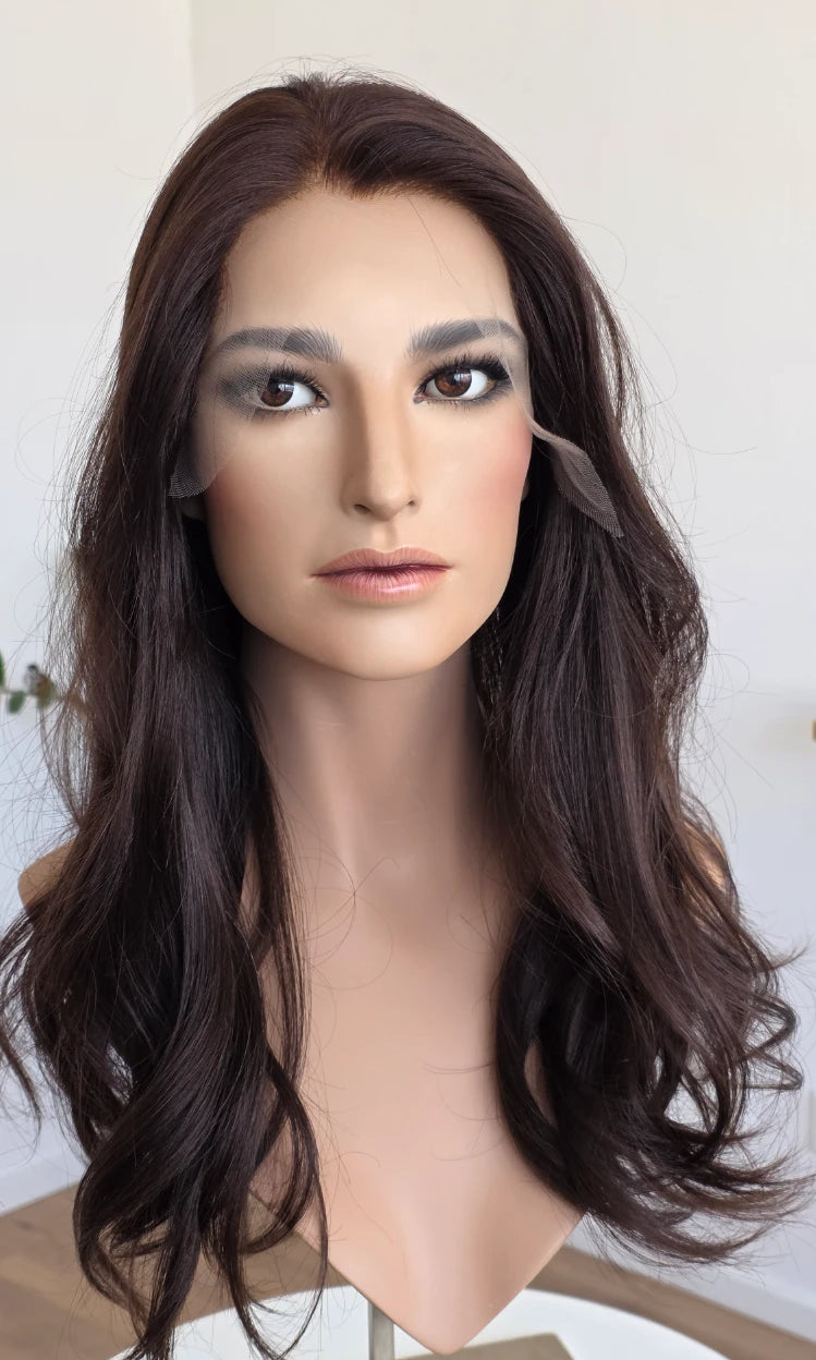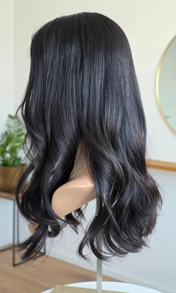 Eine Perücke bedeckt den gesamten Kopf und besteht aus verschiedenen Verarbeitungstechnicken, die gemeinsam für ein natürliches Aussehen sorgen.
