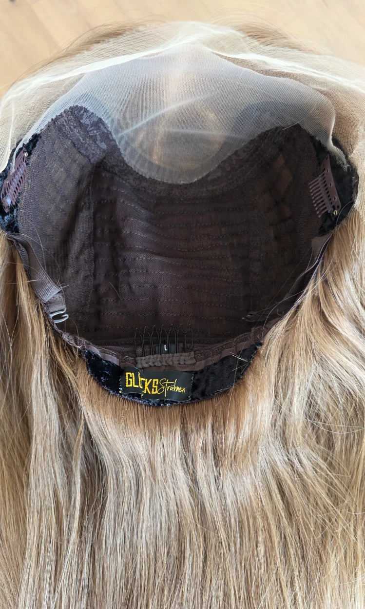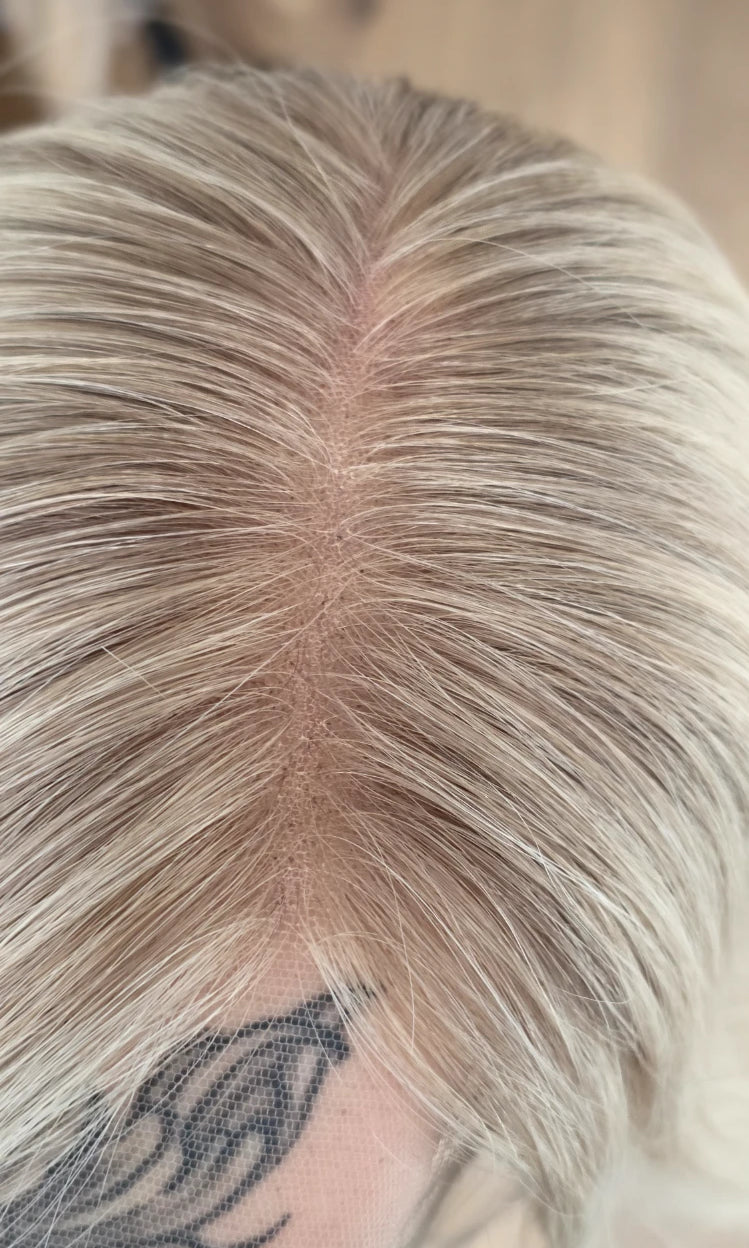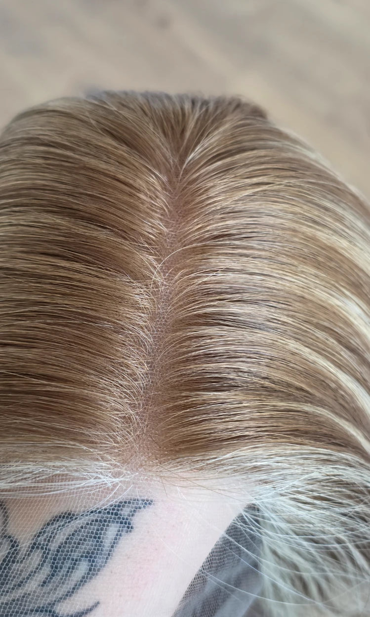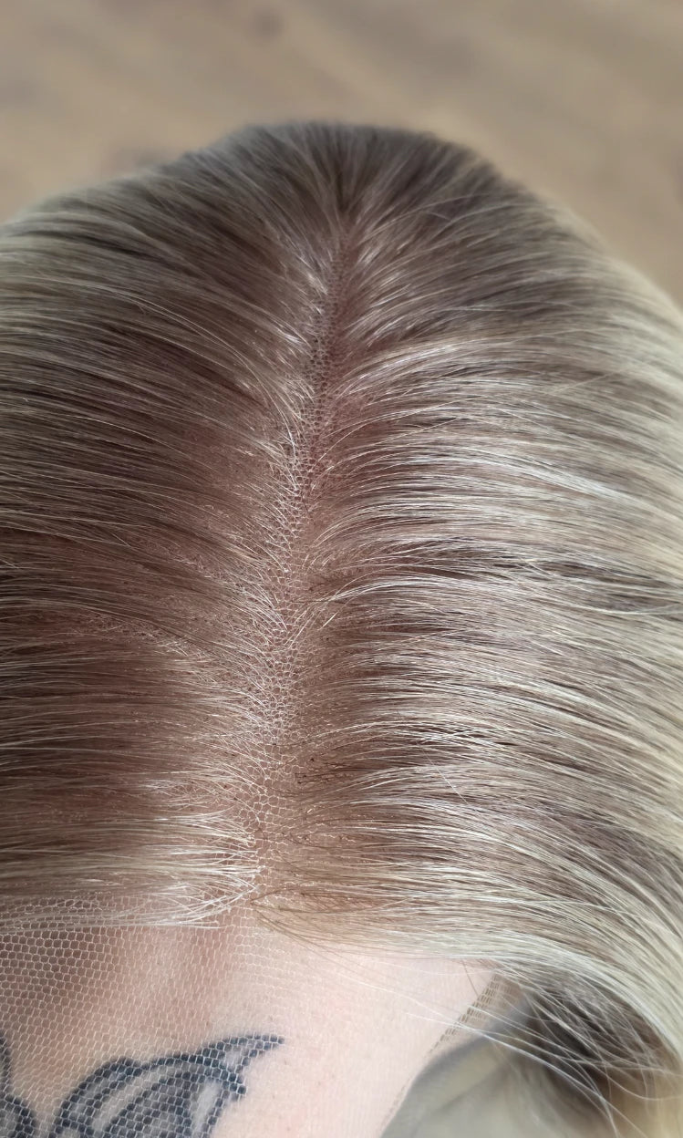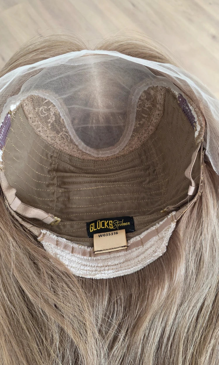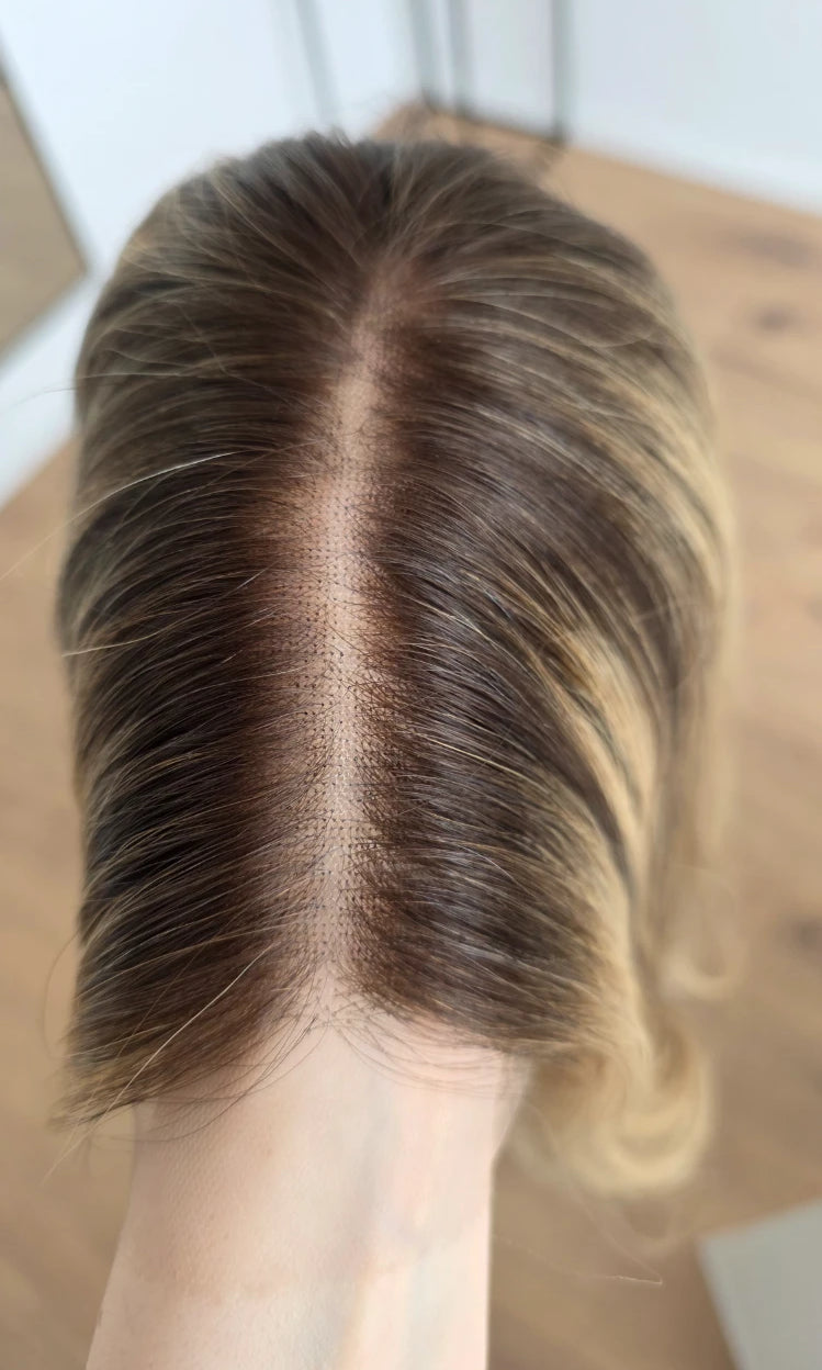 Im oberen Bereich befindet sich das sogenannte Lacetop: Hier werden die Haare ebenfalls einzeln eingeknüpft, was einen realistischen Scheitel und eine natürliche Haarbewegung ermöglicht.