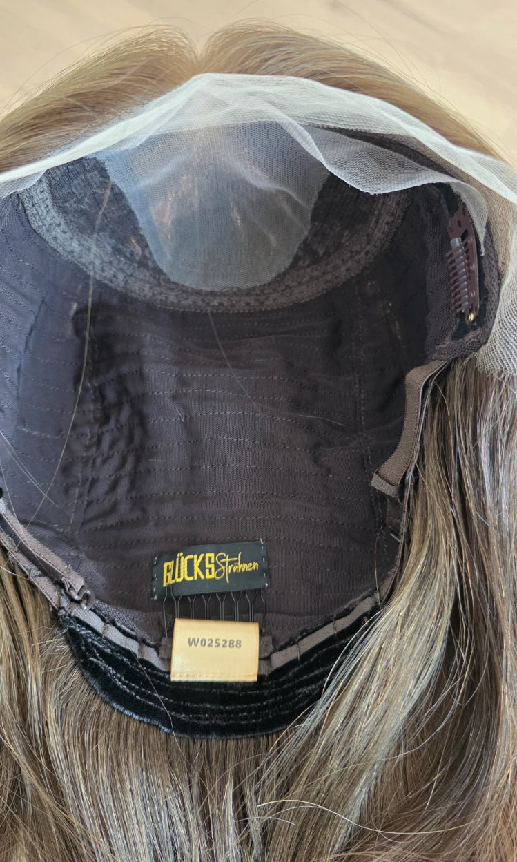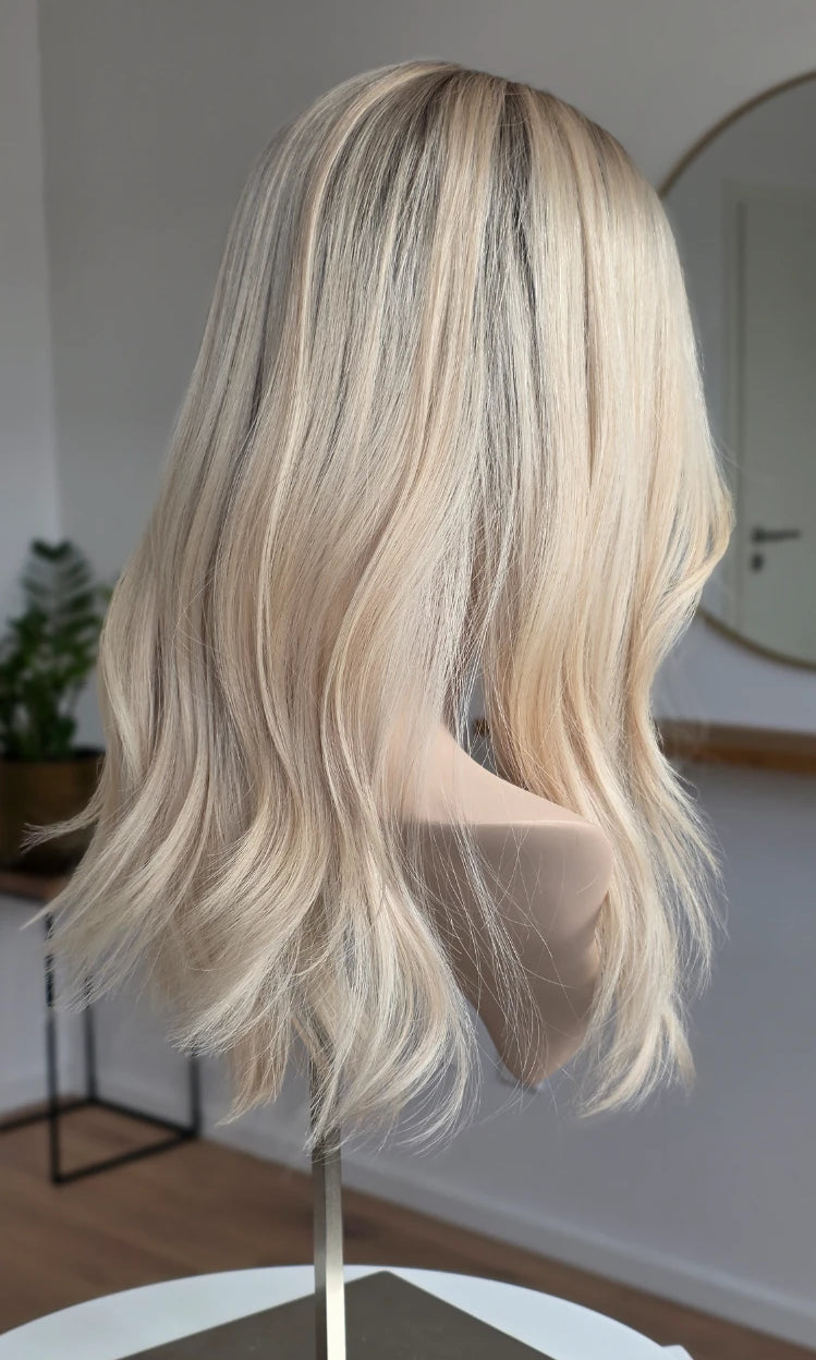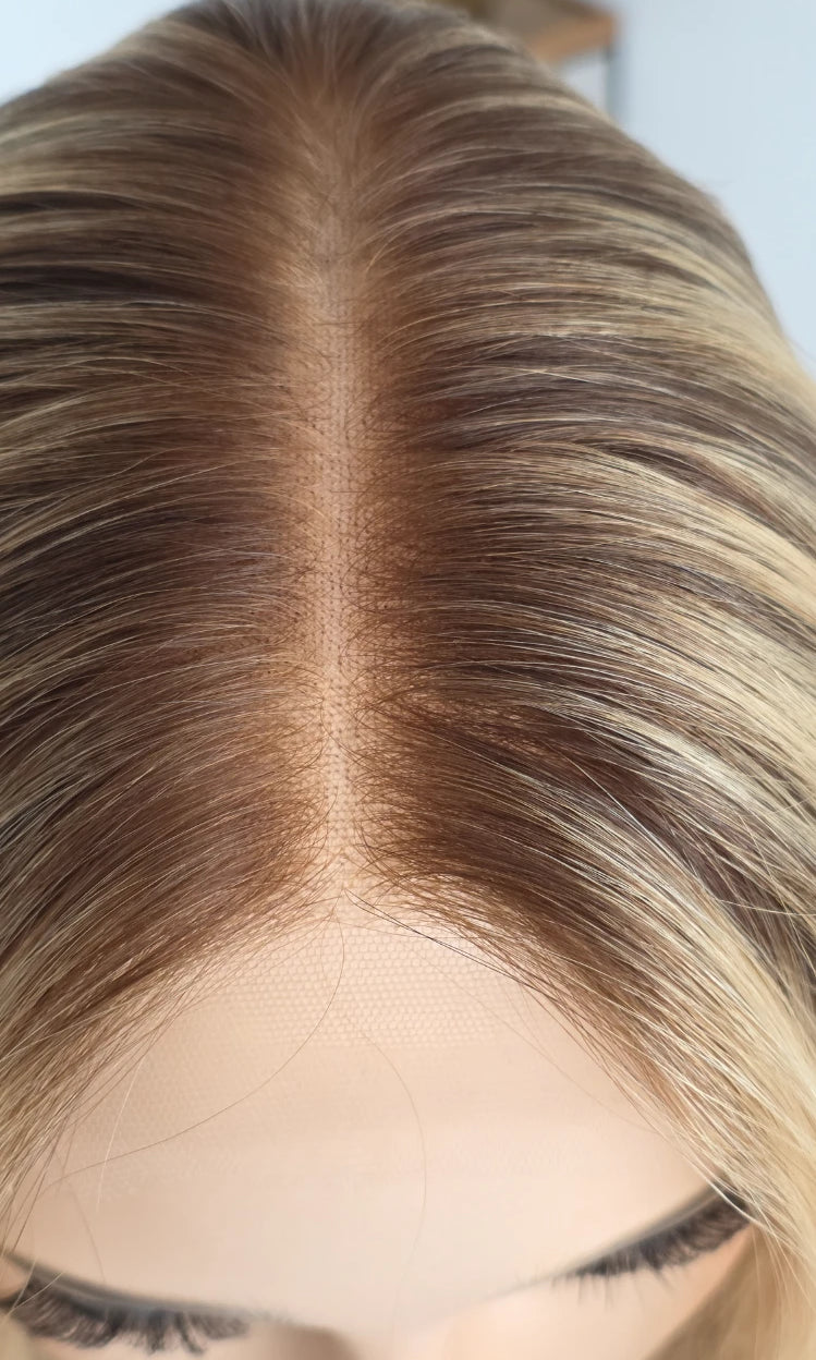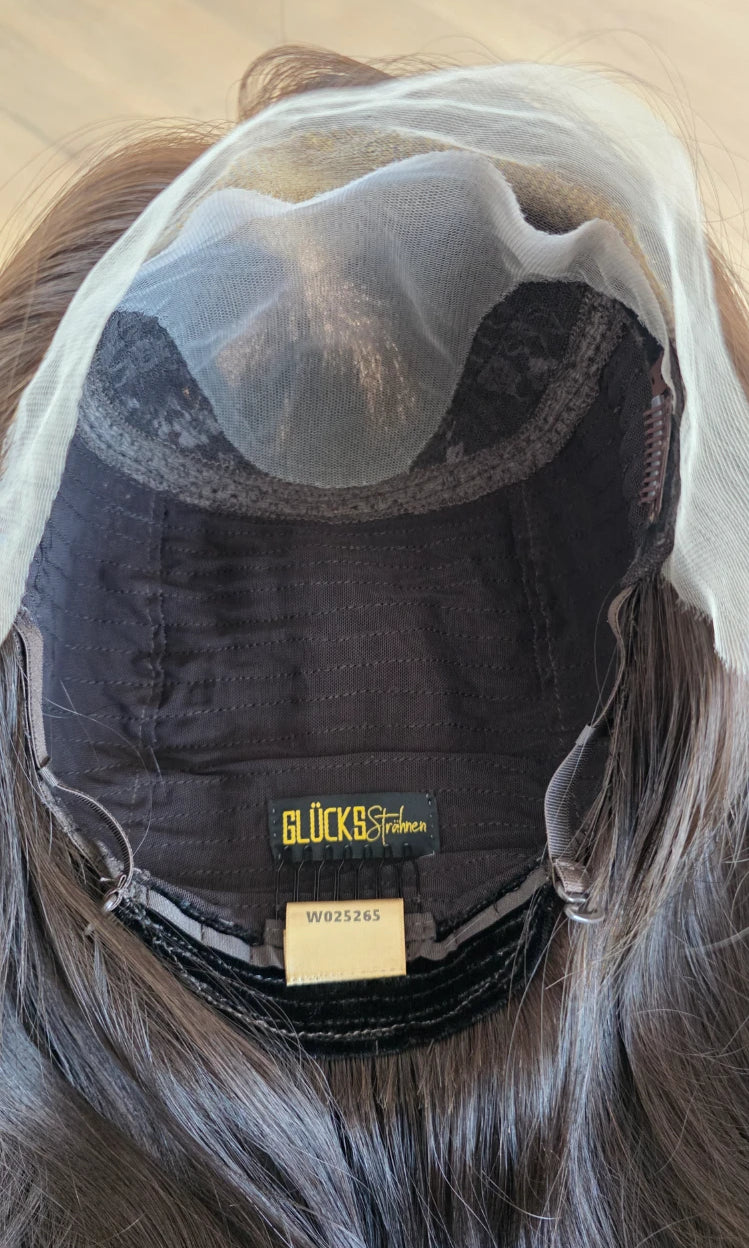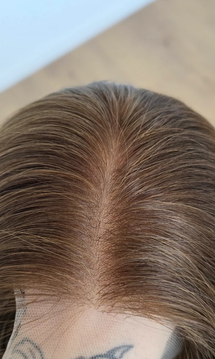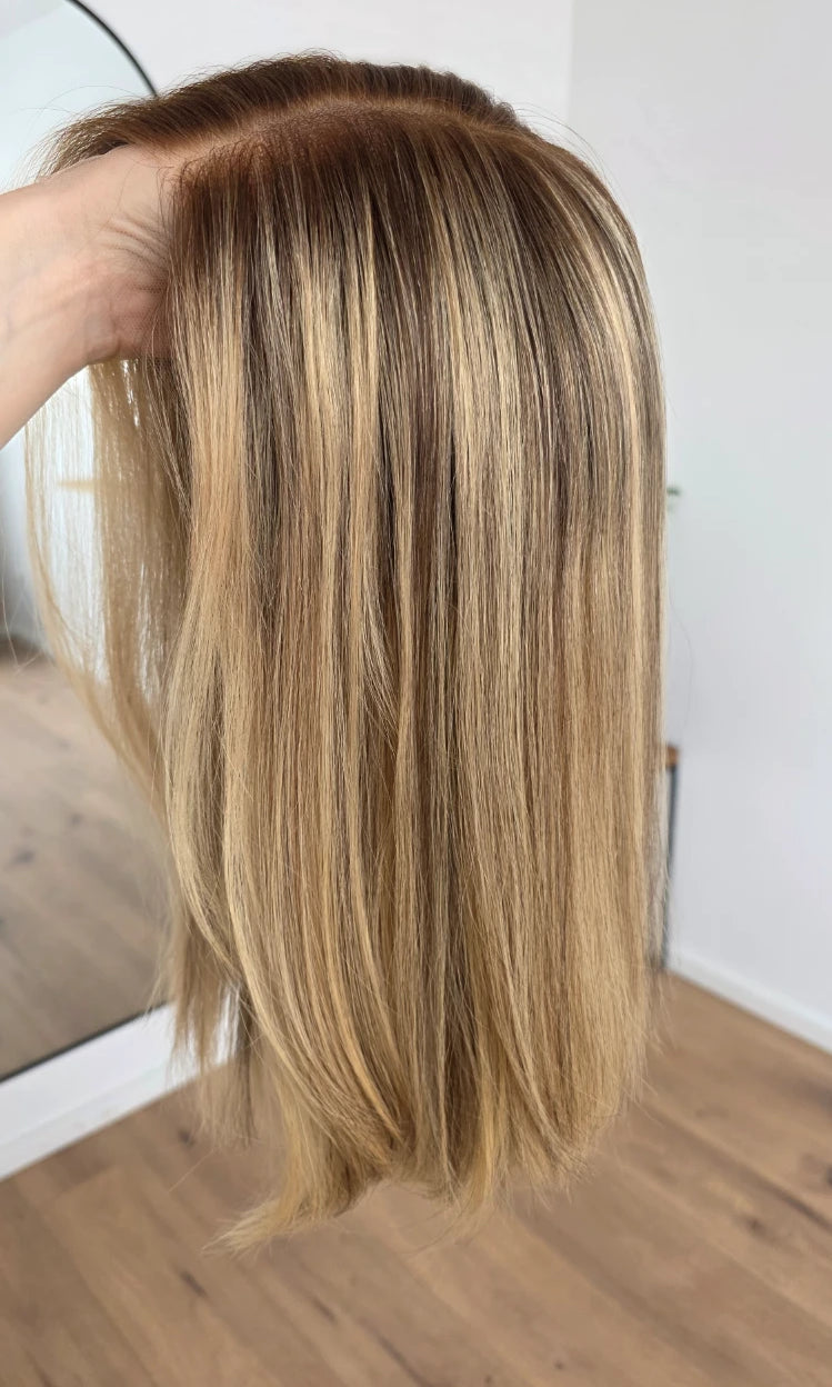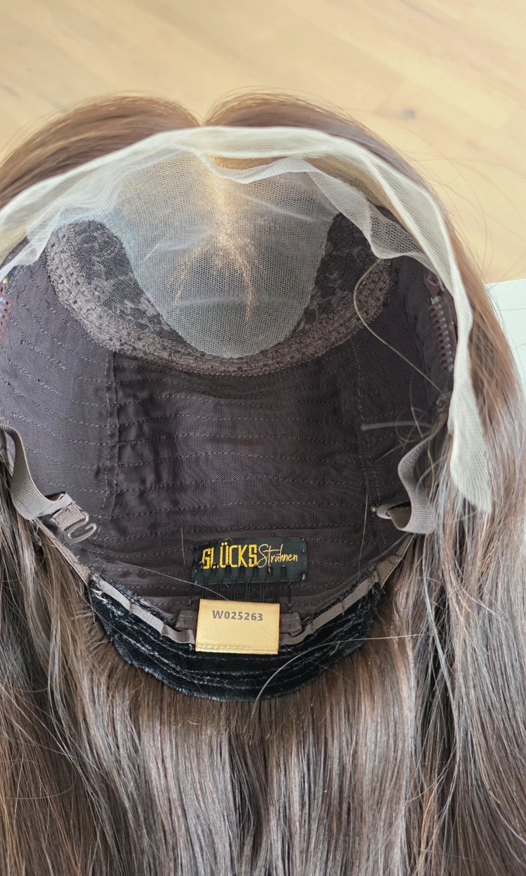 Im oberen Bereich befindet sich das sogenannte Lacetop: Hier werden die Haare ebenfalls einzeln eingeknüpft, was einen realistischen Scheitel und eine natürliche Haarbewegung ermöglicht.