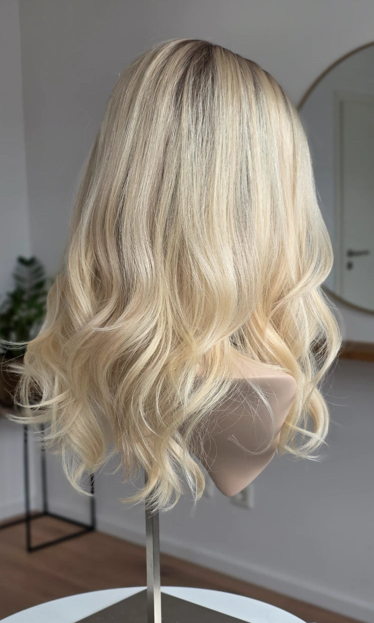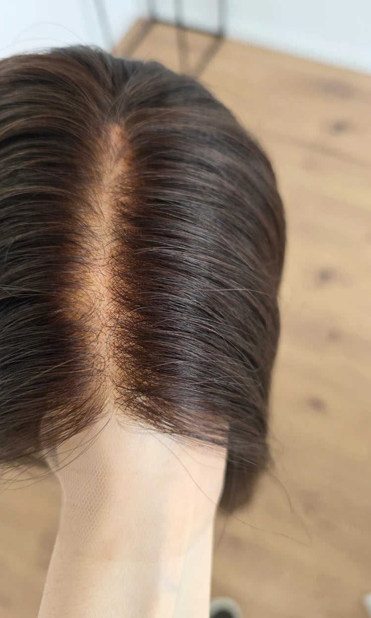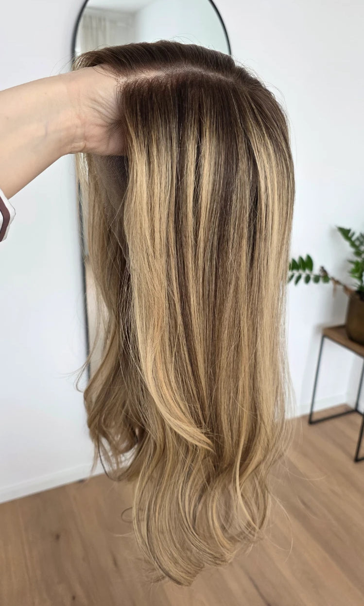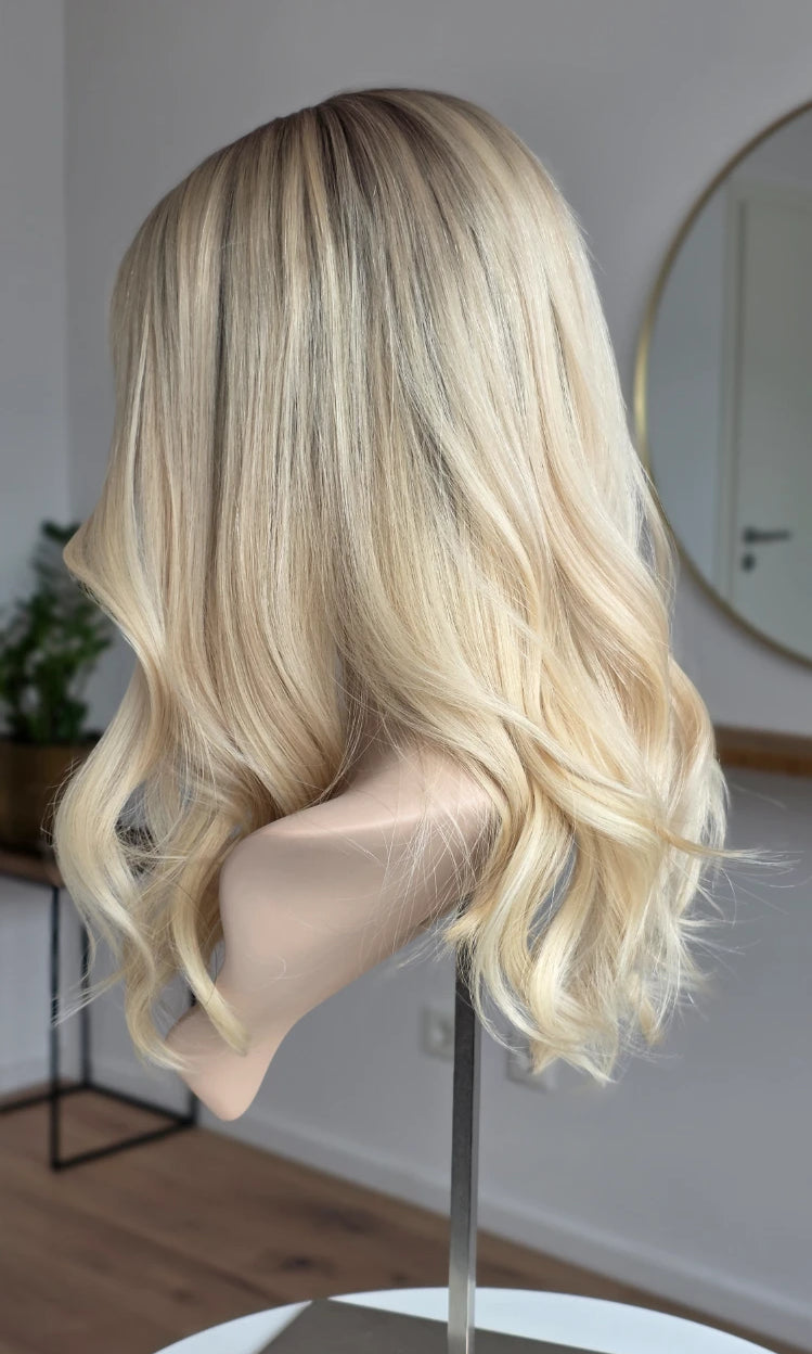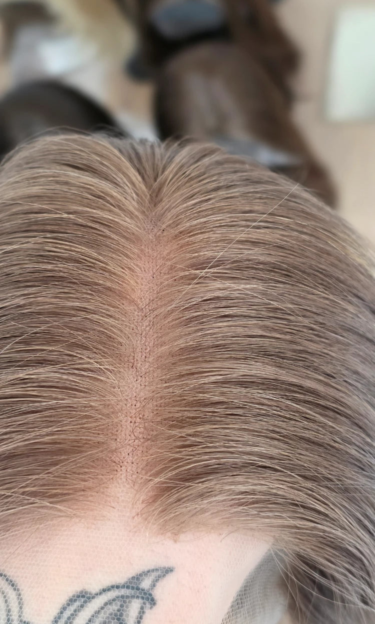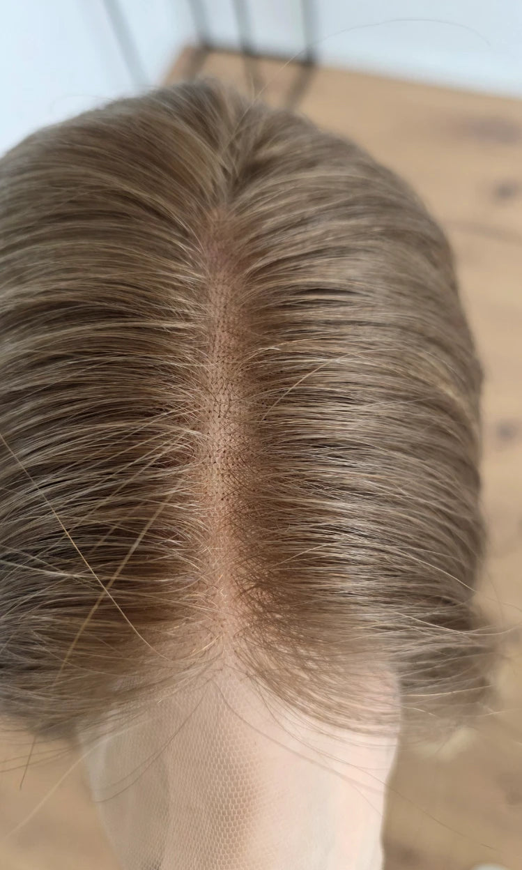 Im oberen Bereich befindet sich das sogenannte Lacetop: Hier werden die Haare ebenfalls einzeln eingeknüpft, was einen realistischen Scheitel und eine natürliche Haarbewegung ermöglicht.