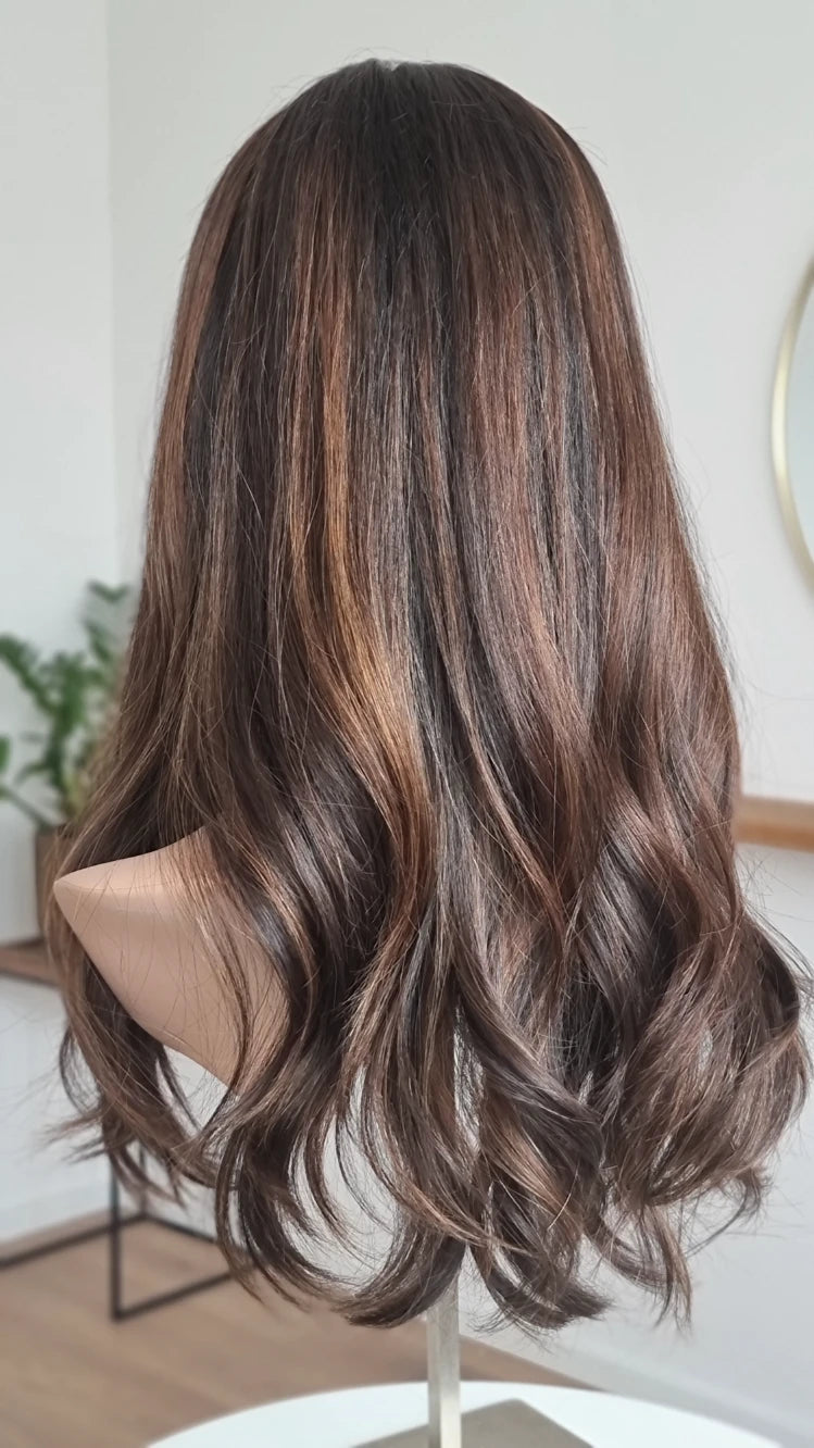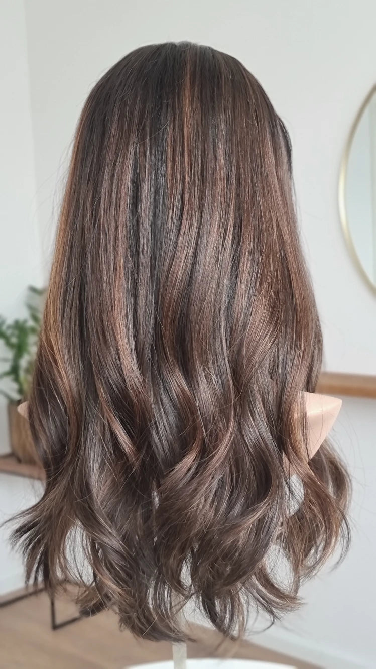 - Farbe Ansatz neutrales Dunkelbraun mit Balayage zu warmem Mittelbraun