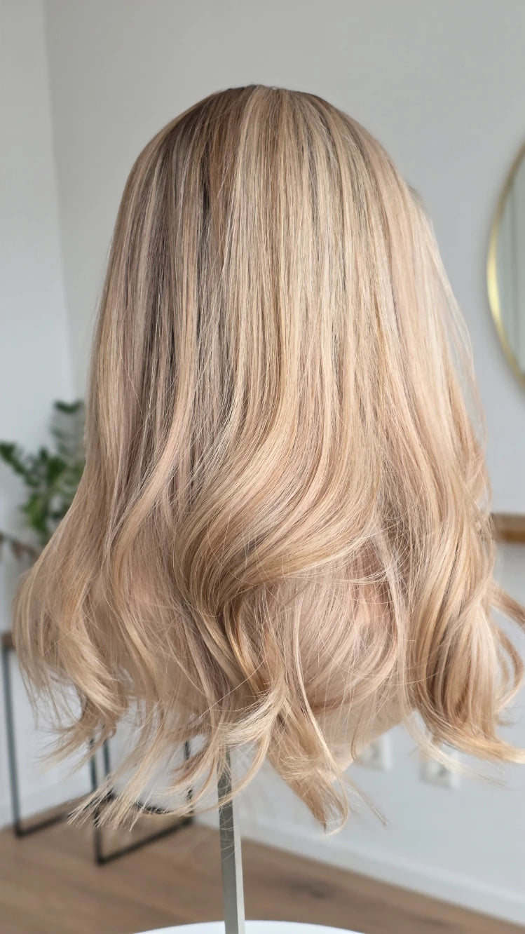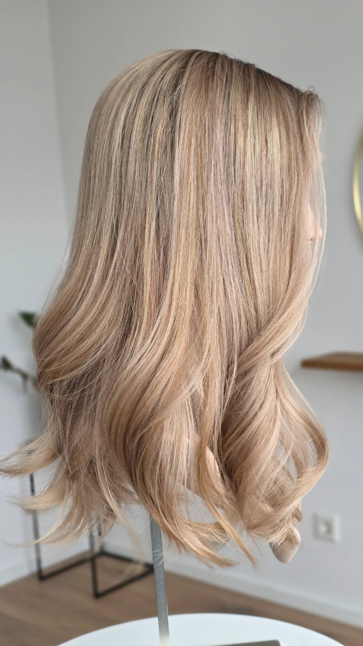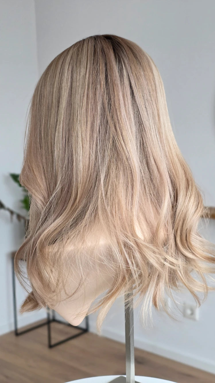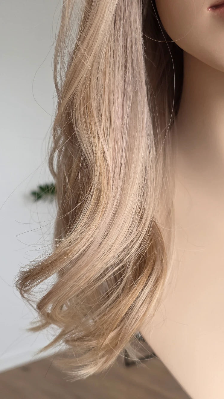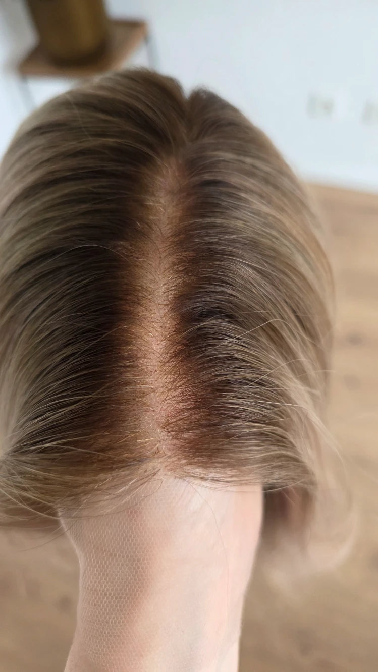 Die Knoten sind gebleicht, können allerdings nur bis zu einem gewissen Punkt blondiert werden, ohne die Integrität der Perücke zu gefährden. Da Haar ein Naturprodukt ist und somit natürlichen Schwankungen unterliegt, lassen sich manche Knoten besser aufhellen als andere. Sollten die Knoten nicht ganz aufgehellt werden können, kannst du sie mit hellem Puder oder unserem Perückenstift kaschieren.