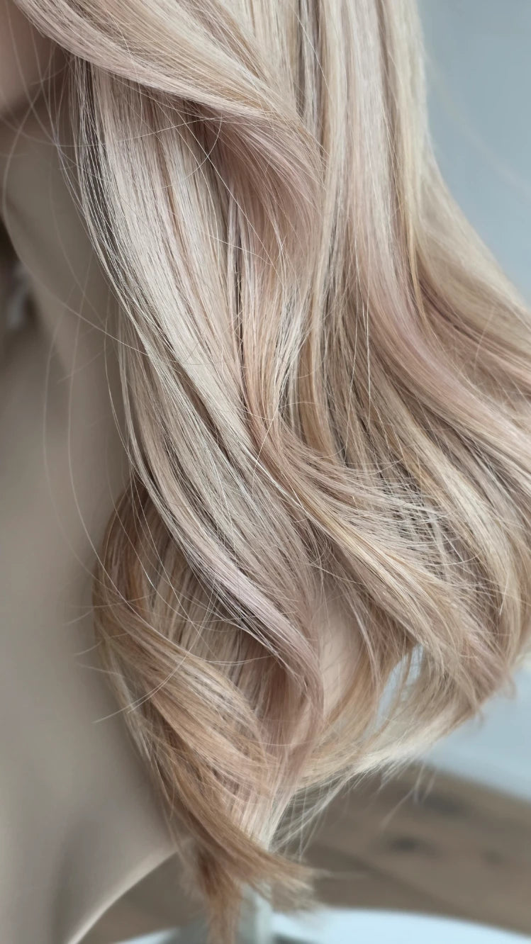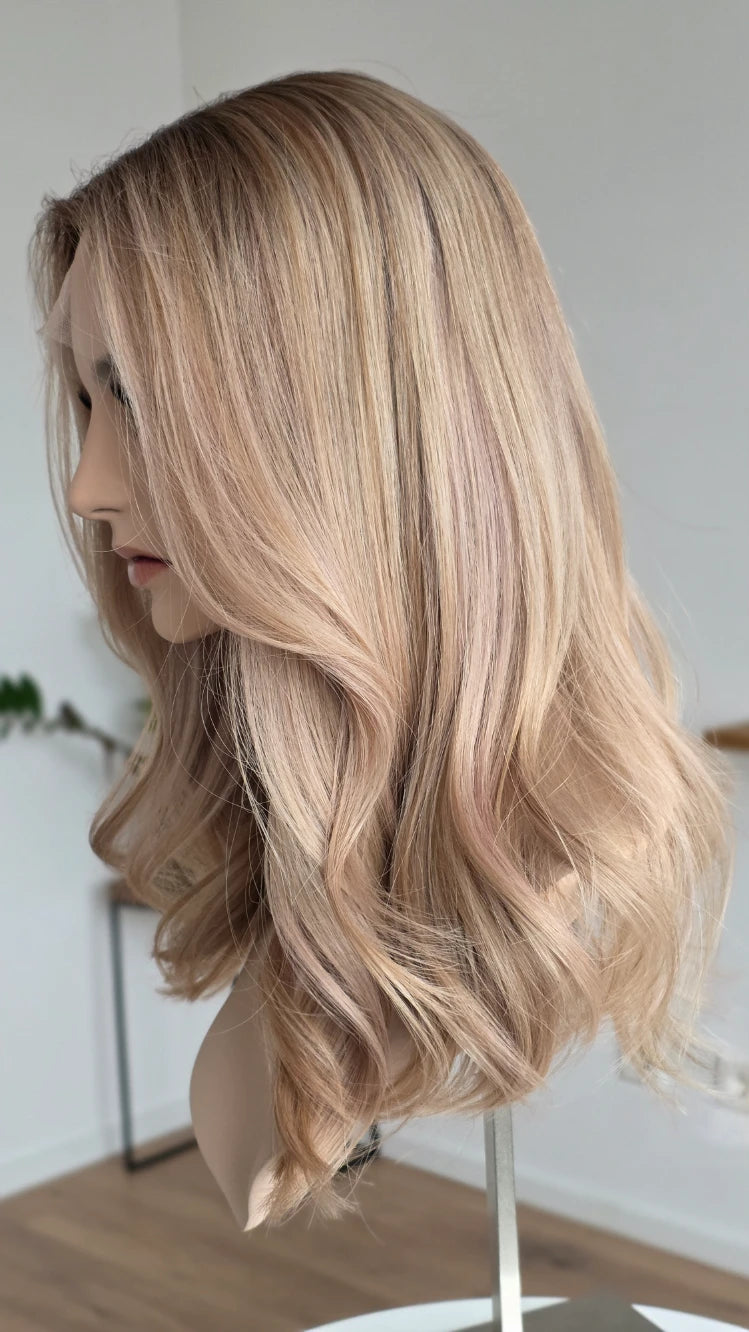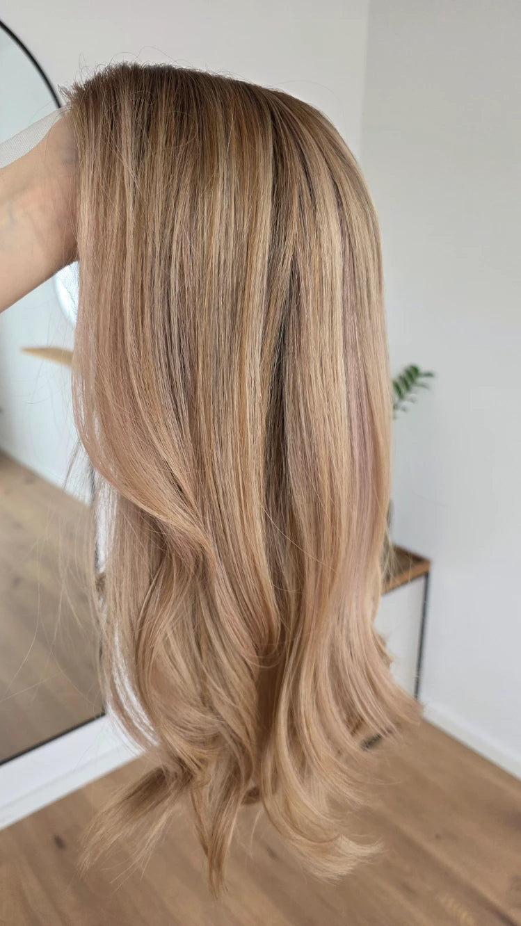 - Farbe Ansatz Hellbraun, Längen hellblond mit Lowlights mit zarten rosafarbenen Highlights
