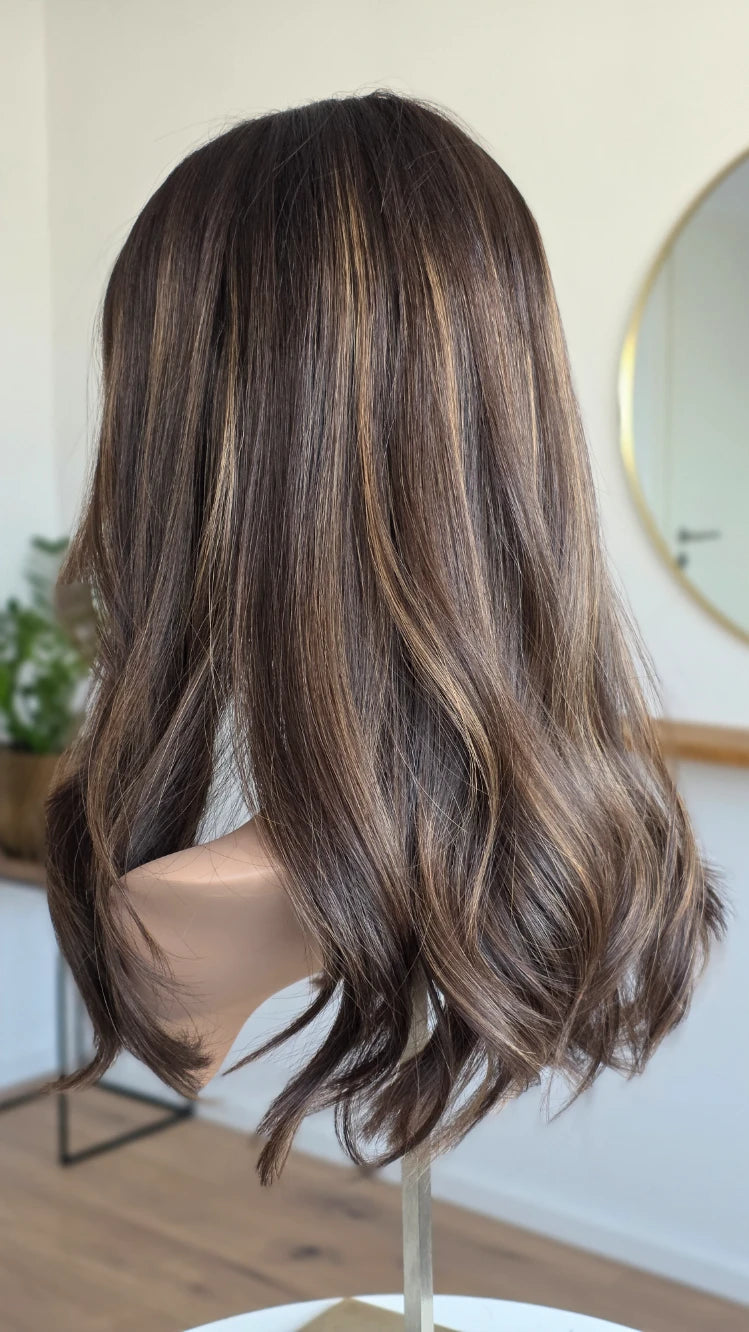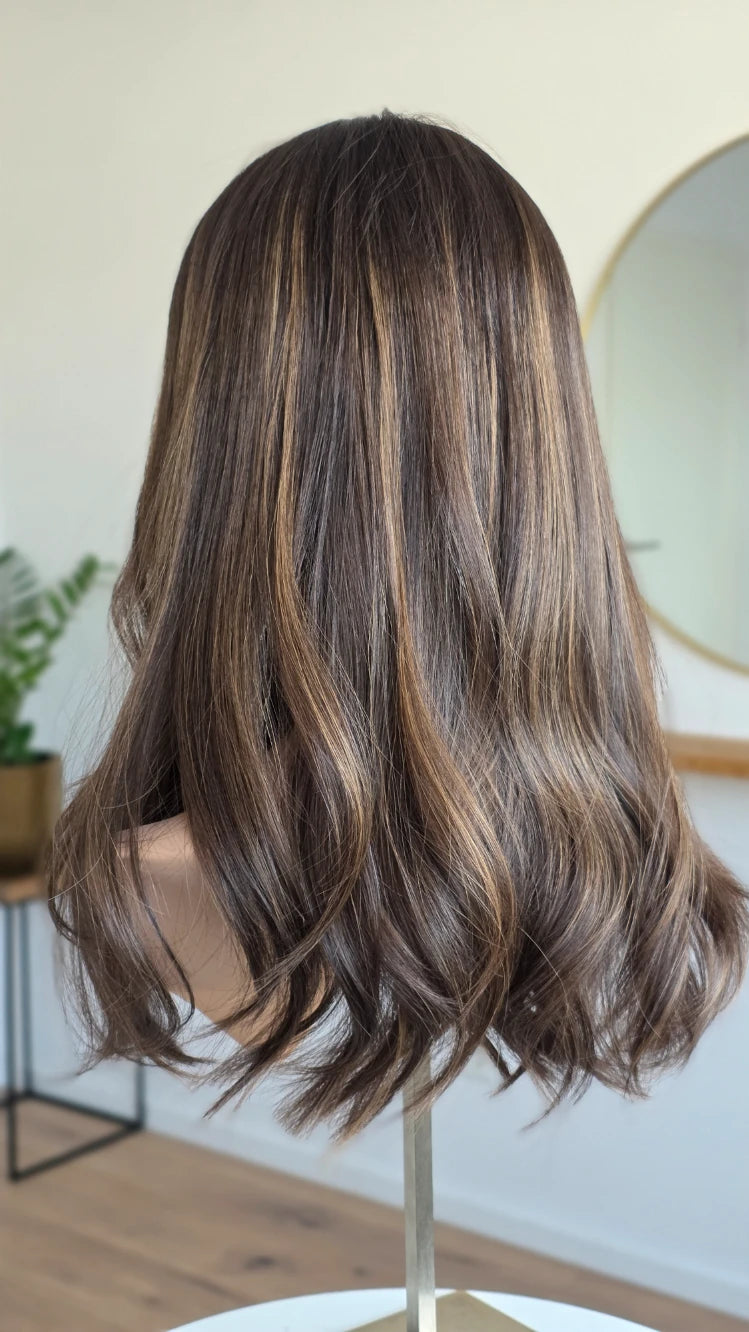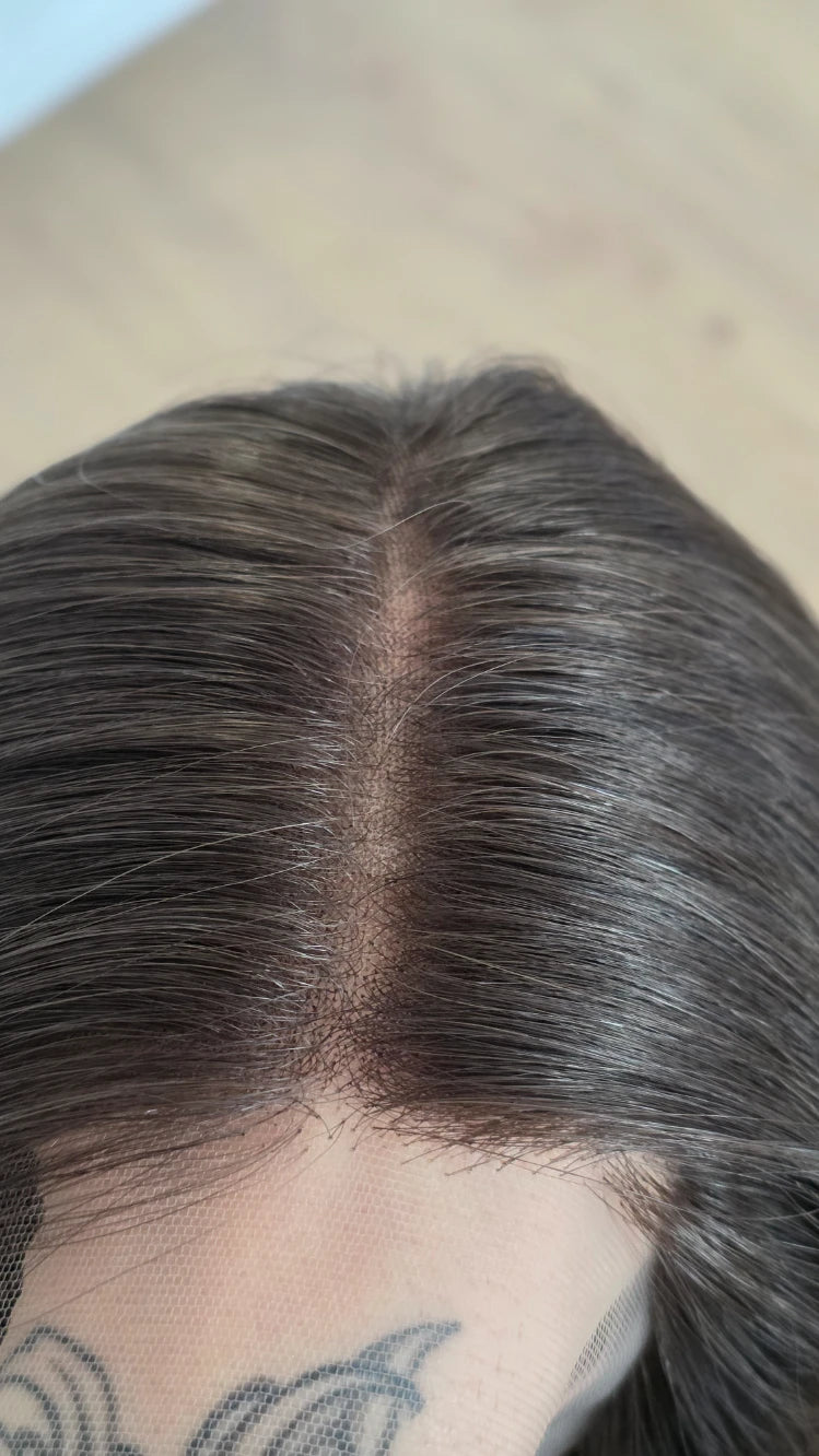 Die Knoten sind gebleicht, können allerdings nur bis zu einem gewissen Punkt blondiert werden, ohne die Integrität der Perücke zu gefährden. Da Haar ein Naturprodukt ist und somit natürlichen Schwankungen unterliegt, lassen sich manche Knoten besser aufhellen als andere. Sollten die Knoten nicht ganz aufgehellt werden können, kannst du sie mit hellem Puder oder unserem Perückenstift kaschieren.