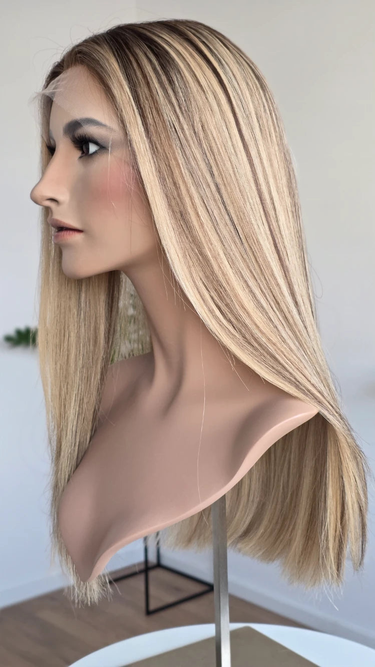 • Farbe Ansatz neutrales Mittelbraun, Längen multidimensionales Blond