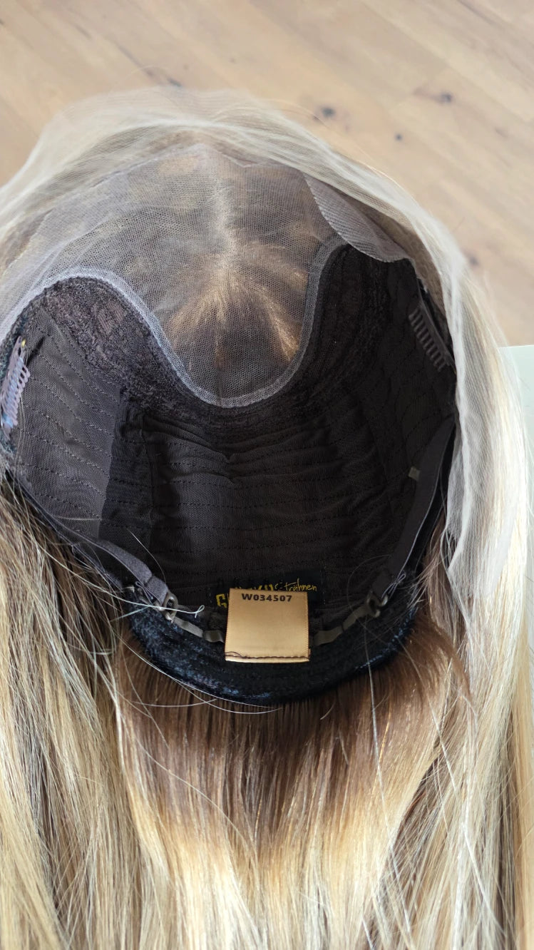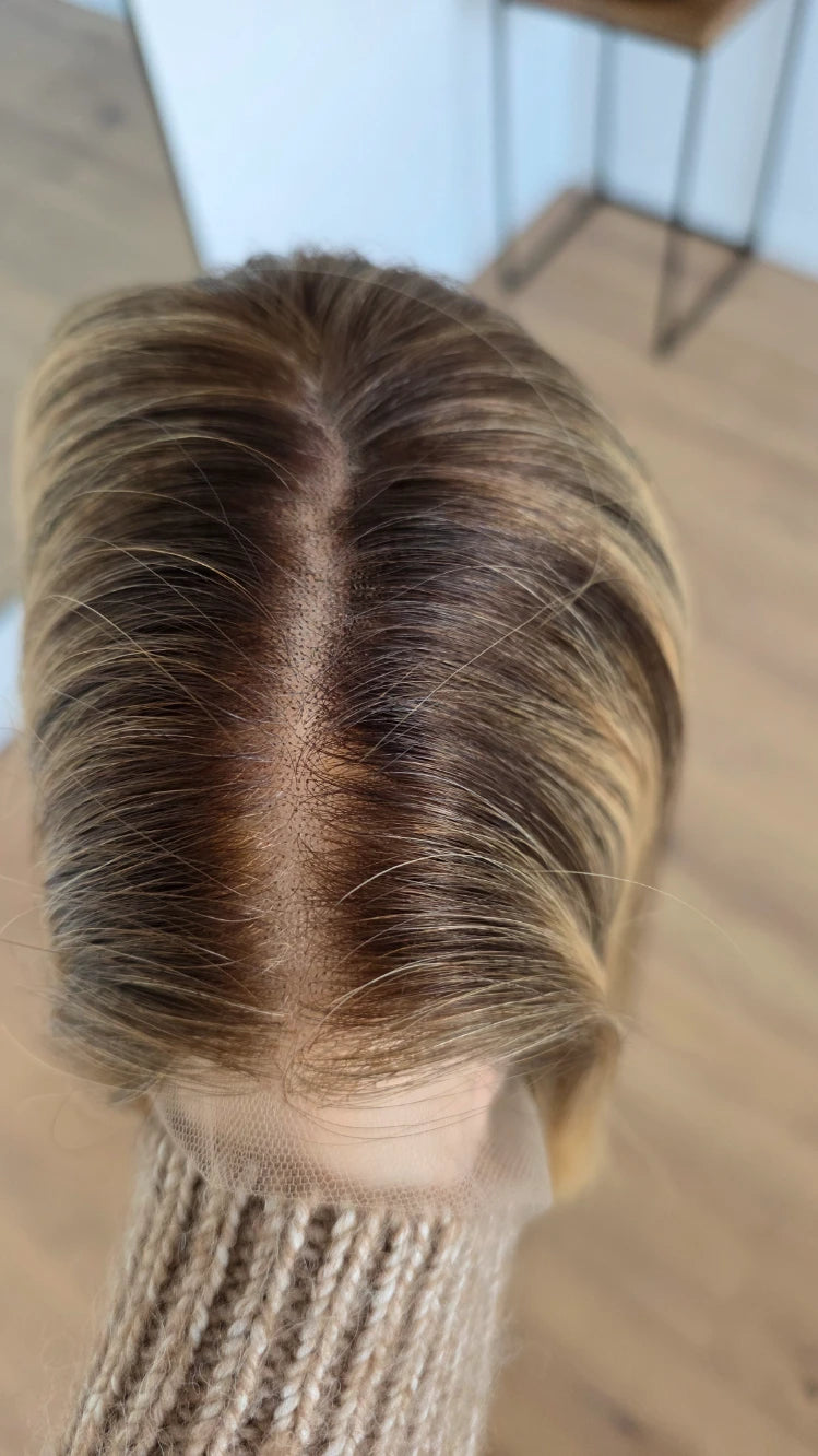 Die Knoten sind gebleicht, können allerdings nur bis zu einem gewissen Punkt blondiert werden, ohne die Integrität der Perücke zu gefährden. Da Haar ein Naturprodukt ist und somit natürlichen Schwankungen unterliegt, lassen sich manche Knoten besser aufhellen als andere. Sollten die Knoten nicht ganz aufgehellt werden können, kannst du sie mit hellem Puder oder unserem Perückenstift kaschieren.