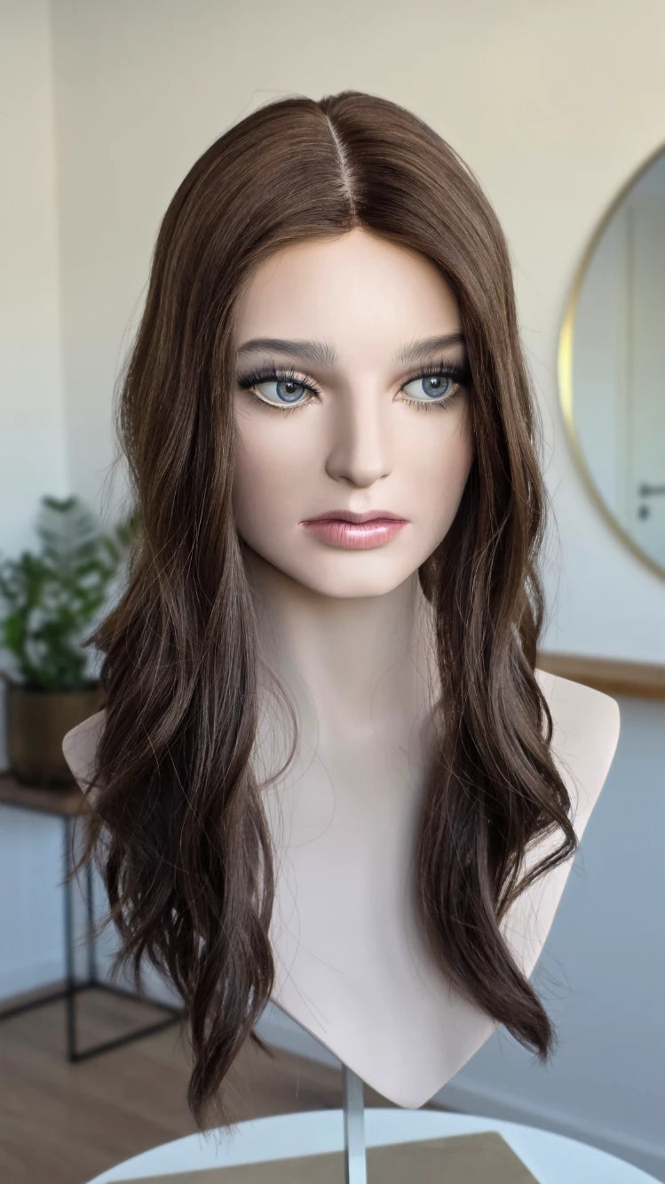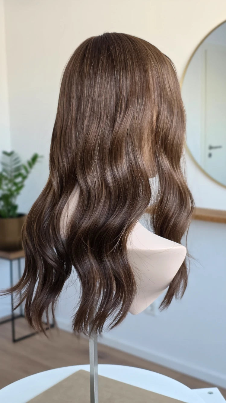 Dein eigenes Haar ist schulterlang oder kürzer? Dann solltest du keinen Topper wählen, der mehr als 5 cm länger ist. Bei dieser Länge vermischen sich das Eigen- und Topperhaar nicht optimal und es kommt zu einer deutlich sichtbaren Stufe. Das beeinträchtigt den Realismus sehr und führt zu keinem schönen Ergebnis. Bitte wähle dann einen Topper, der gleich lang oder bis zu 5 cm länger ist.