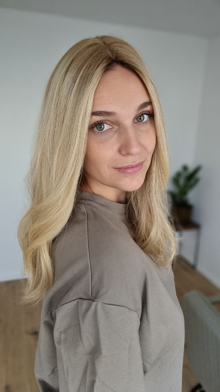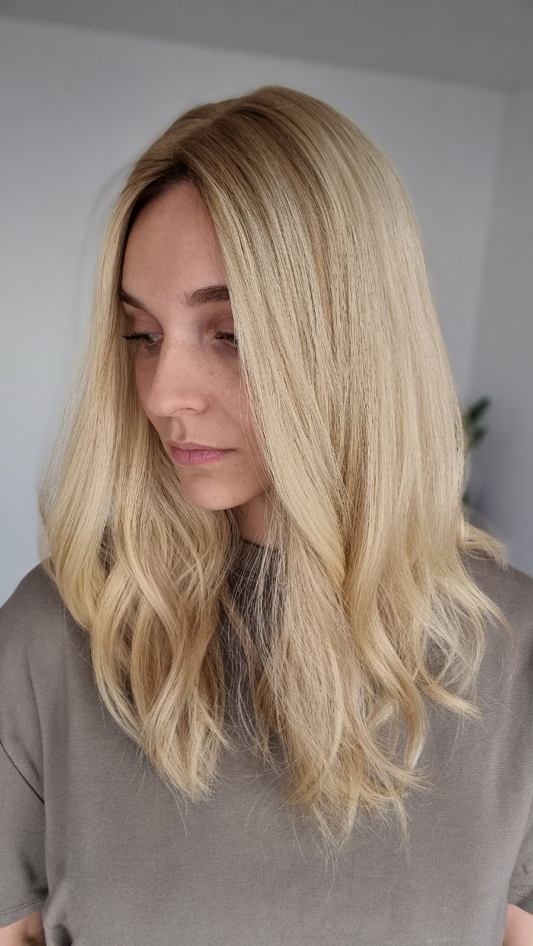 - Farbe Ansatz warmes Mittelblond, Längen Hellblond mit Lowlights