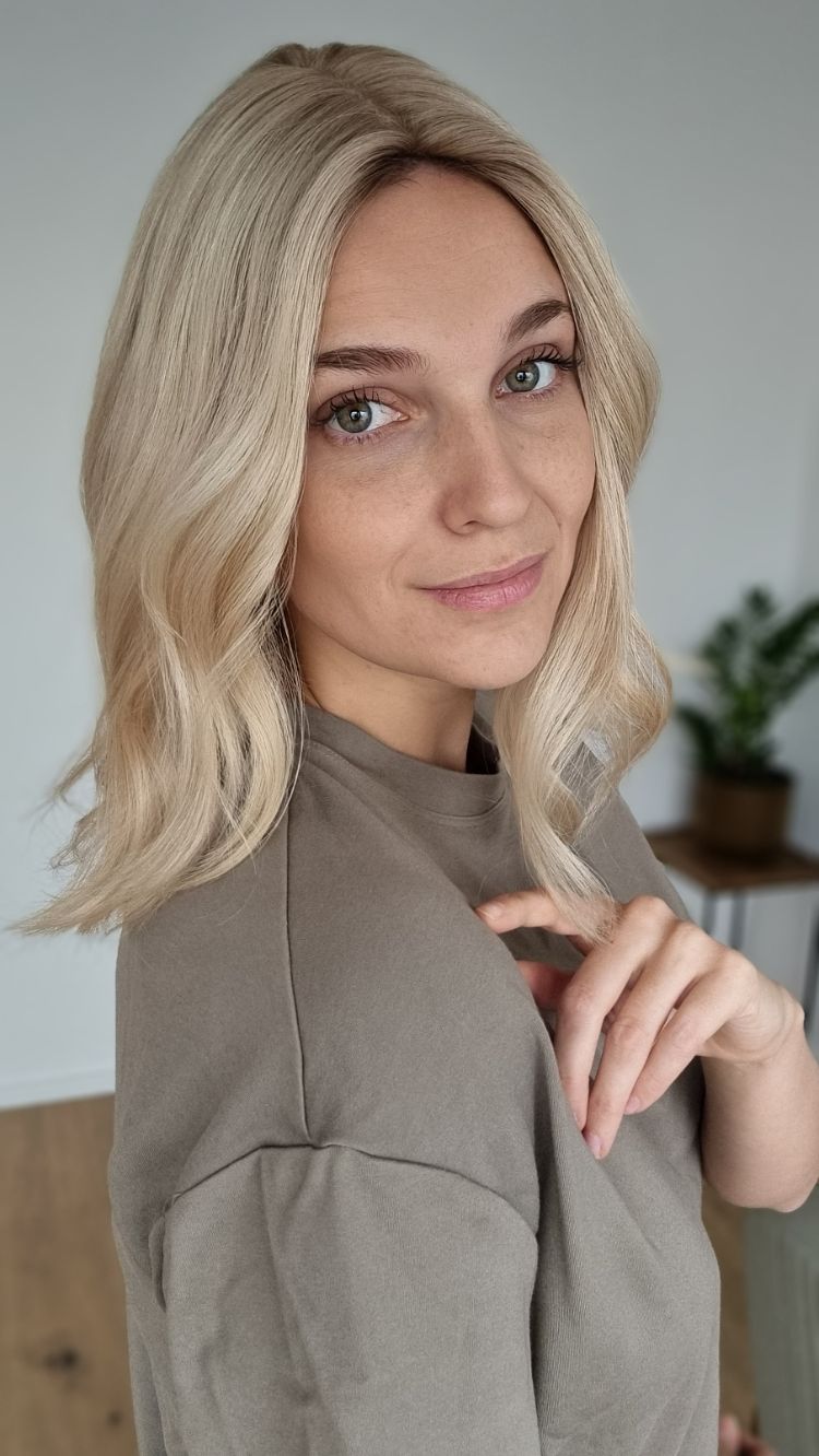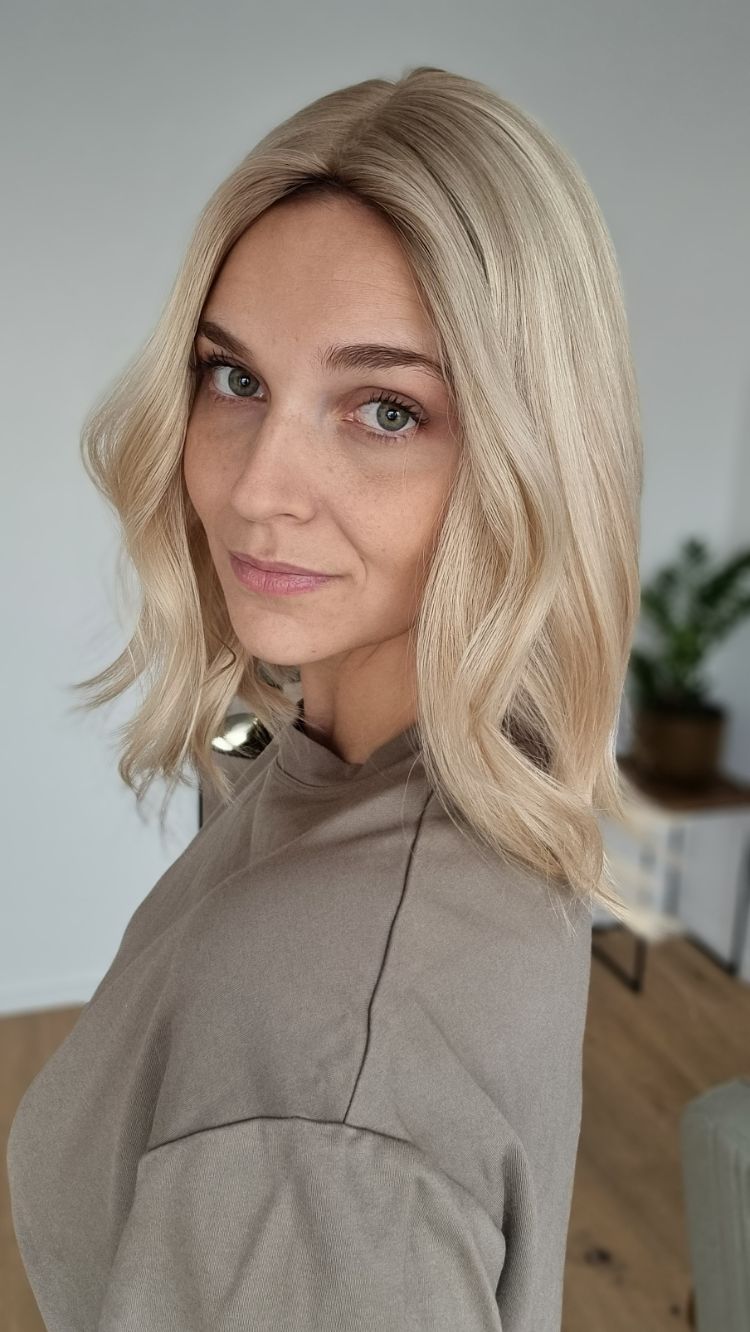 - Farbe Ansatz aschiges Mittelblond, Längen helles Blond mit subtilen Lowlights