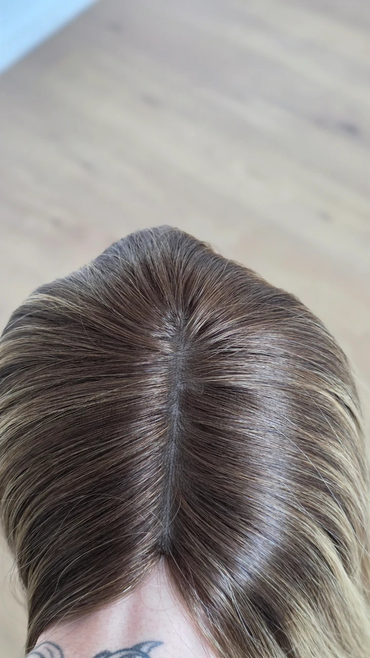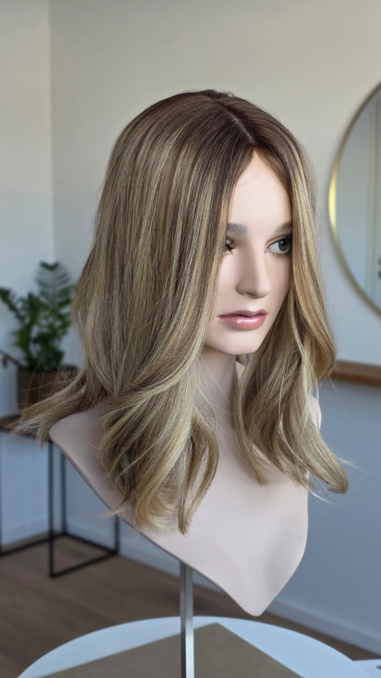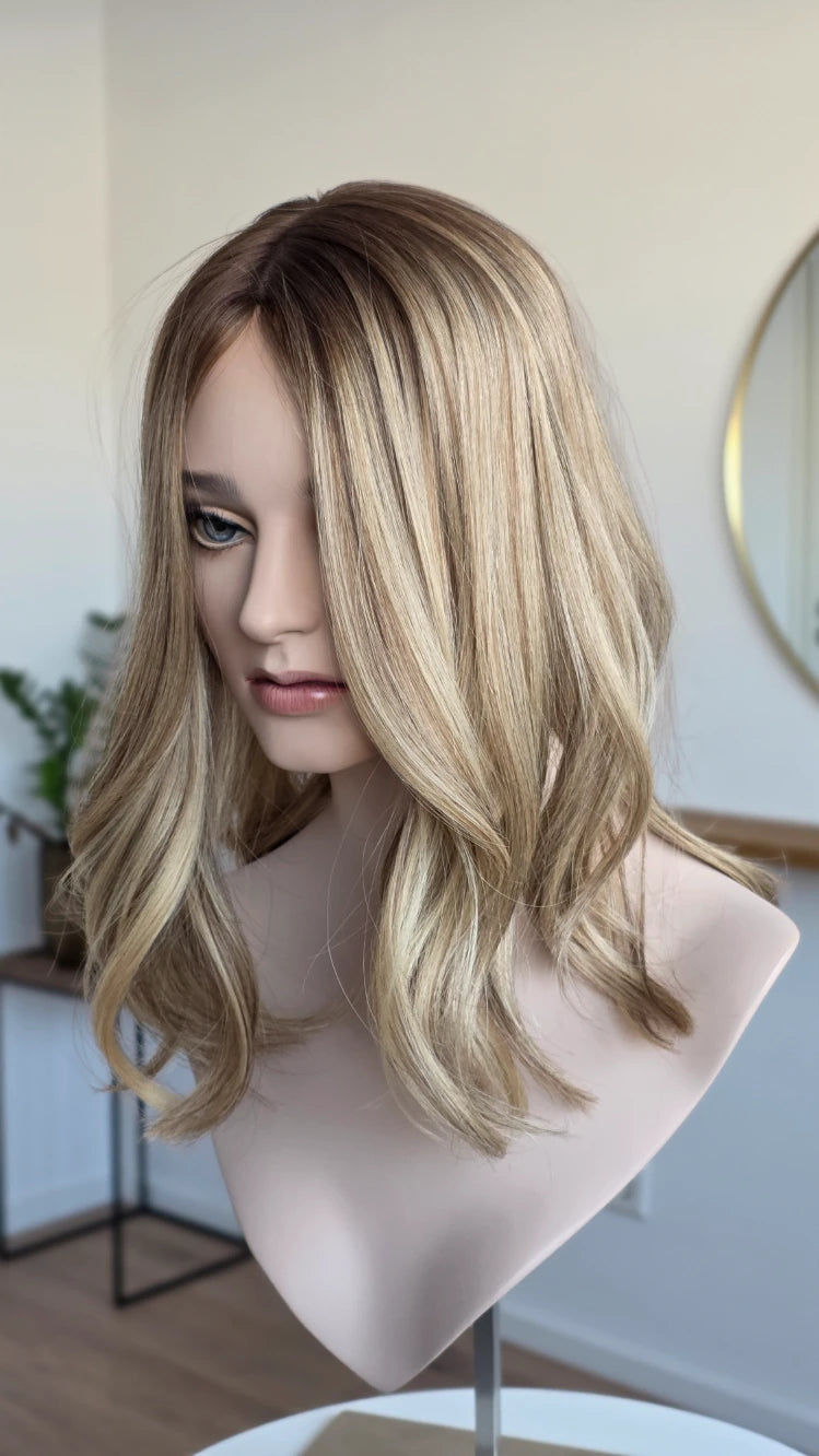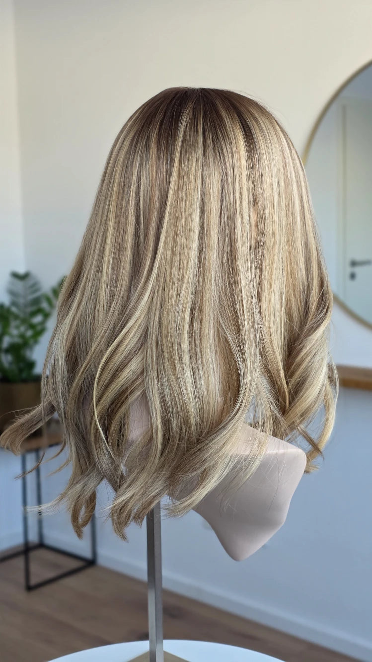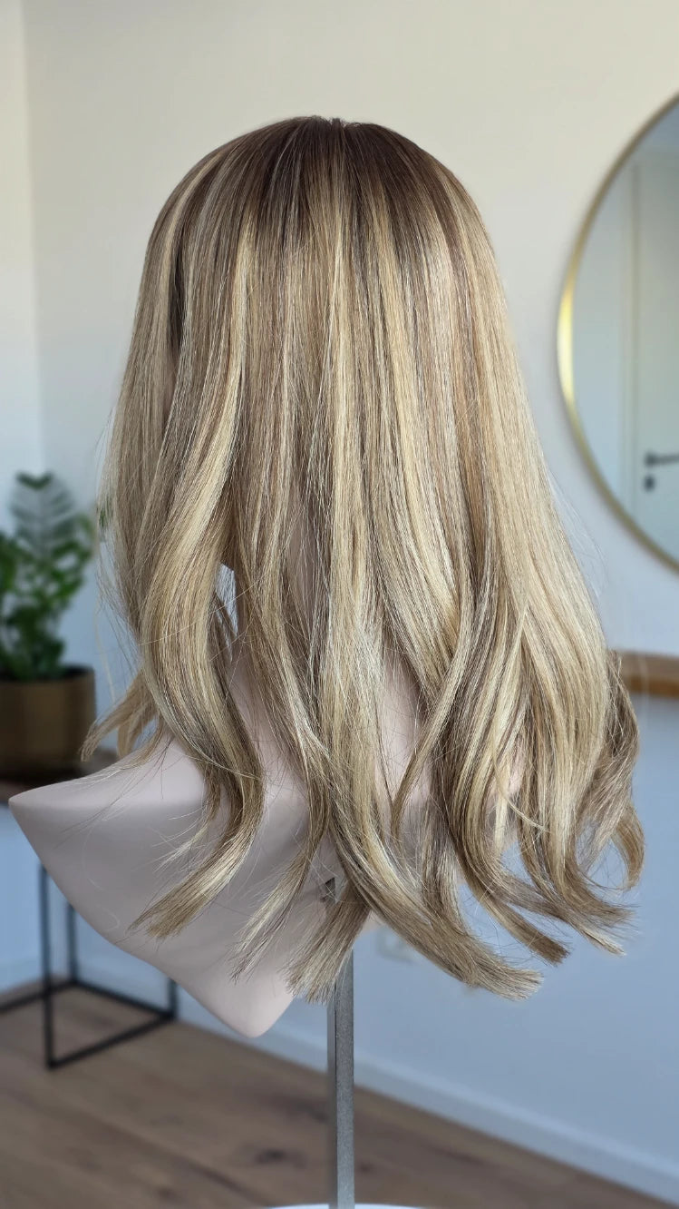 - Farbe Ansatz neutrales Mittelbraun, Längen multidimensionales Blond