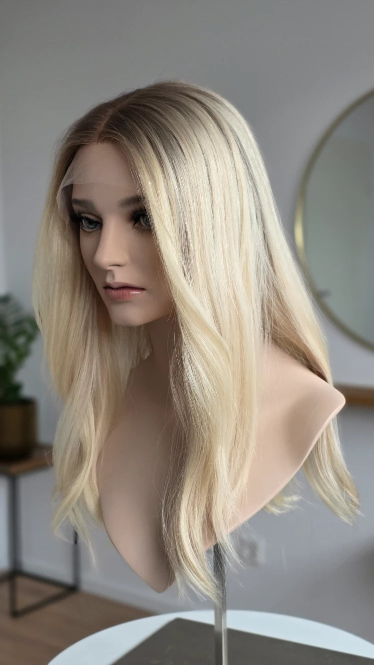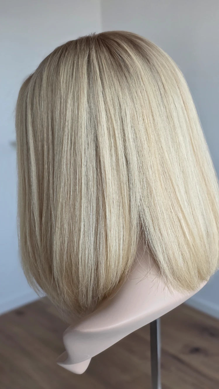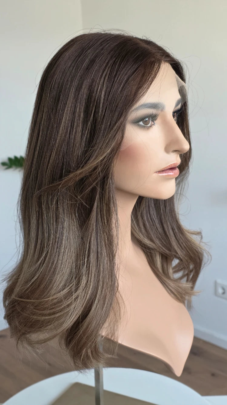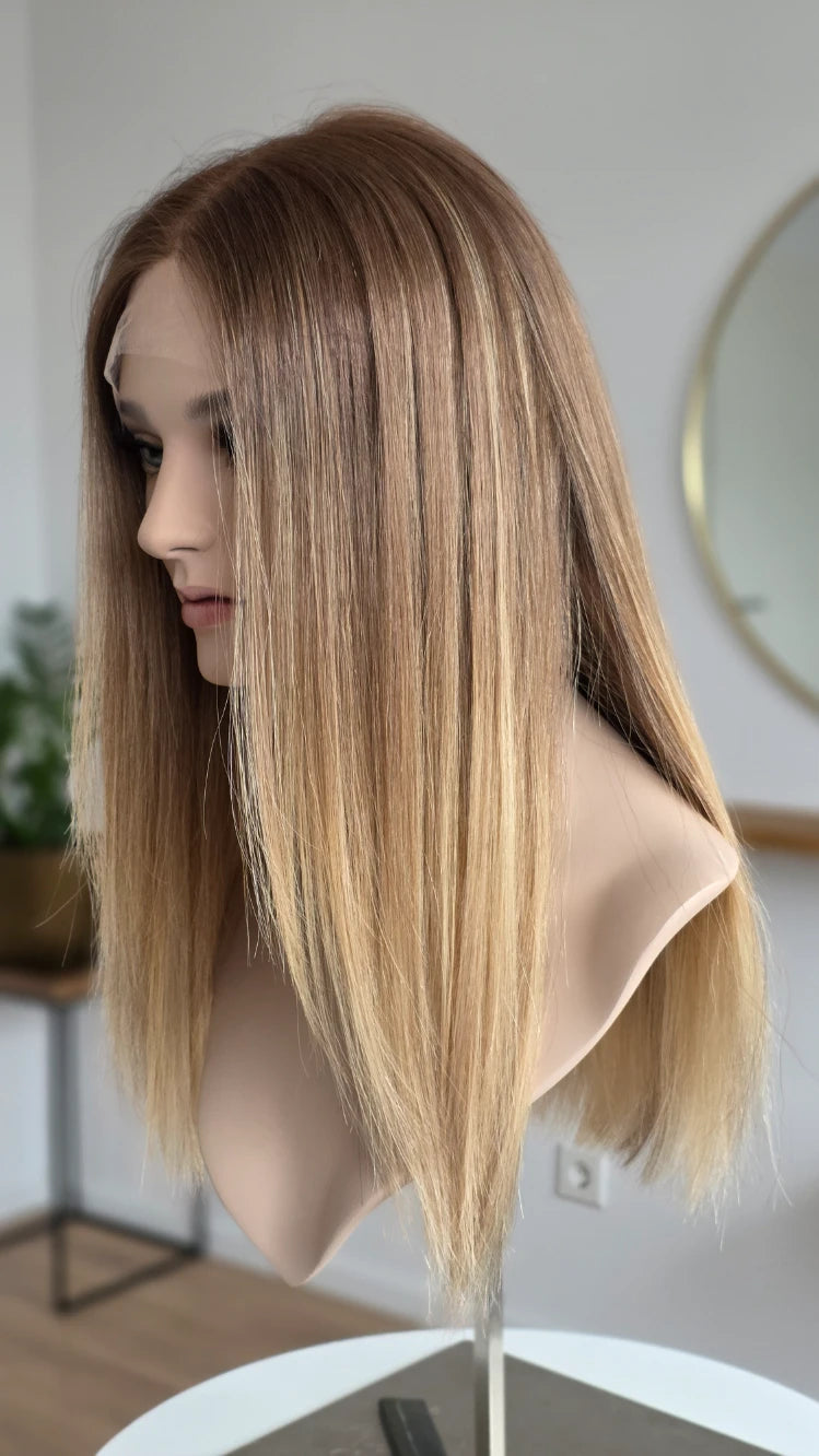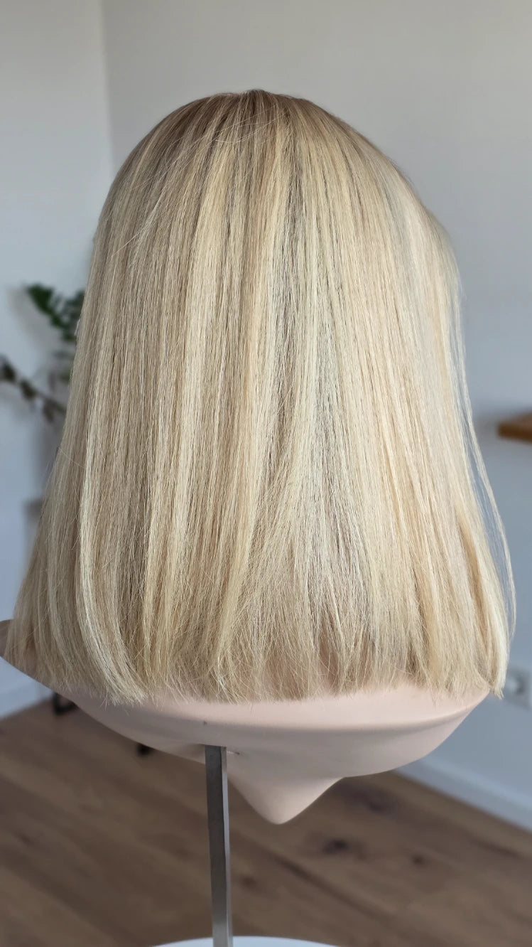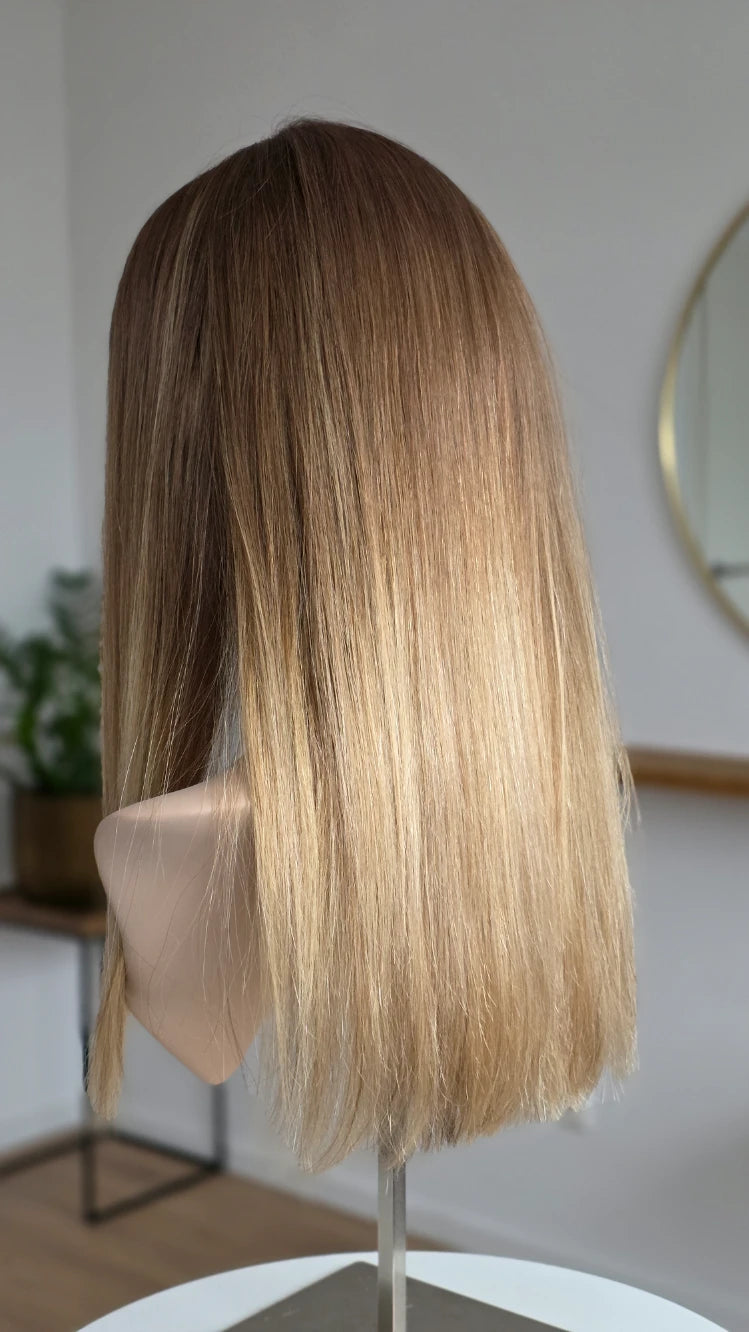Eine Perücke bedeckt den gesamten Kopf und besteht aus verschiedenen Verarbeitungstechnicken, die gemeinsam für ein natürliches Aussehen sorgen.