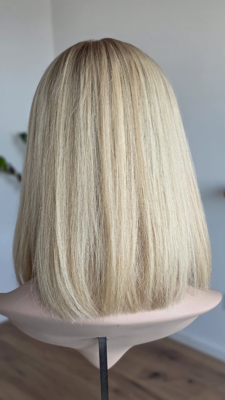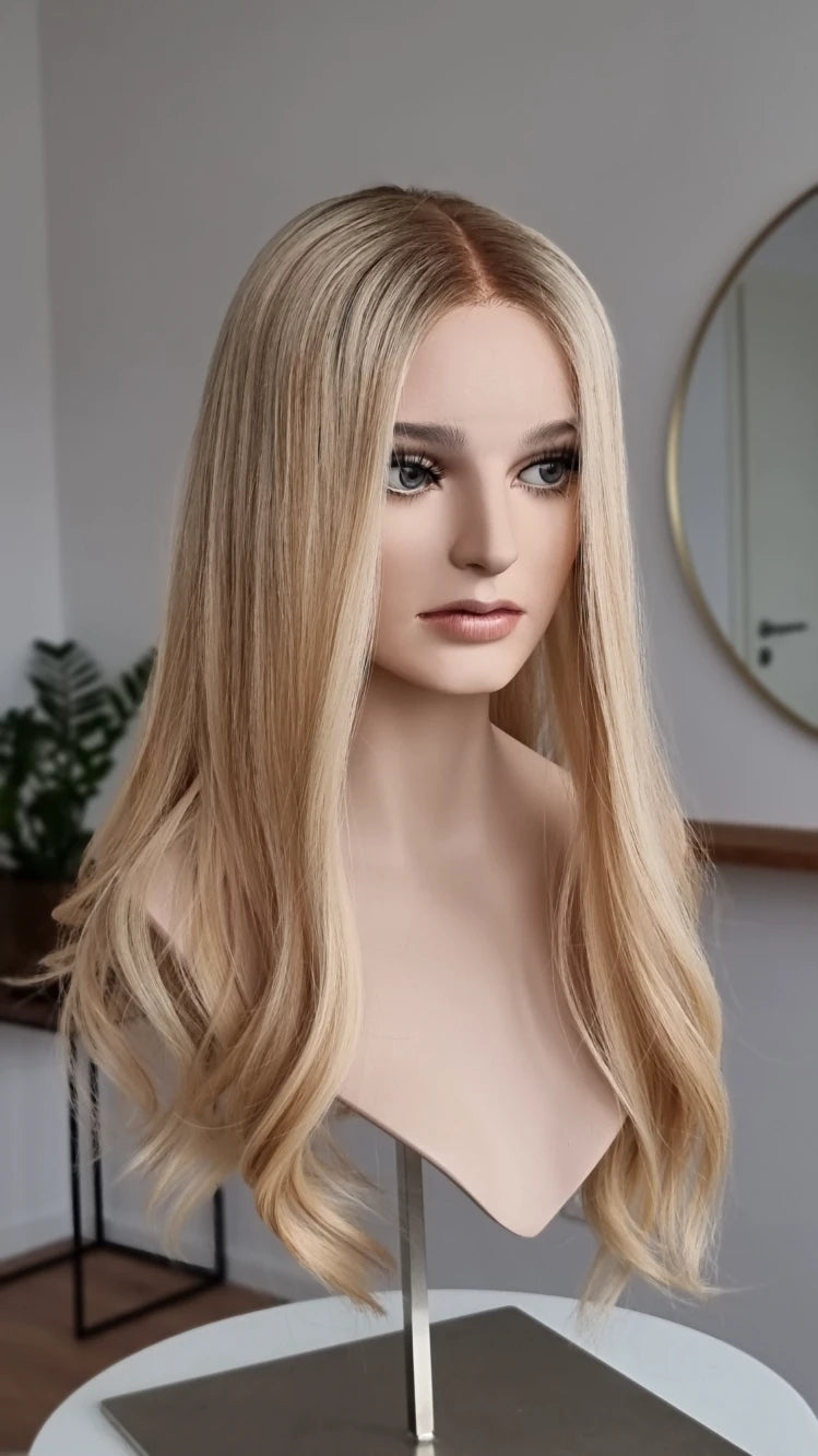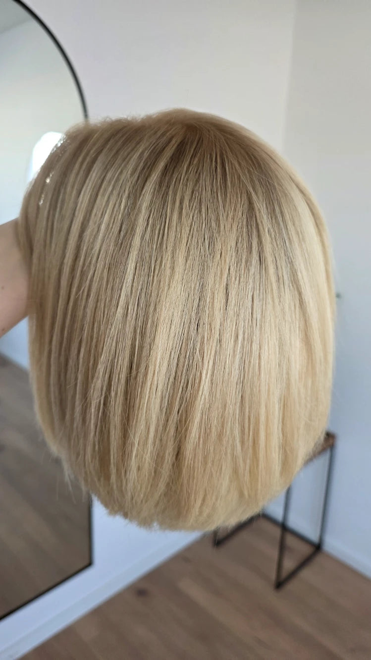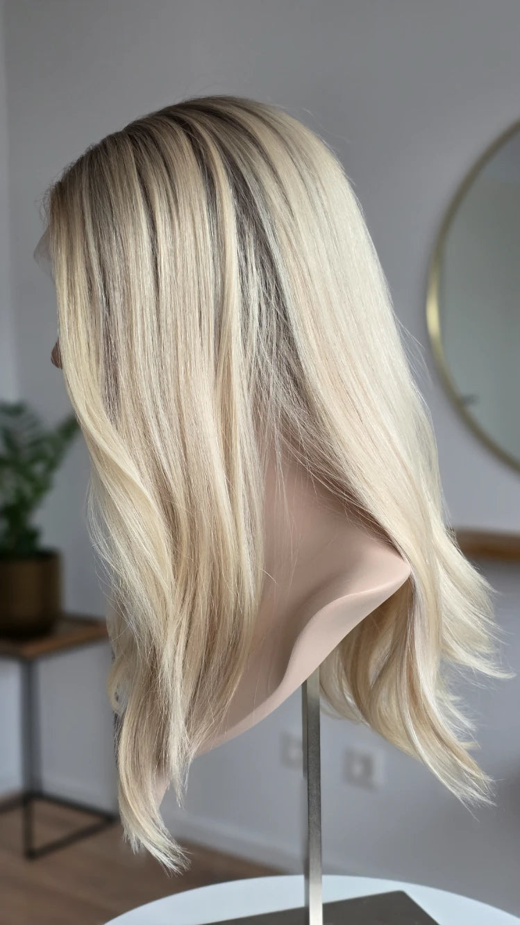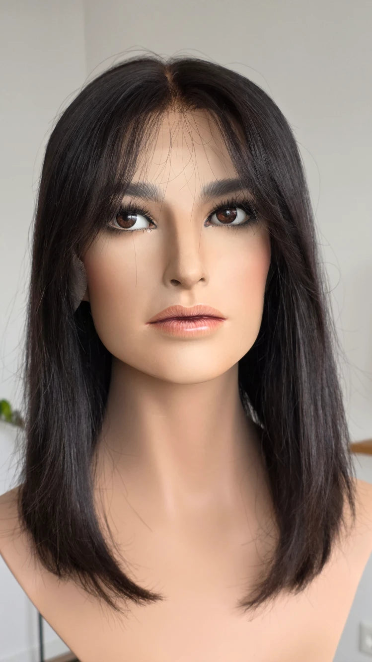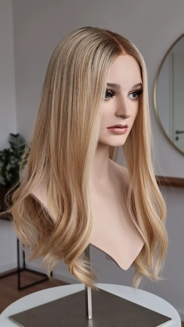 Eine Perücke bedeckt den gesamten Kopf und besteht aus verschiedenen Verarbeitungstechnicken, die gemeinsam für ein natürliches Aussehen sorgen.