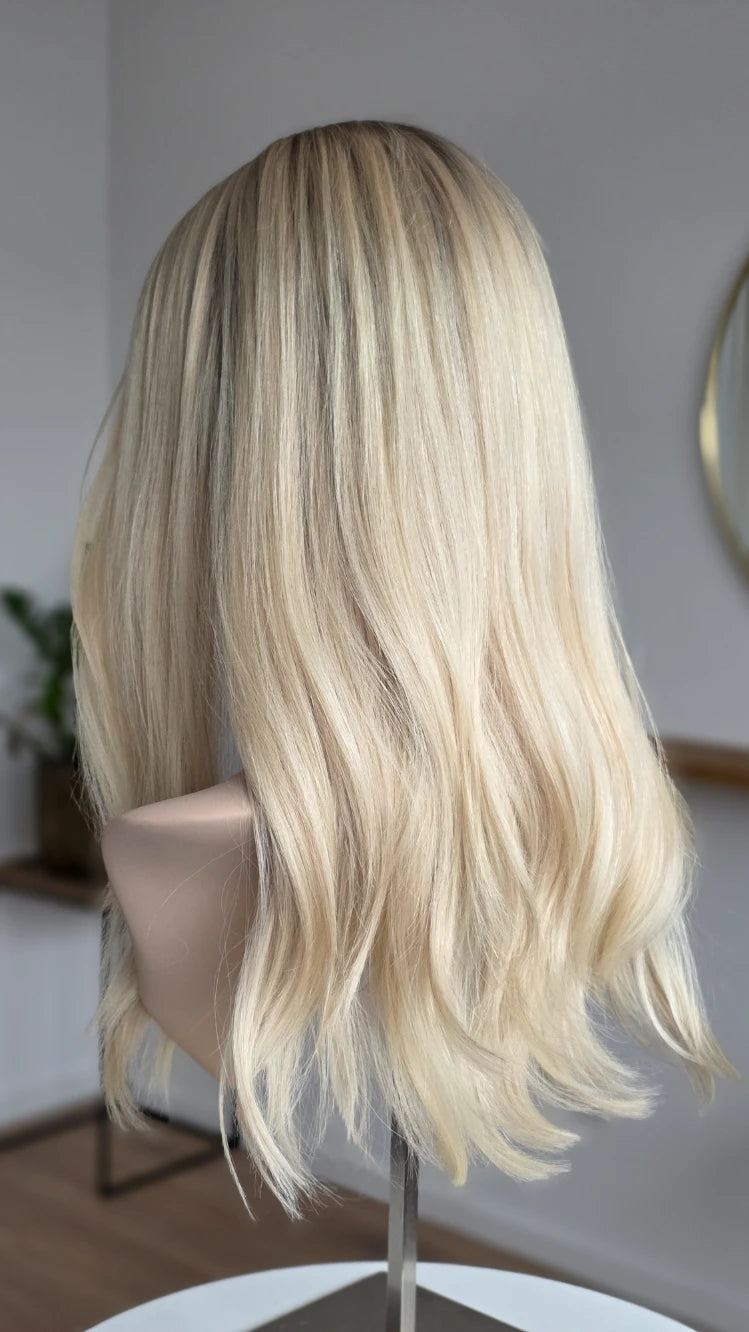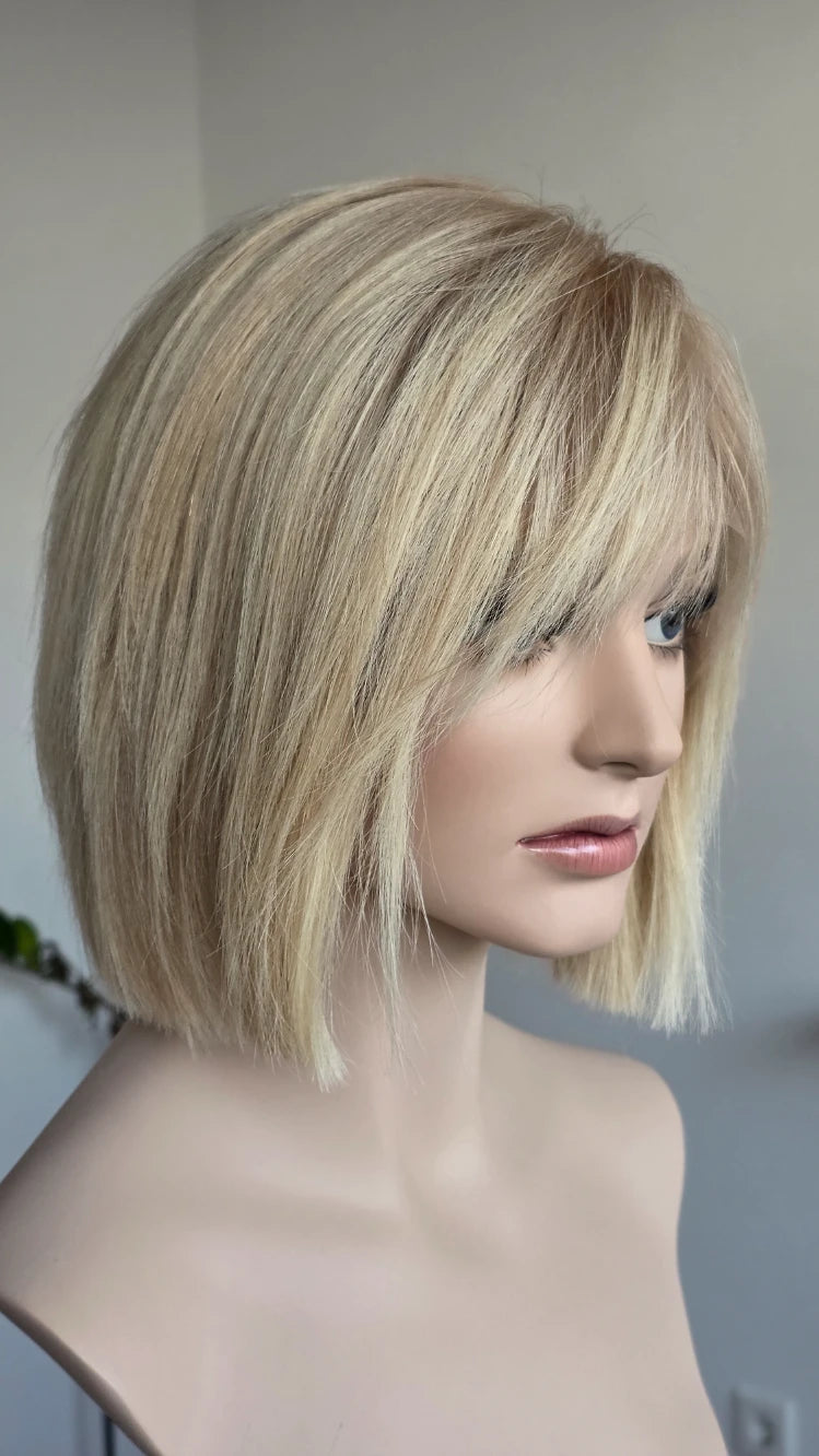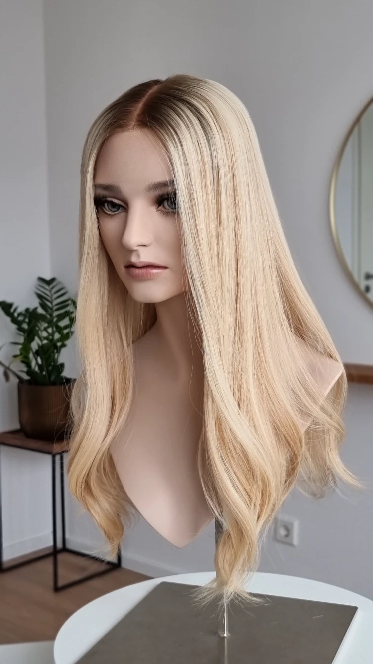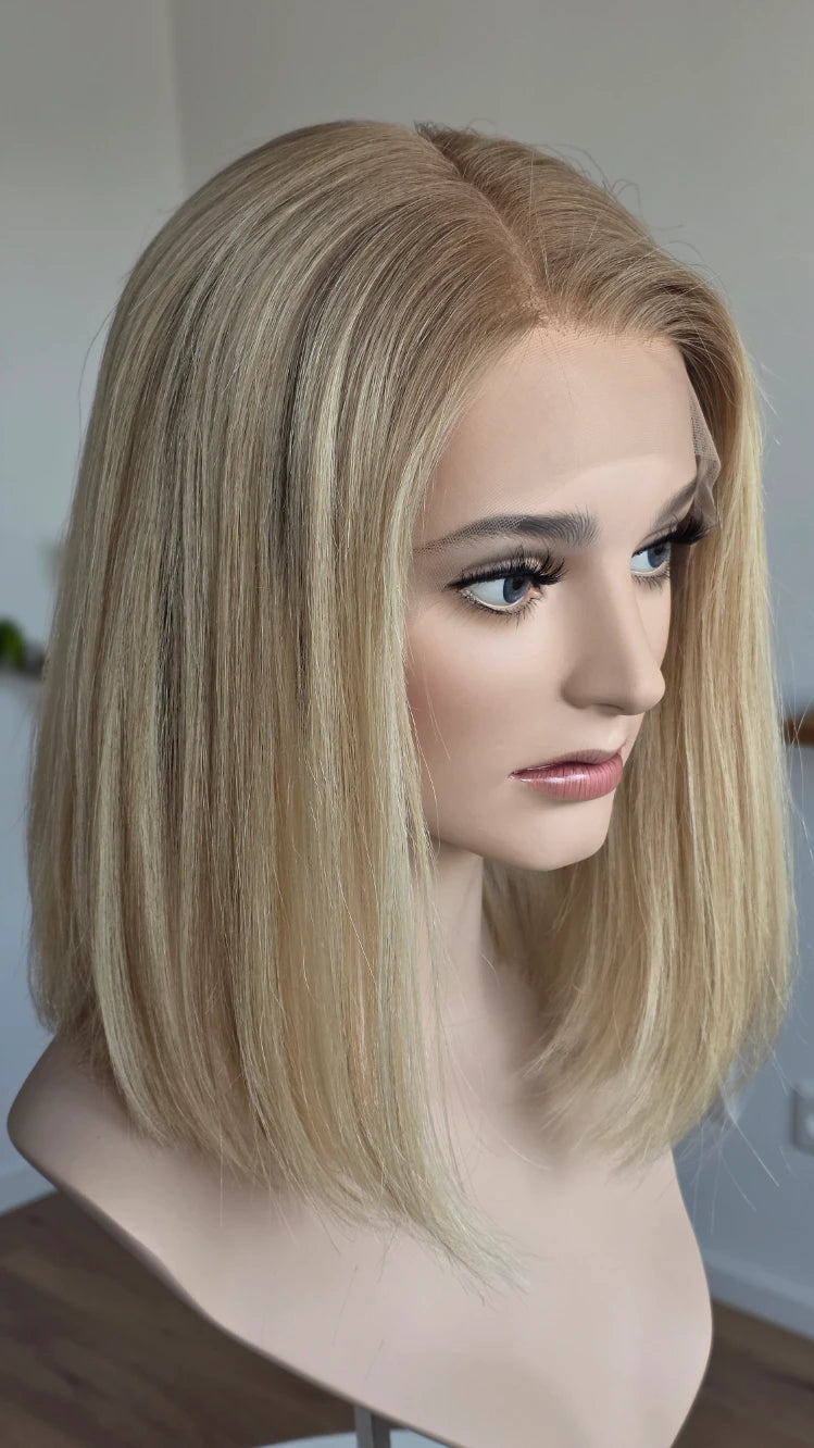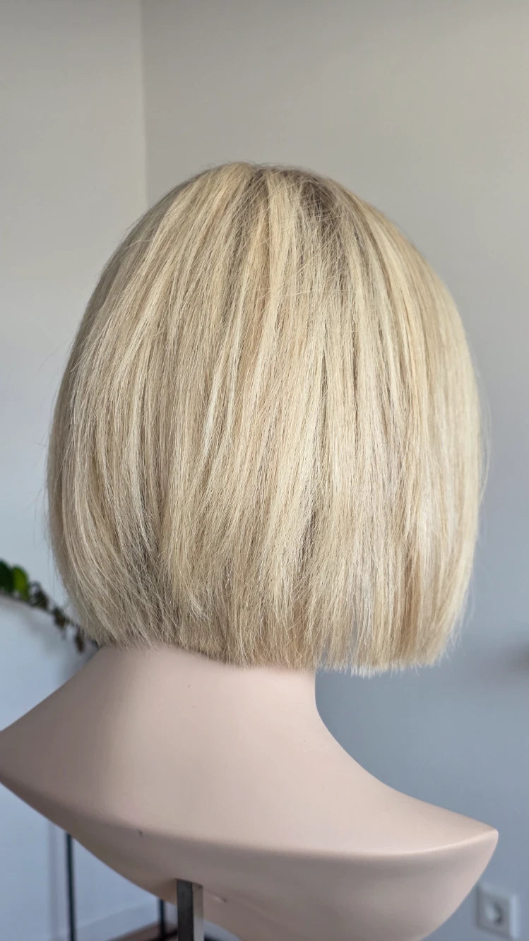 Eine Perücke bedeckt den gesamten Kopf und besteht aus verschiedenen Verarbeitungstechnicken, die gemeinsam für ein natürliches Aussehen sorgen.