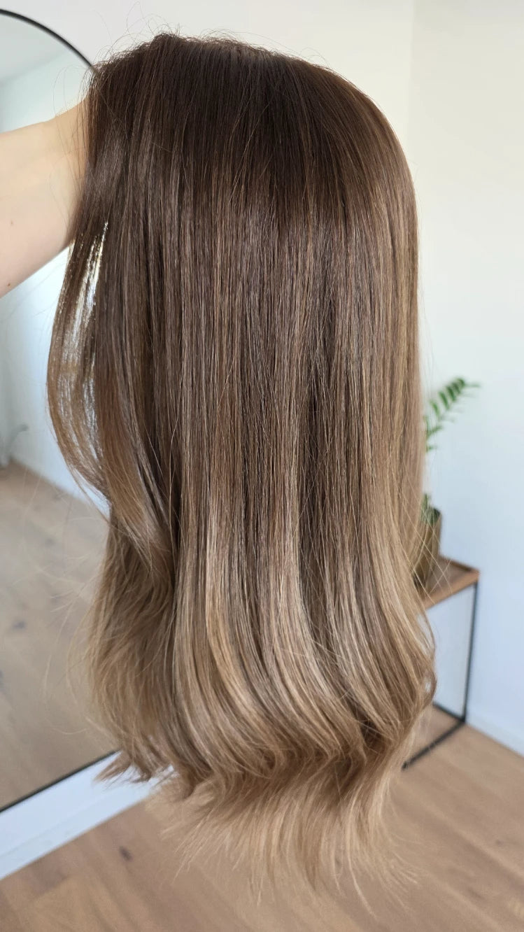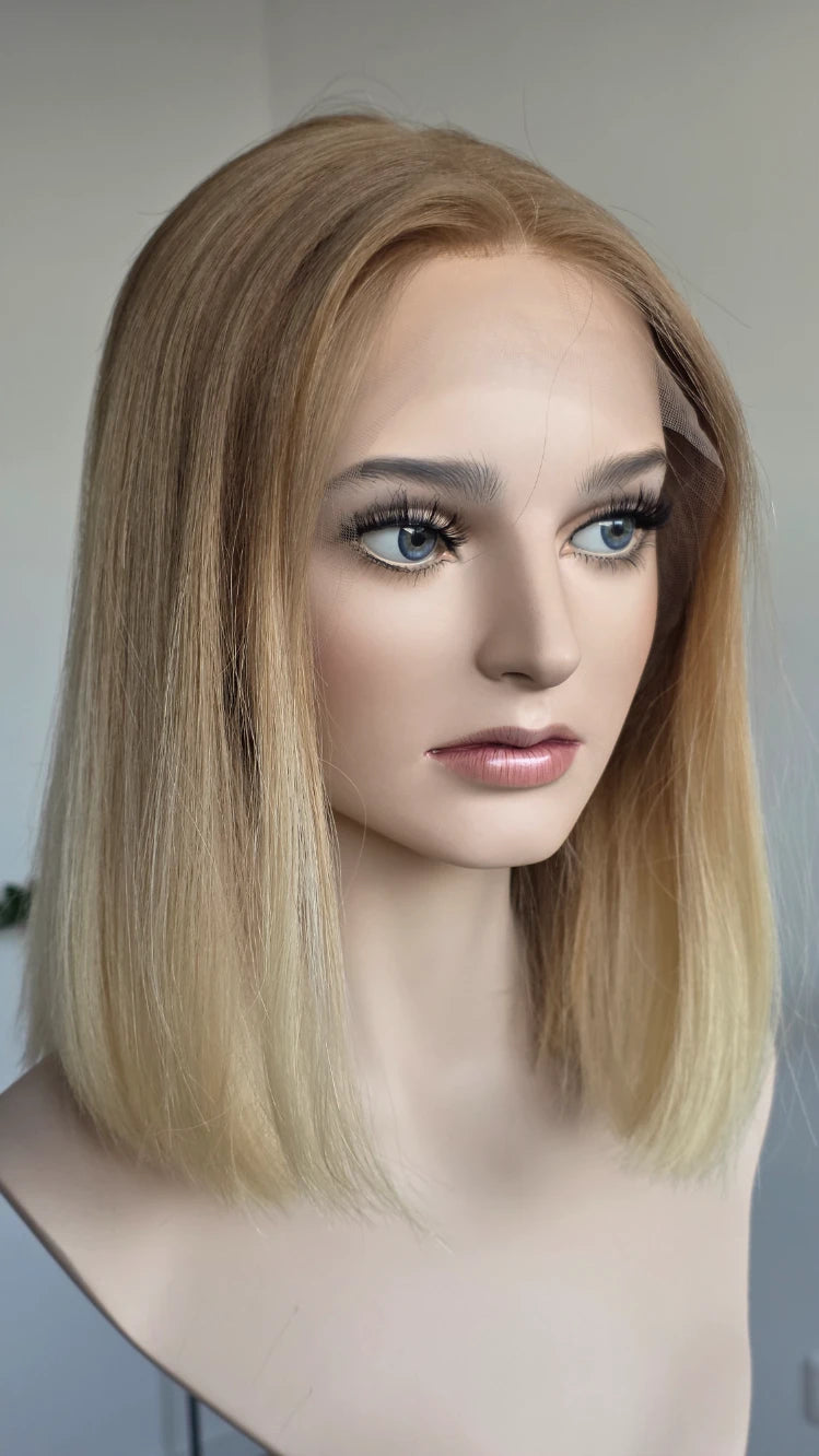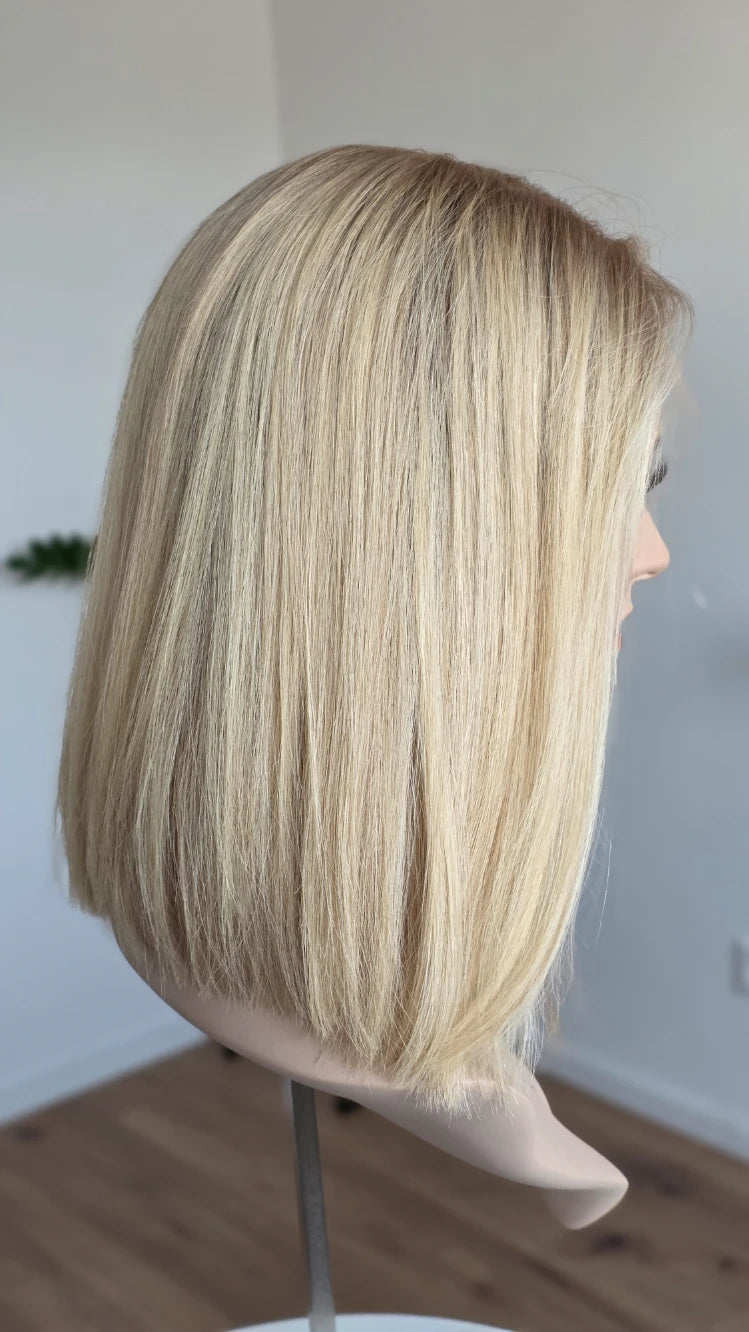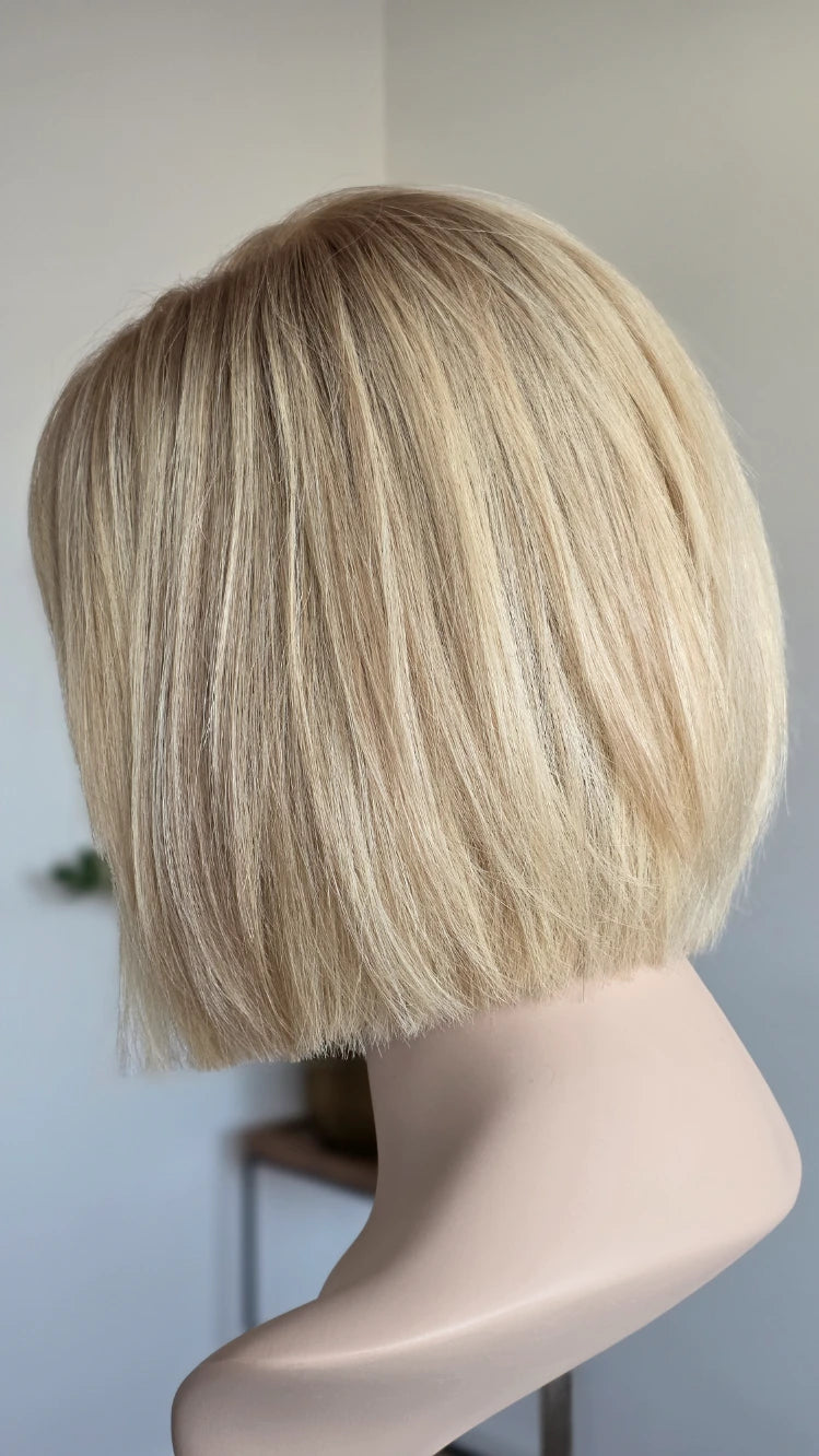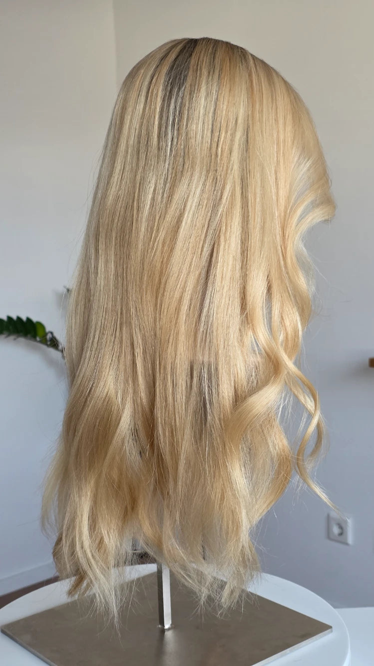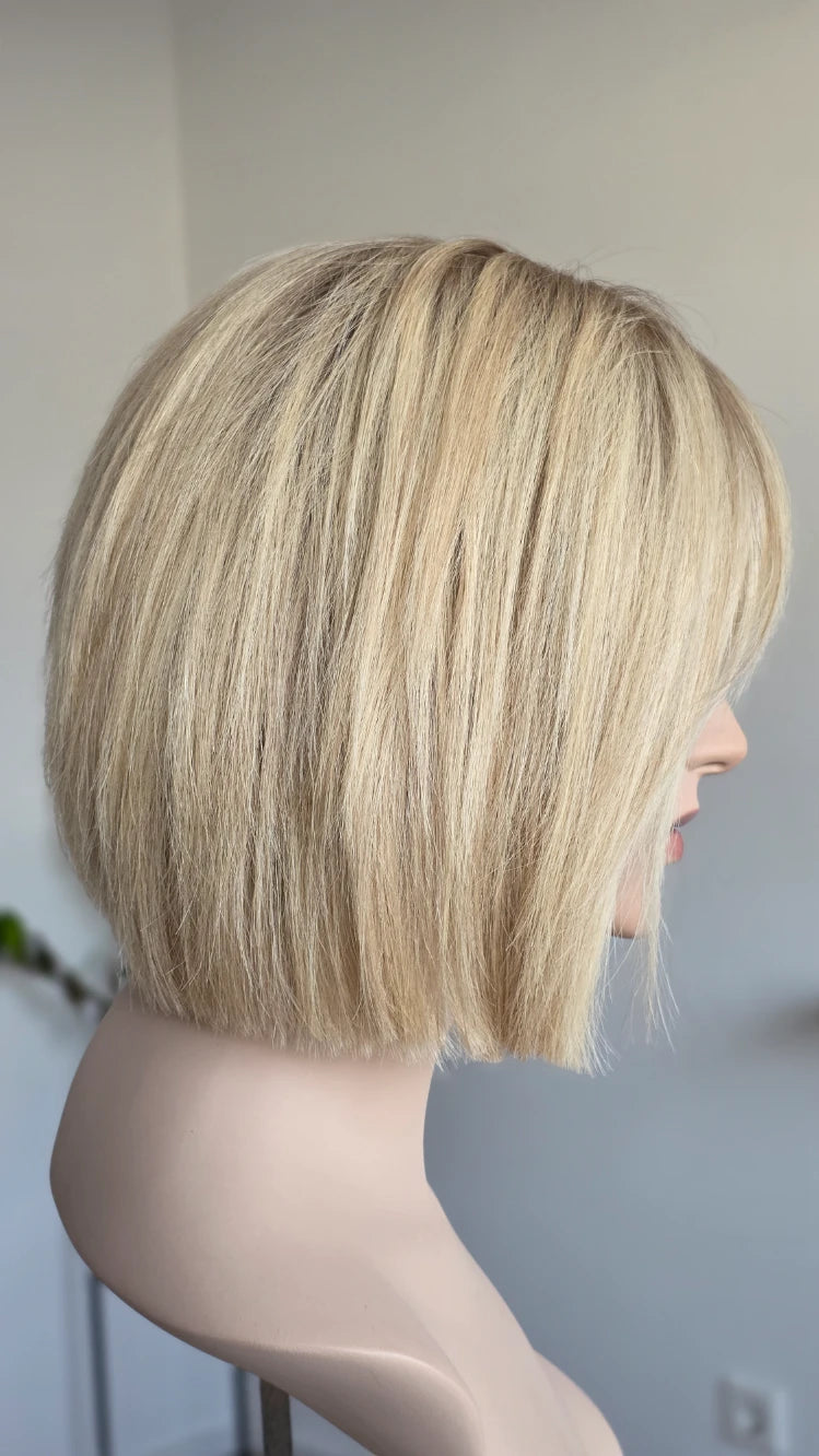 Eine Perücke bedeckt den gesamten Kopf und besteht aus verschiedenen Verarbeitungstechnicken, die gemeinsam für ein natürliches Aussehen sorgen.