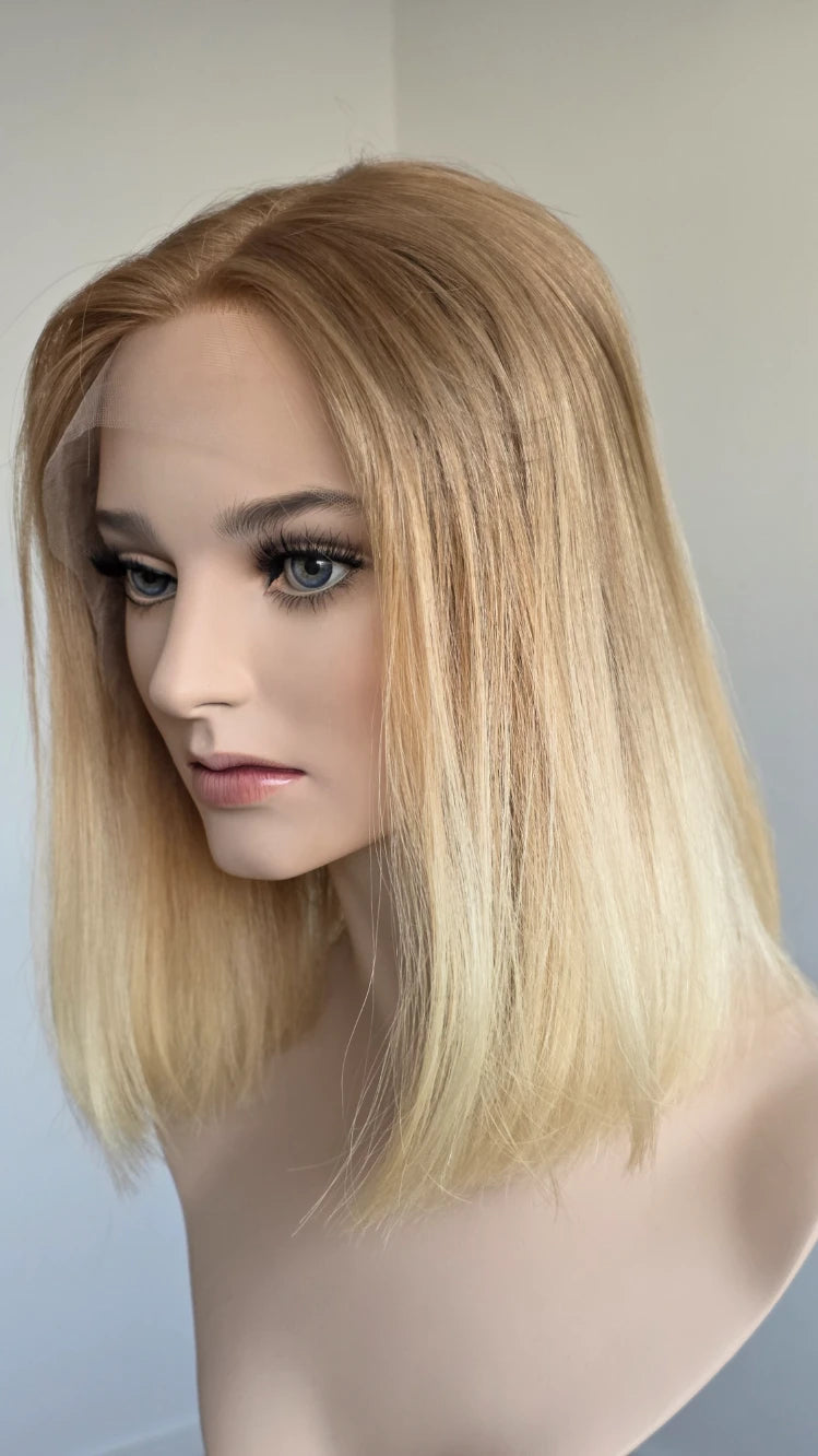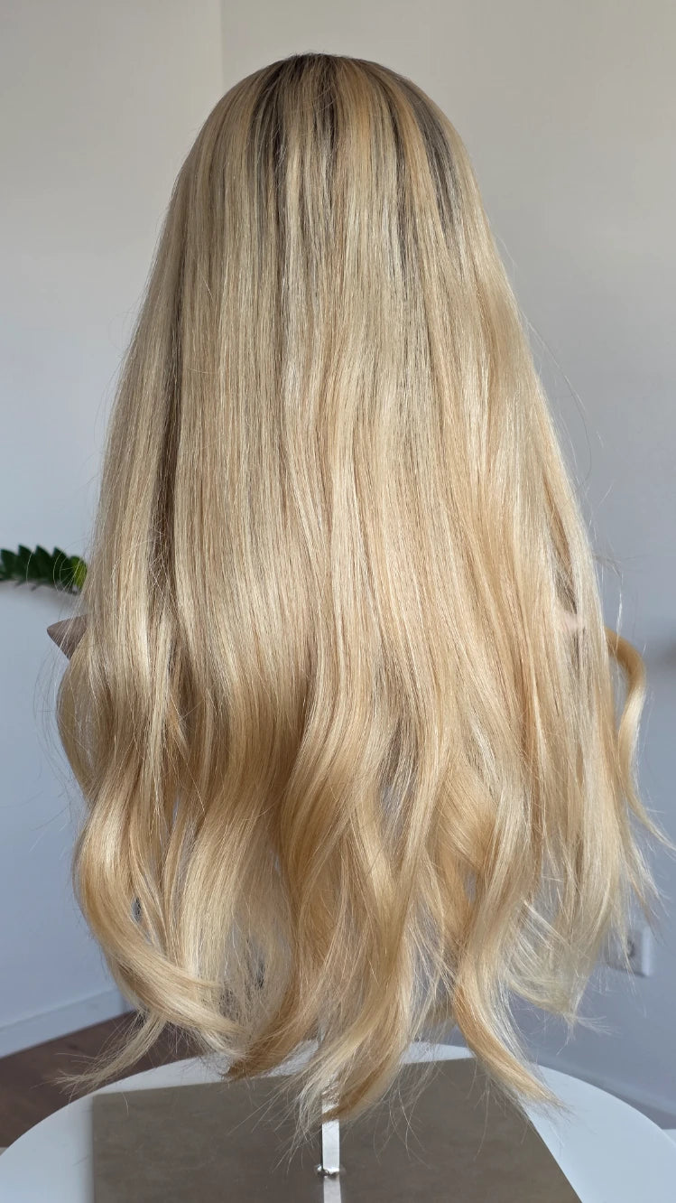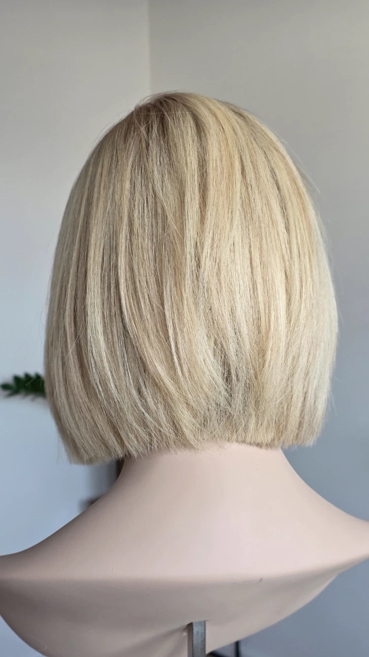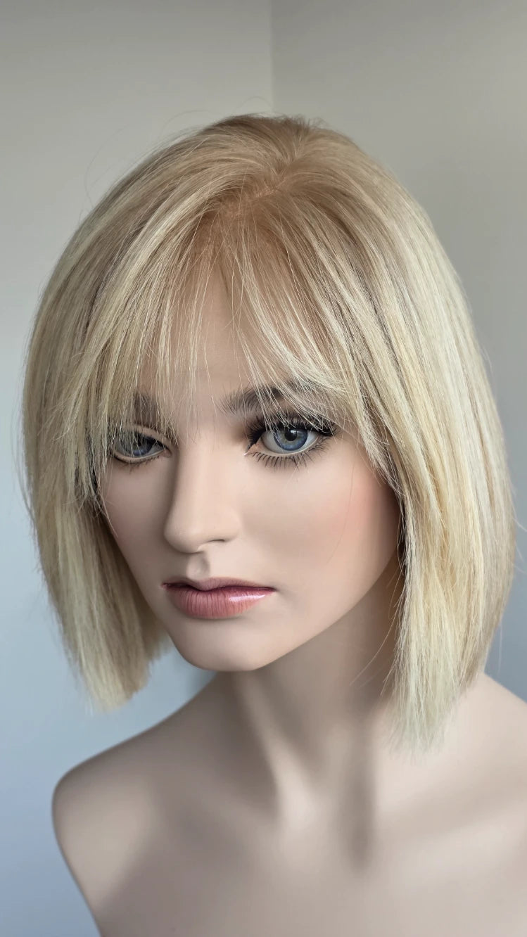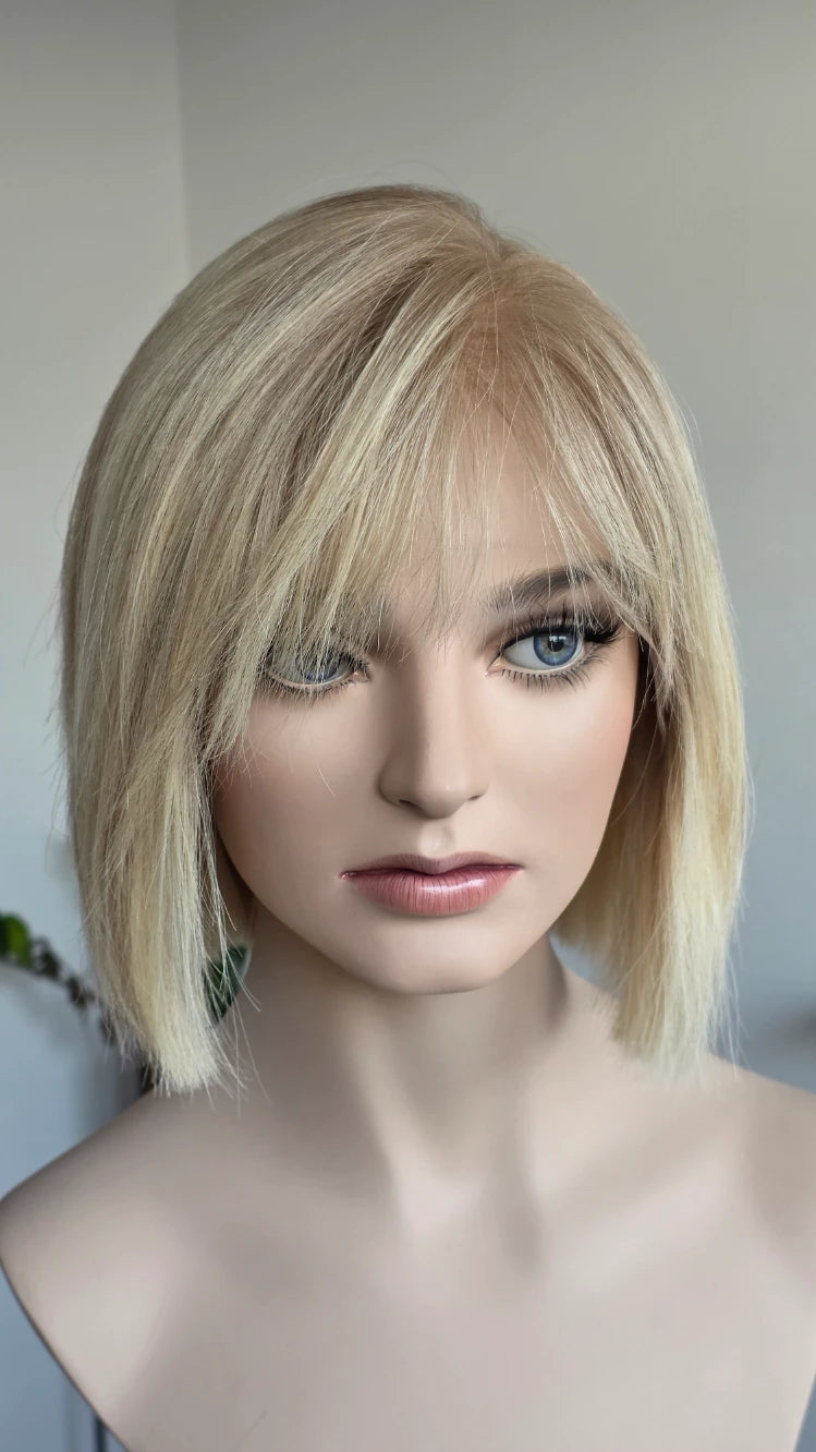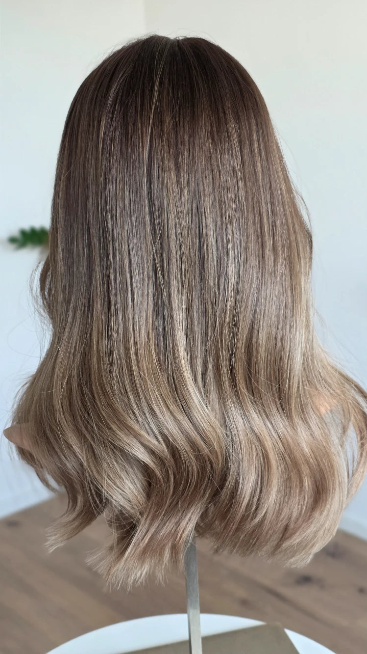 Eine Perücke bedeckt den gesamten Kopf und besteht aus verschiedenen Verarbeitungstechnicken, die gemeinsam für ein natürliches Aussehen sorgen.