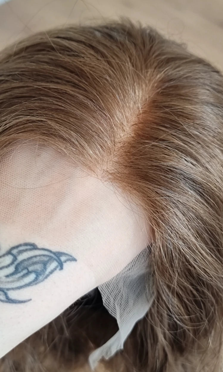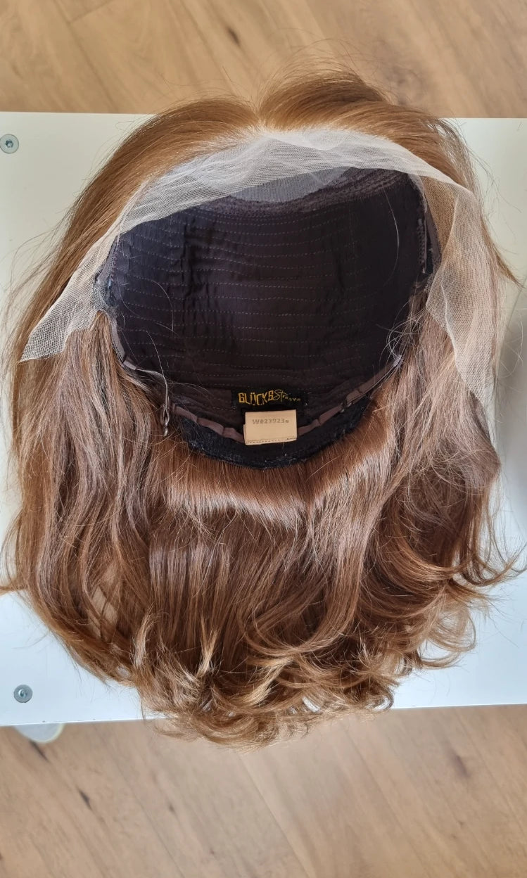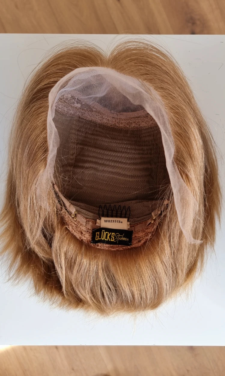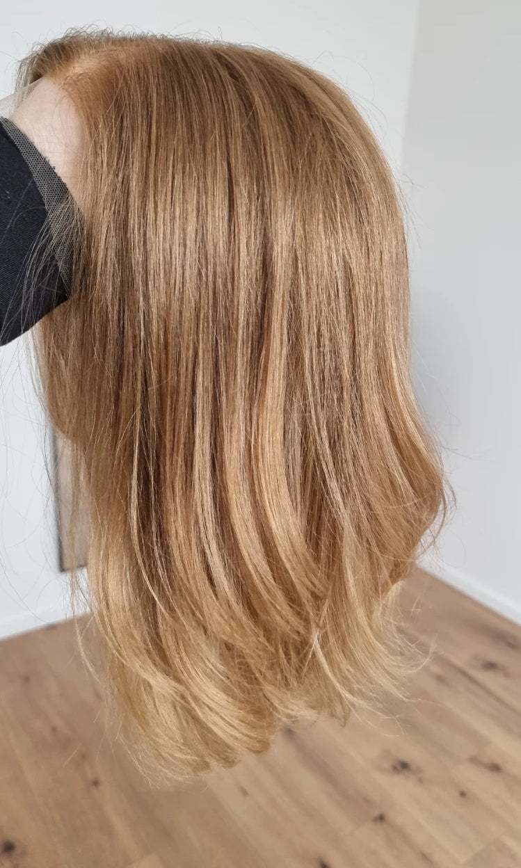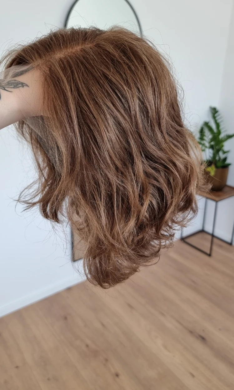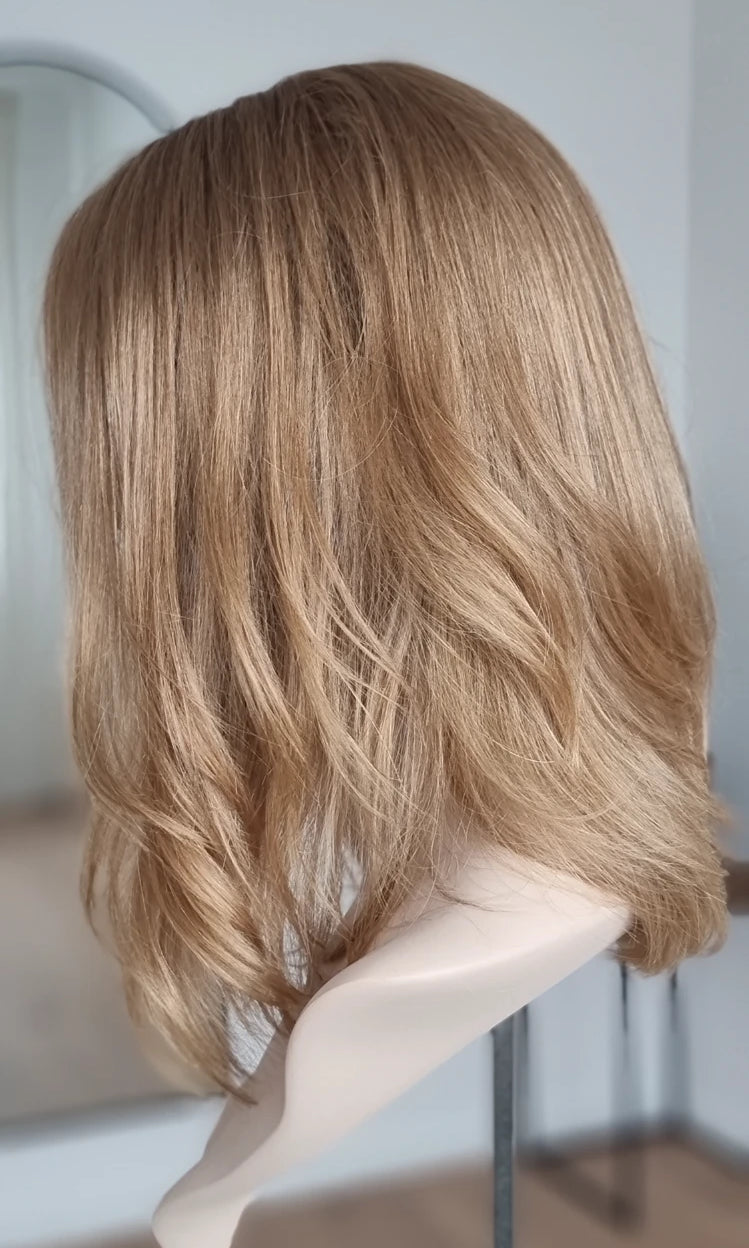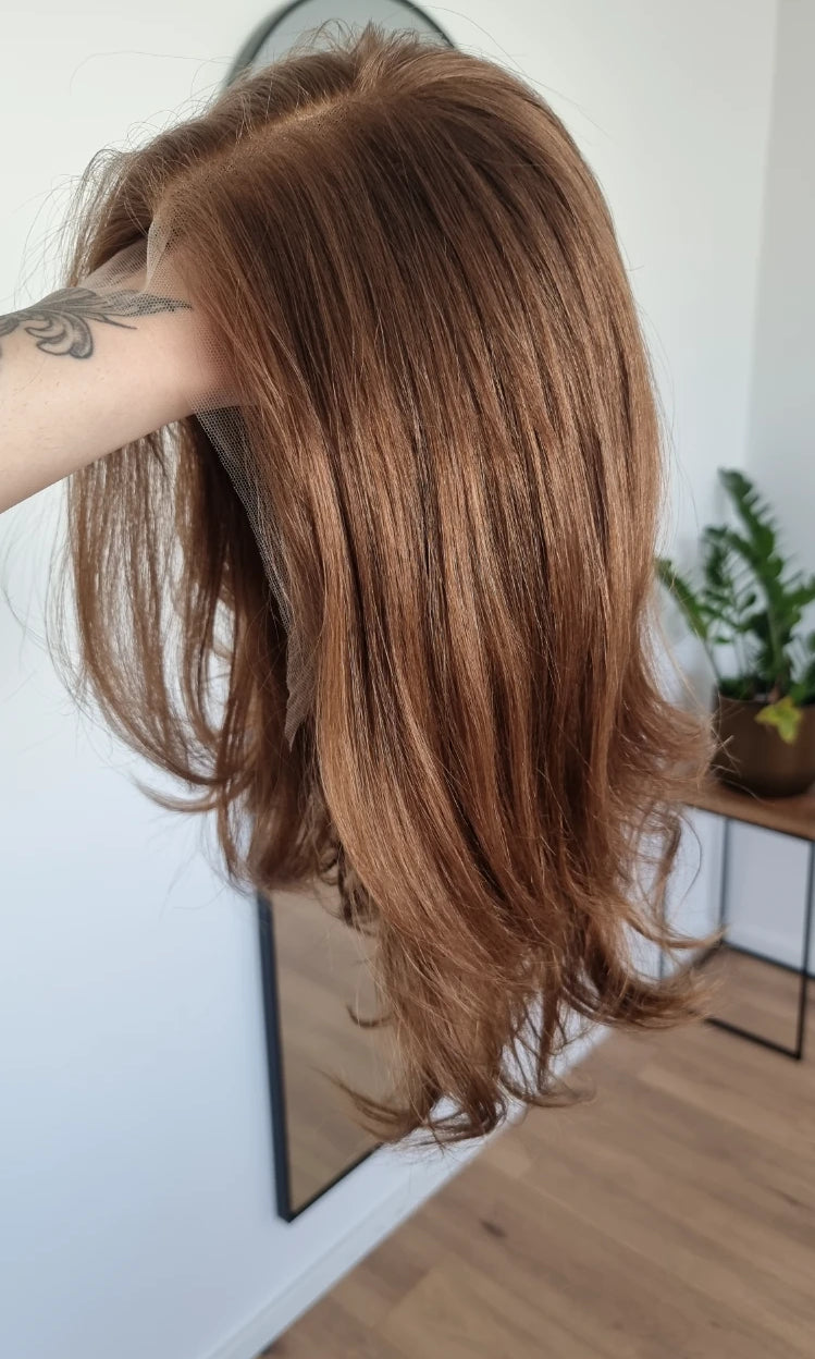 Eine Perücke bedeckt den gesamten Kopf und besteht aus verschiedenen Verarbeitungstechnicken, die gemeinsam für ein natürliches Aussehen sorgen.