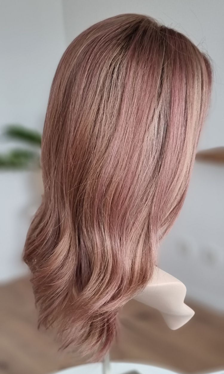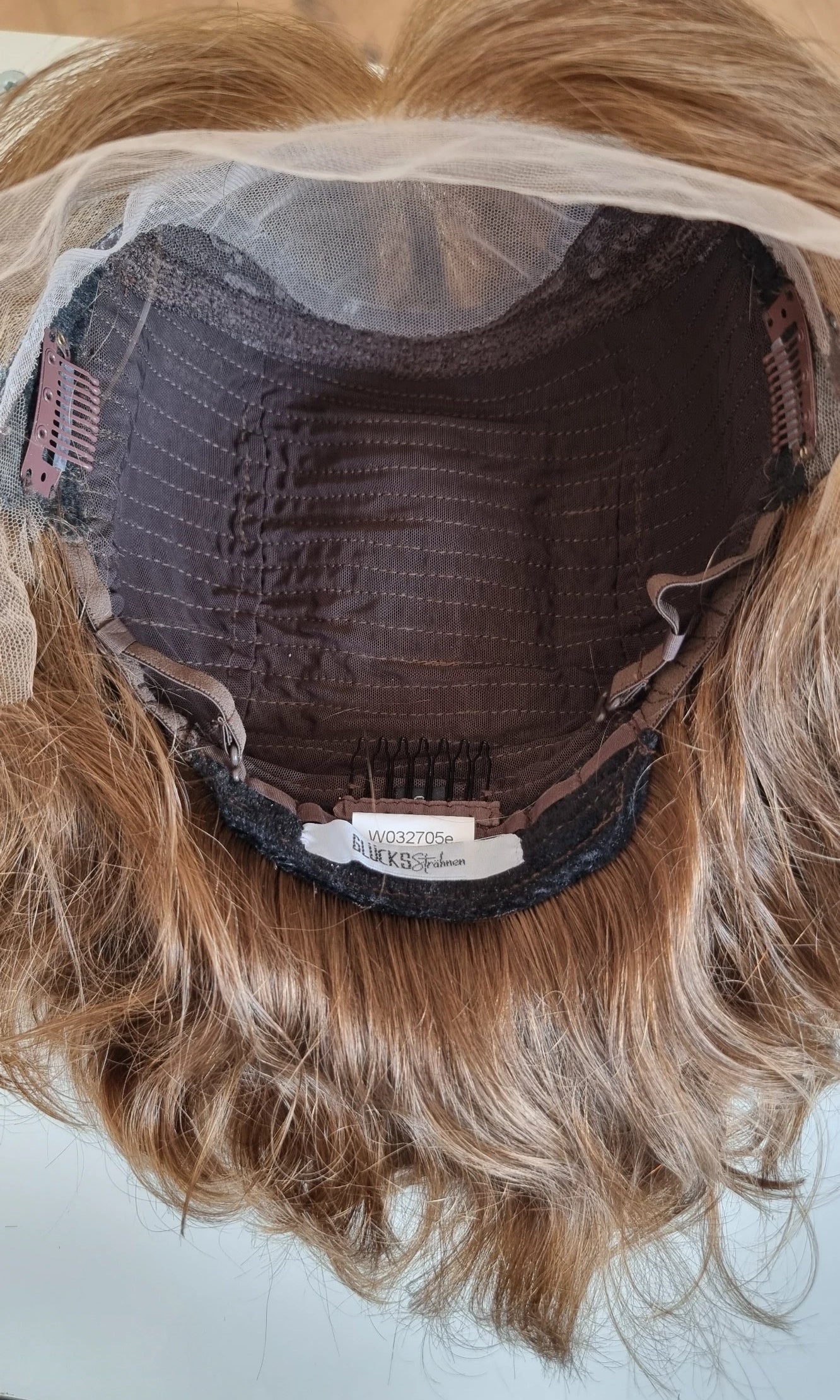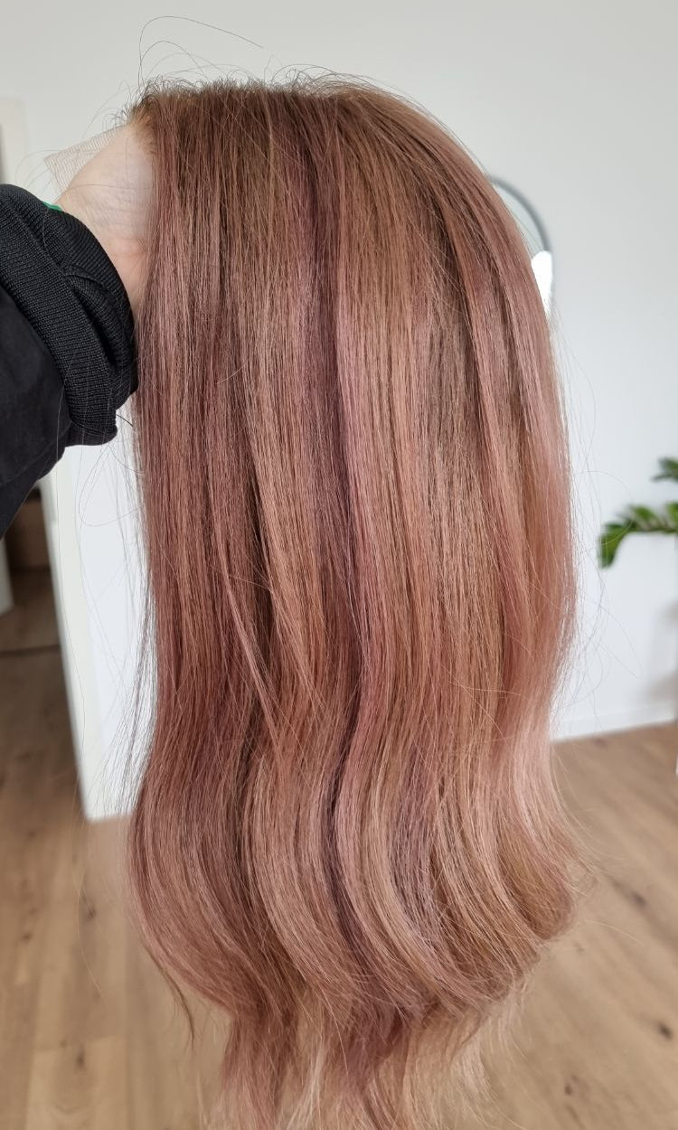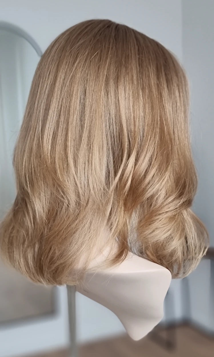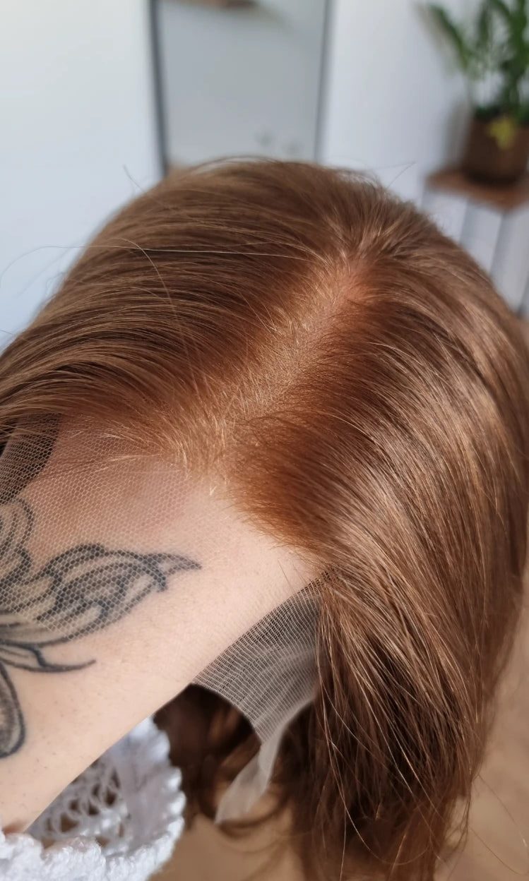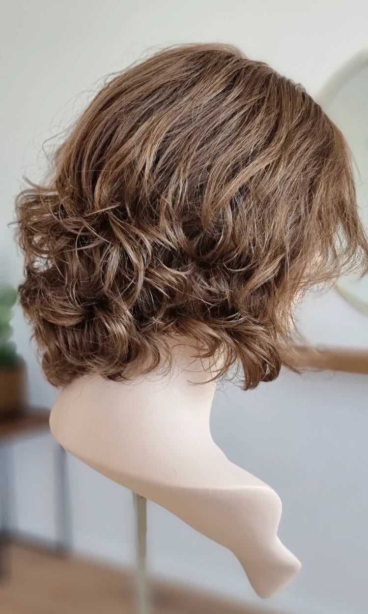 Eine Perücke bedeckt den gesamten Kopf und besteht aus verschiedenen Verarbeitungstechnicken, die gemeinsam für ein natürliches Aussehen sorgen.