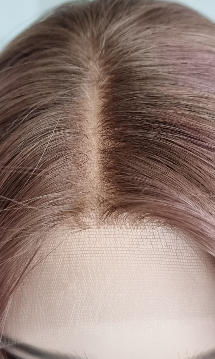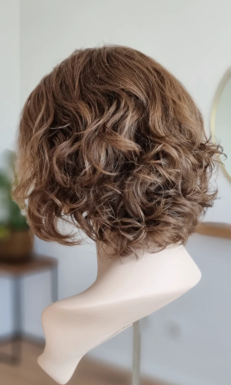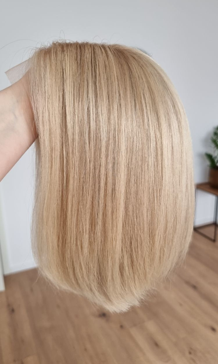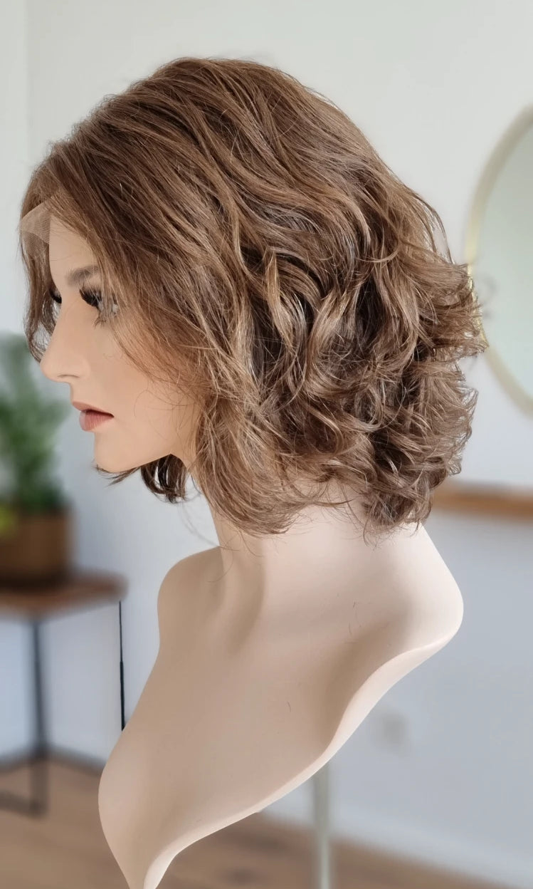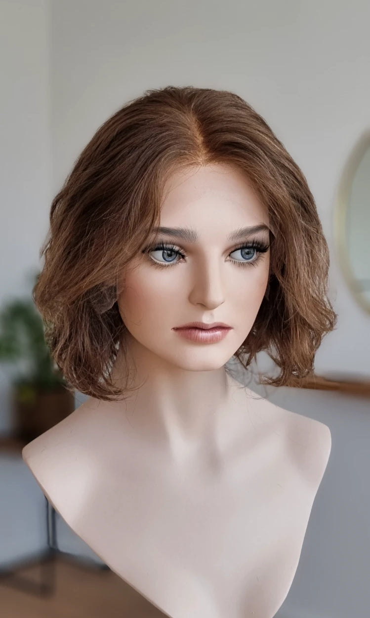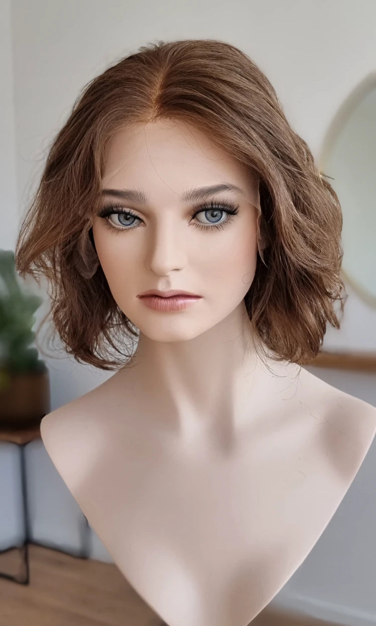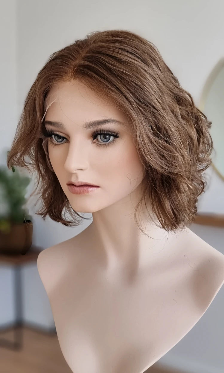 Eine Perücke bedeckt den gesamten Kopf und besteht aus verschiedenen Verarbeitungstechnicken, die gemeinsam für ein natürliches Aussehen sorgen.