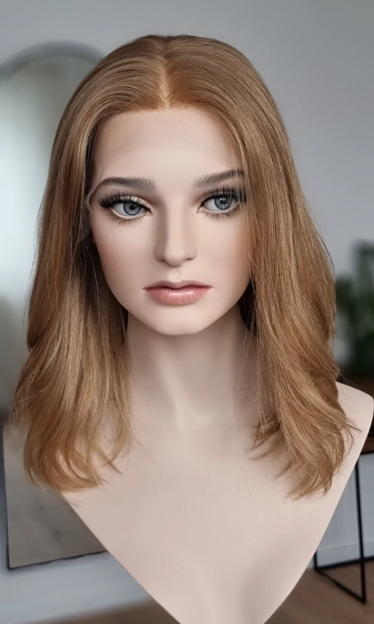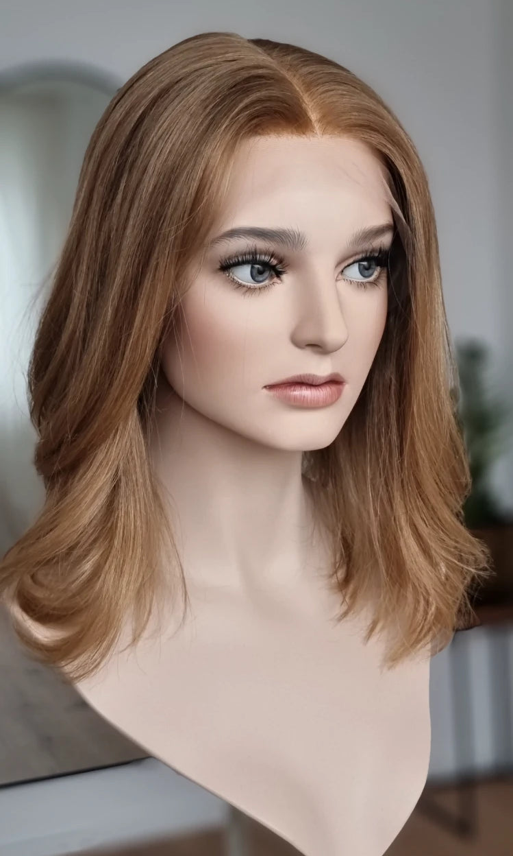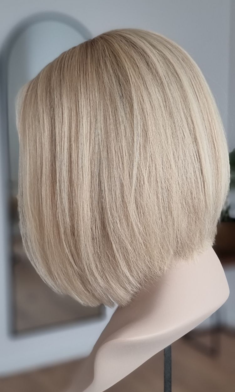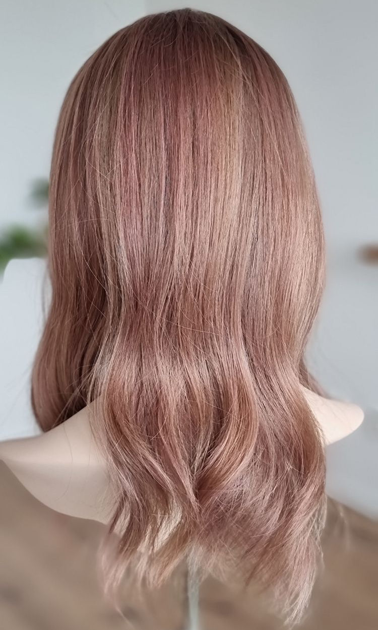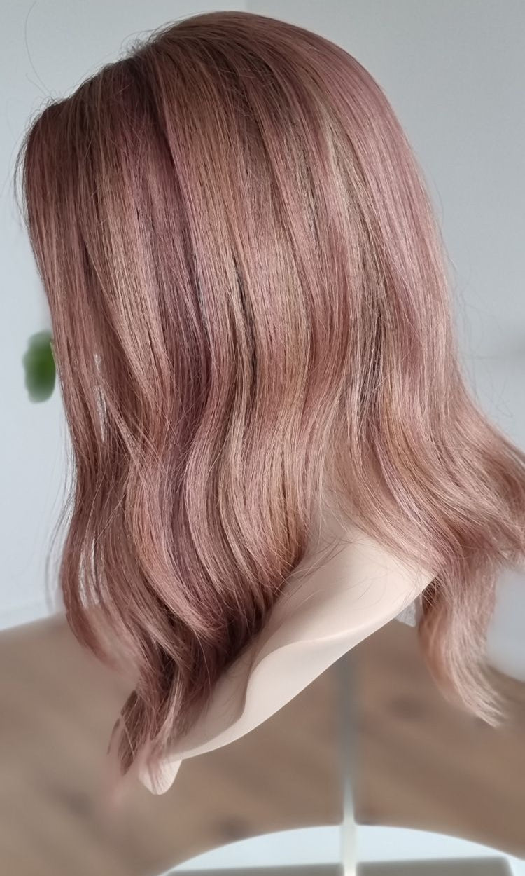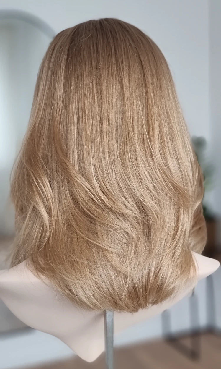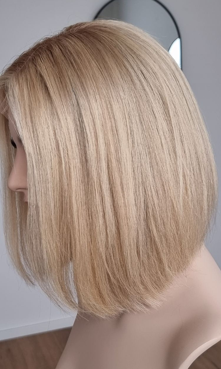 Eine Perücke bedeckt den gesamten Kopf und besteht aus verschiedenen Verarbeitungstechnicken, die gemeinsam für ein natürliches Aussehen sorgen.