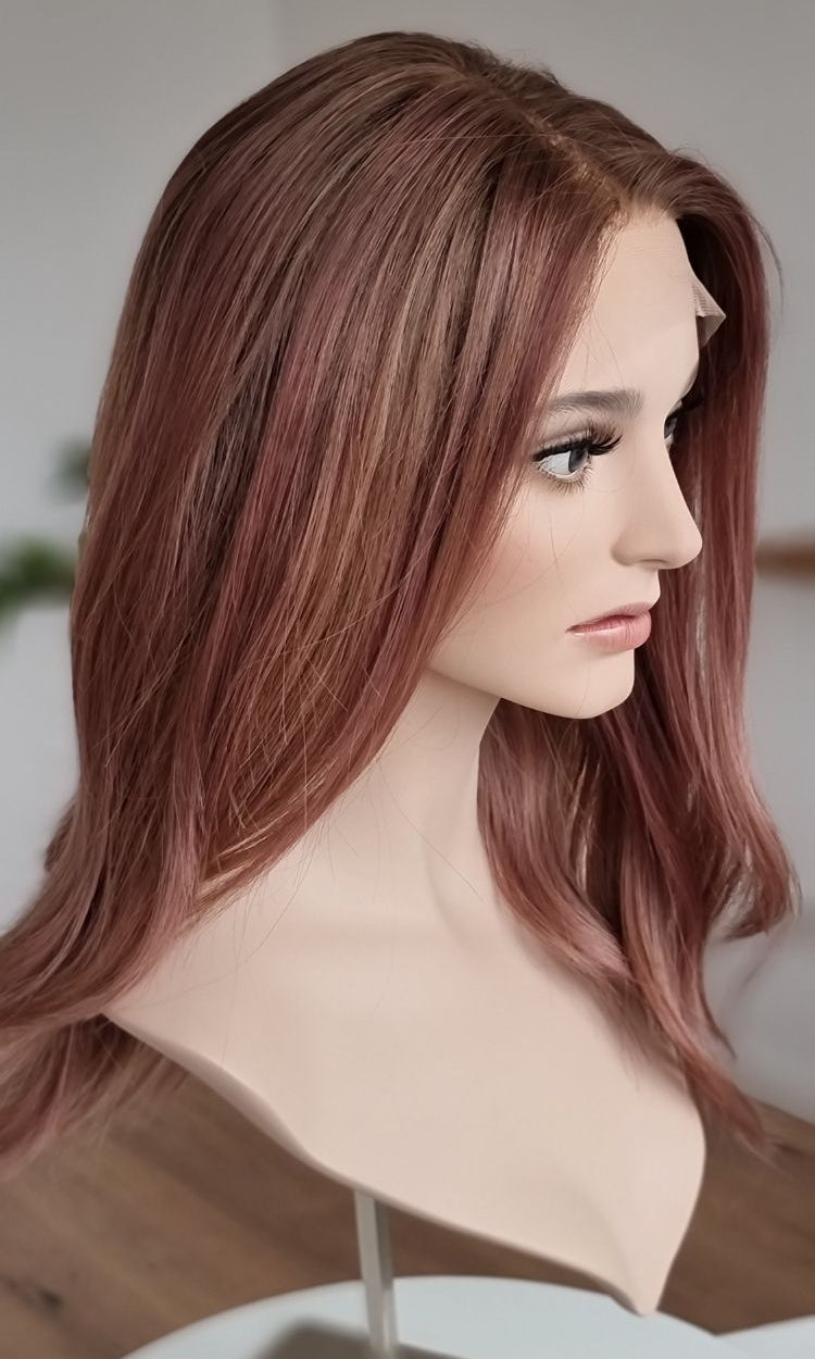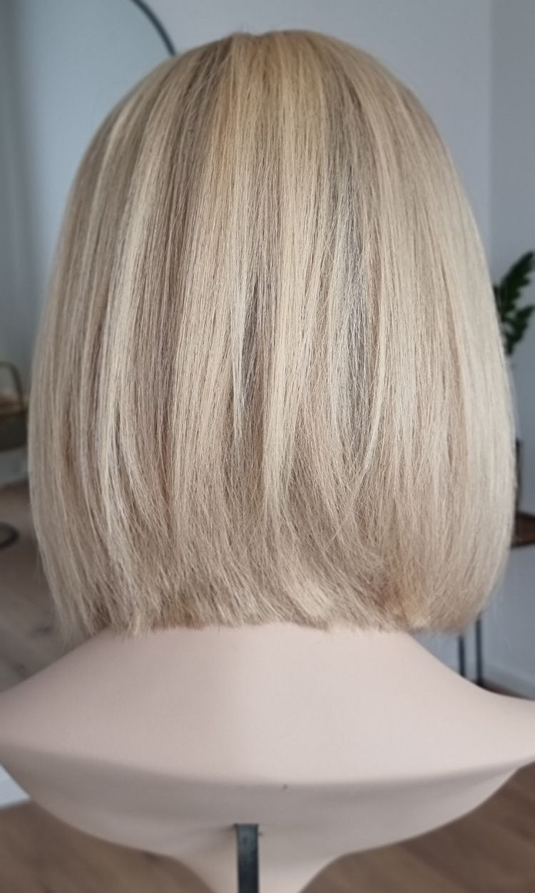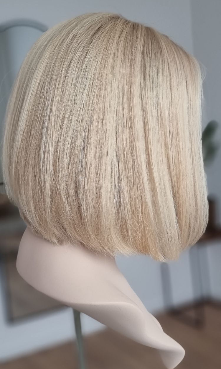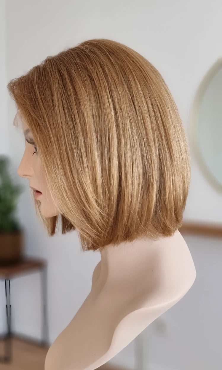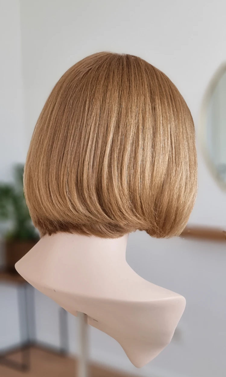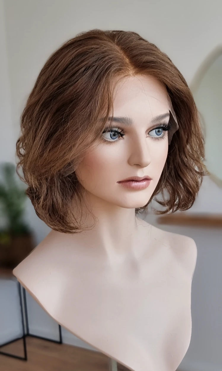 Eine Perücke bedeckt den gesamten Kopf und besteht aus verschiedenen Verarbeitungstechnicken, die gemeinsam für ein natürliches Aussehen sorgen.