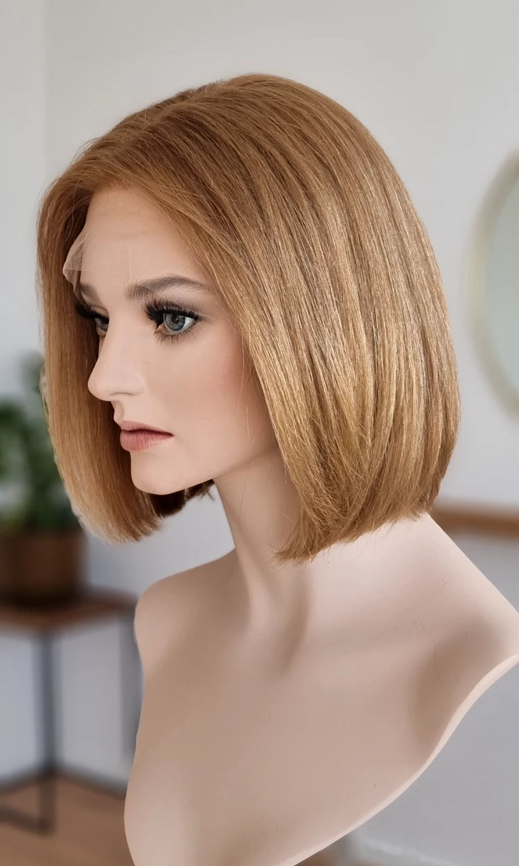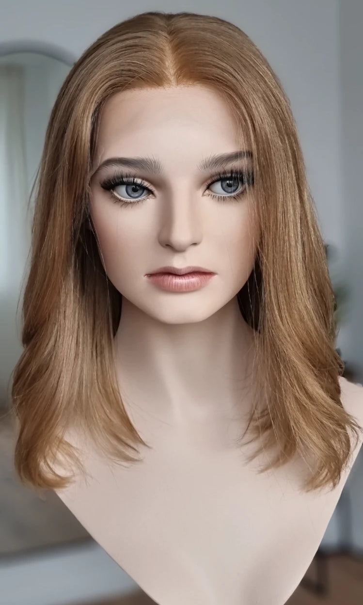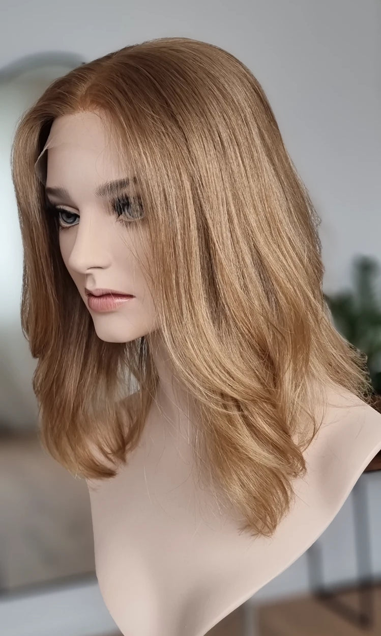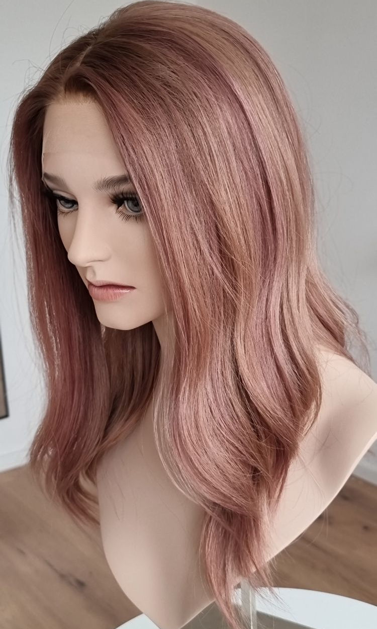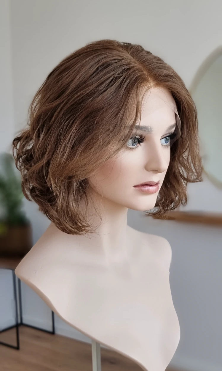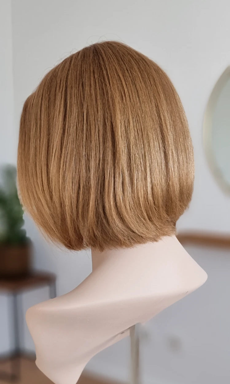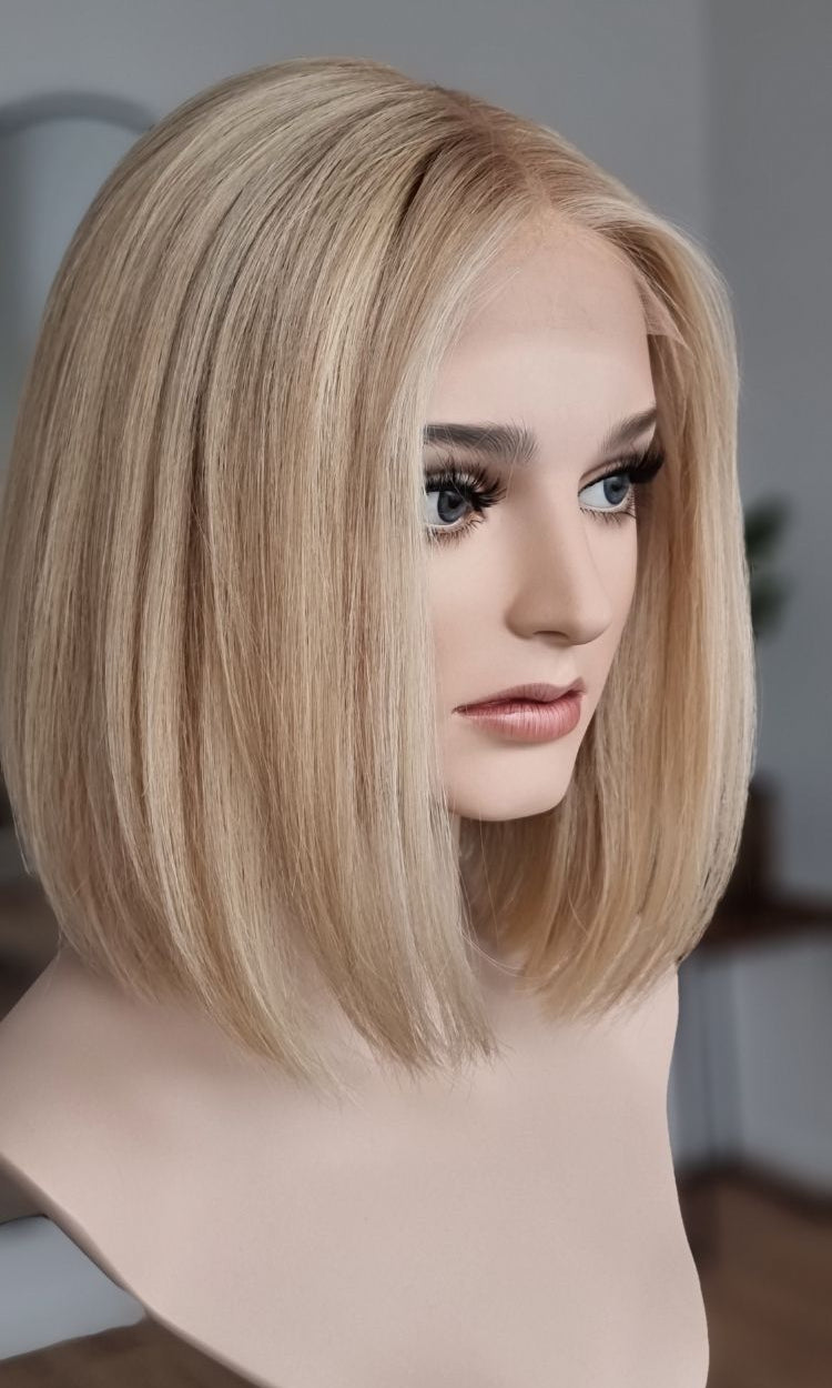 Eine Perücke bedeckt den gesamten Kopf und besteht aus verschiedenen Verarbeitungstechnicken, die gemeinsam für ein natürliches Aussehen sorgen.
