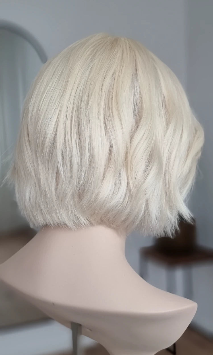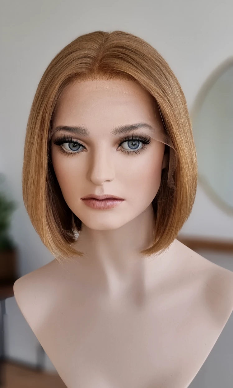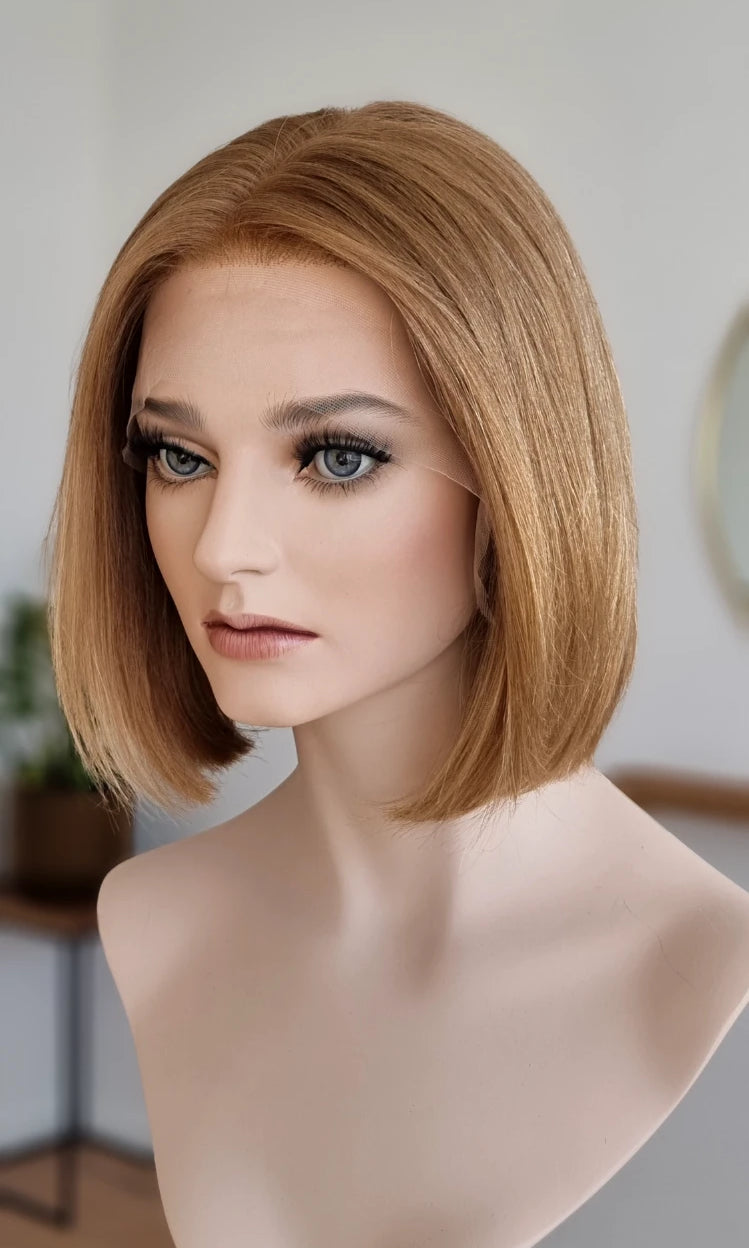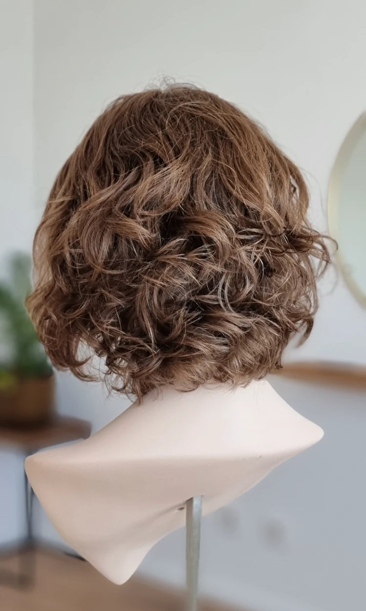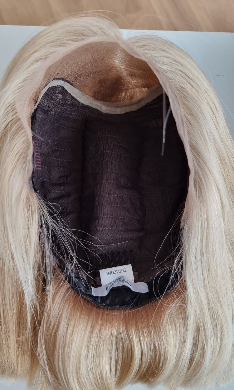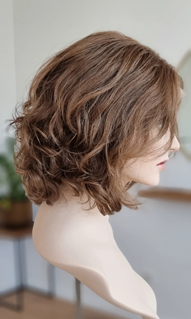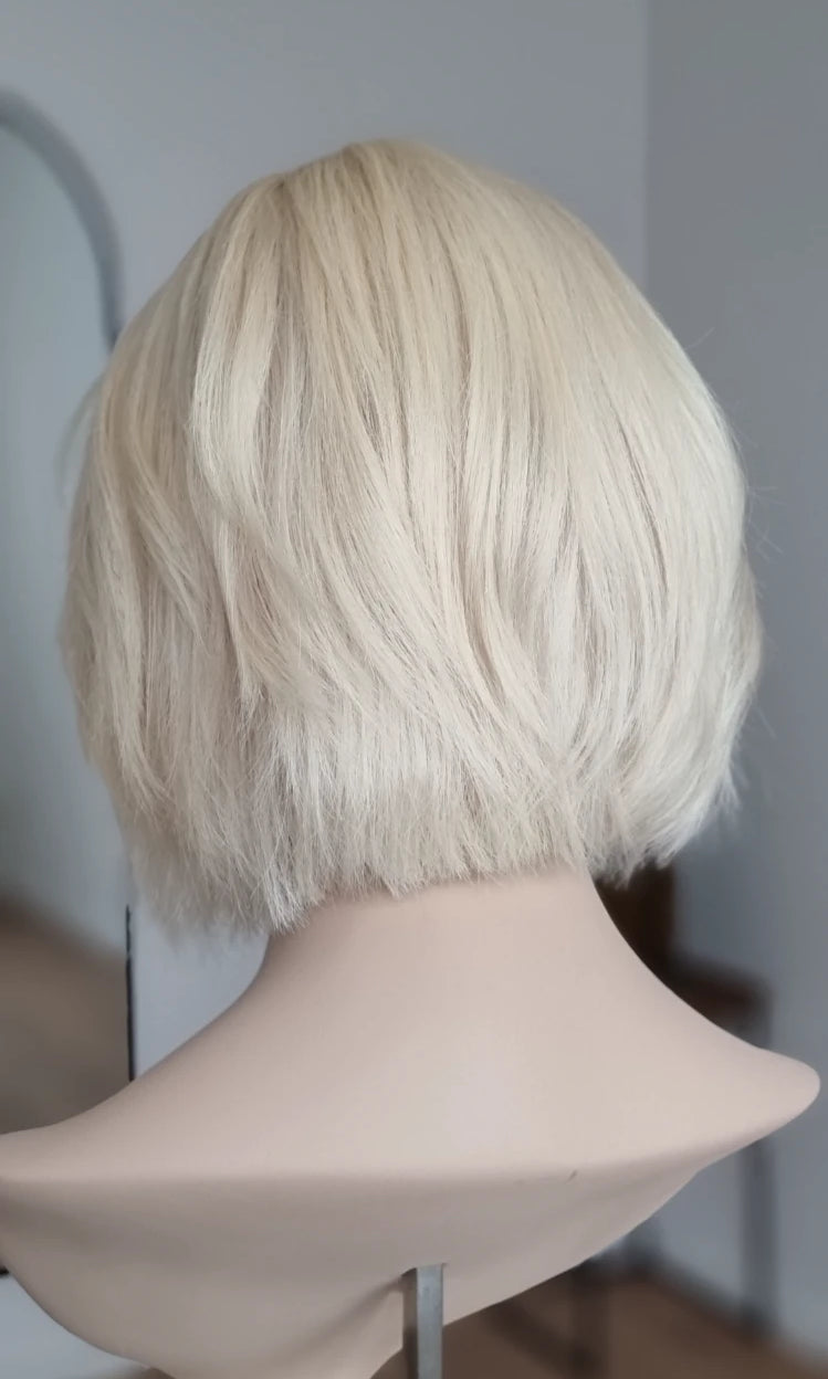 Eine Perücke bedeckt den gesamten Kopf und besteht aus verschiedenen Verarbeitungstechnicken, die gemeinsam für ein natürliches Aussehen sorgen.