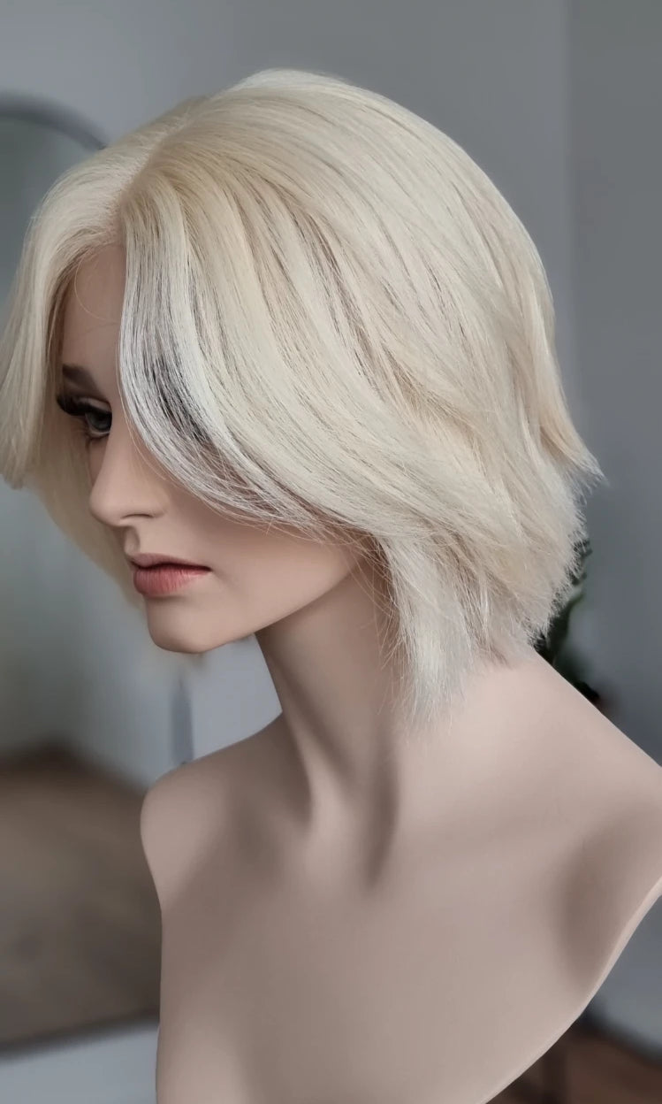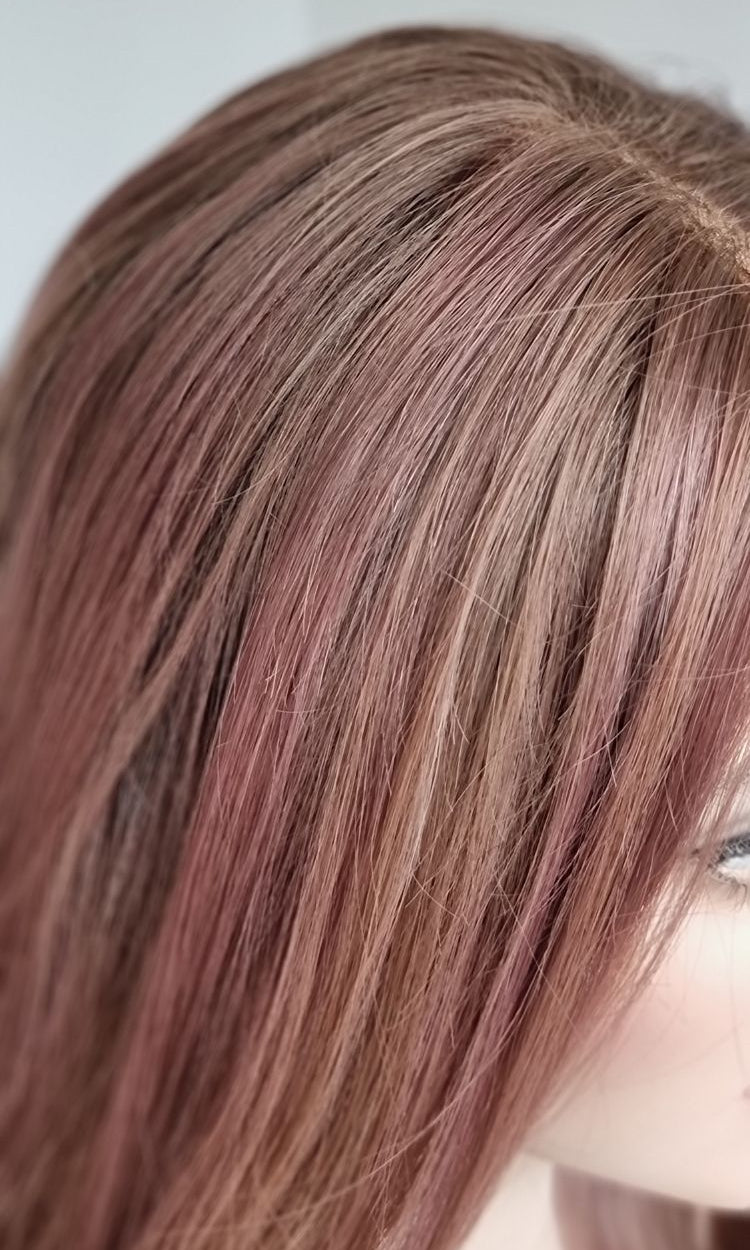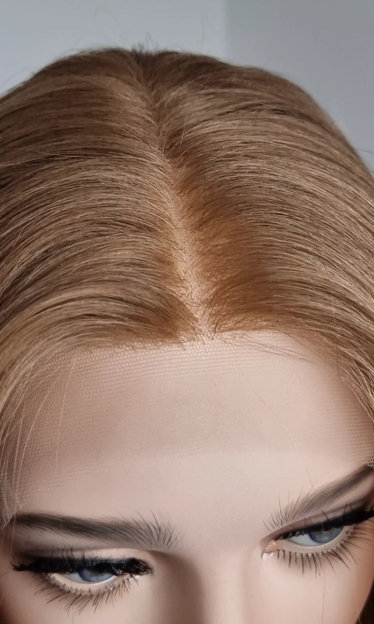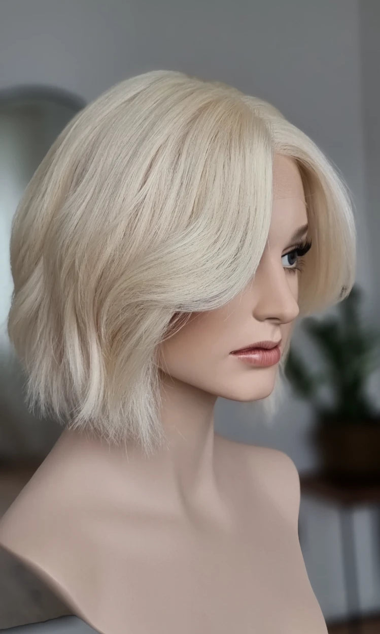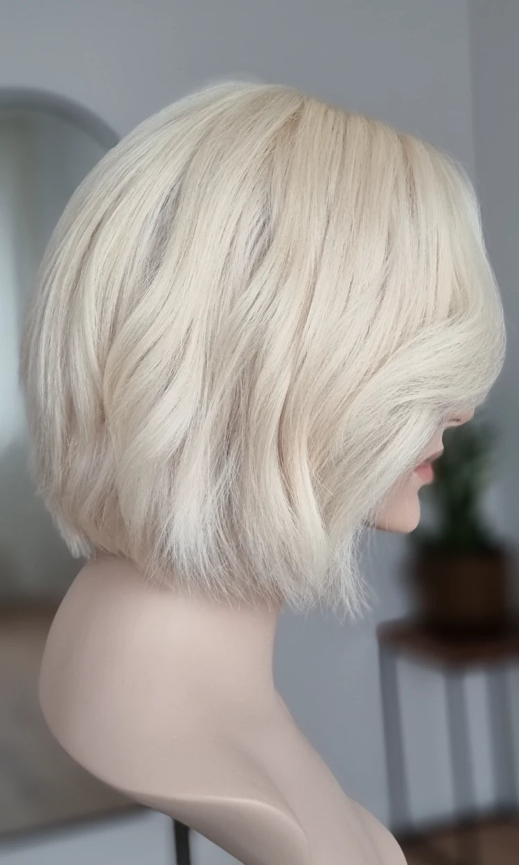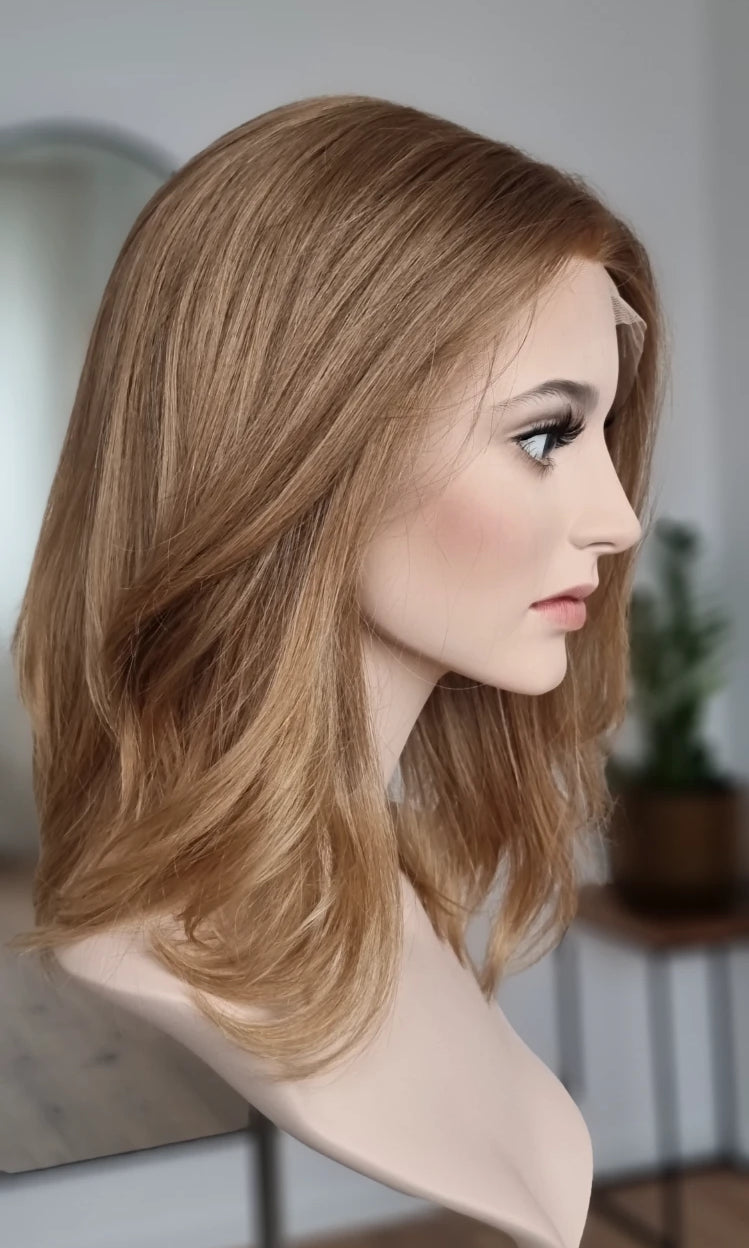 Eine Perücke bedeckt den gesamten Kopf und besteht aus verschiedenen Verarbeitungstechnicken, die gemeinsam für ein natürliches Aussehen sorgen.