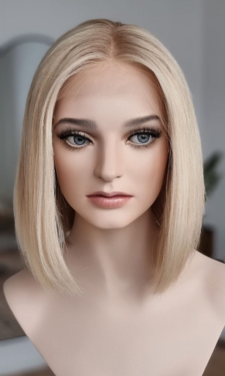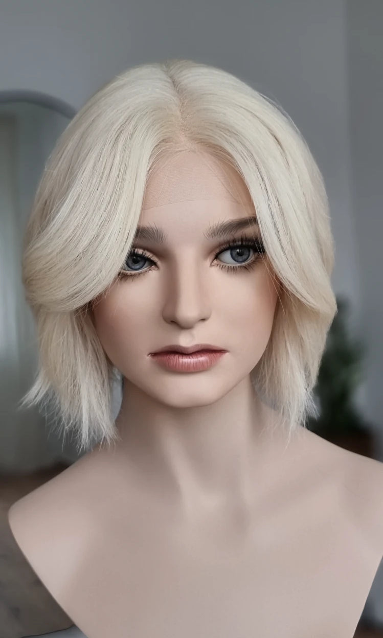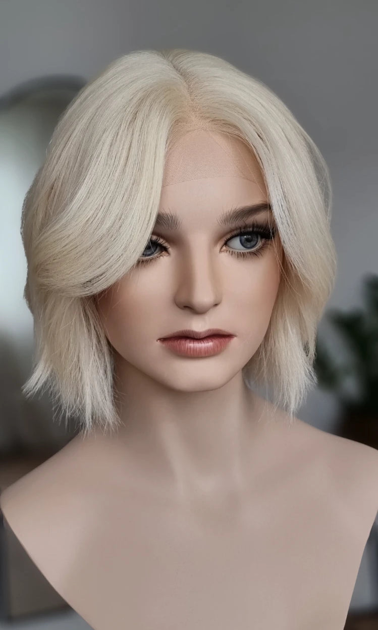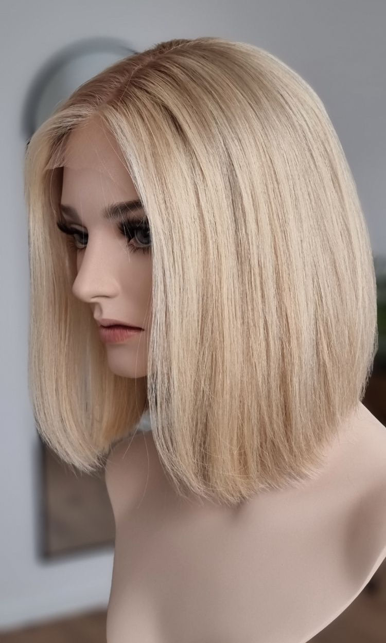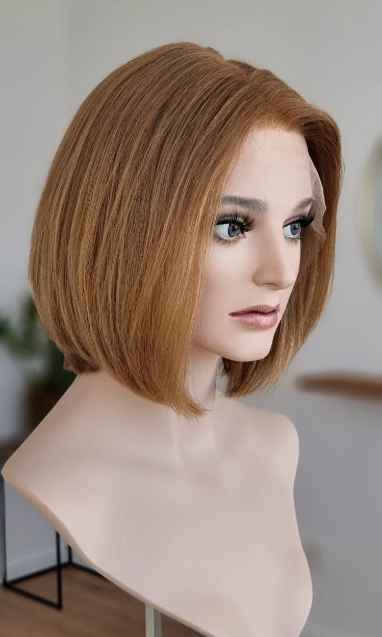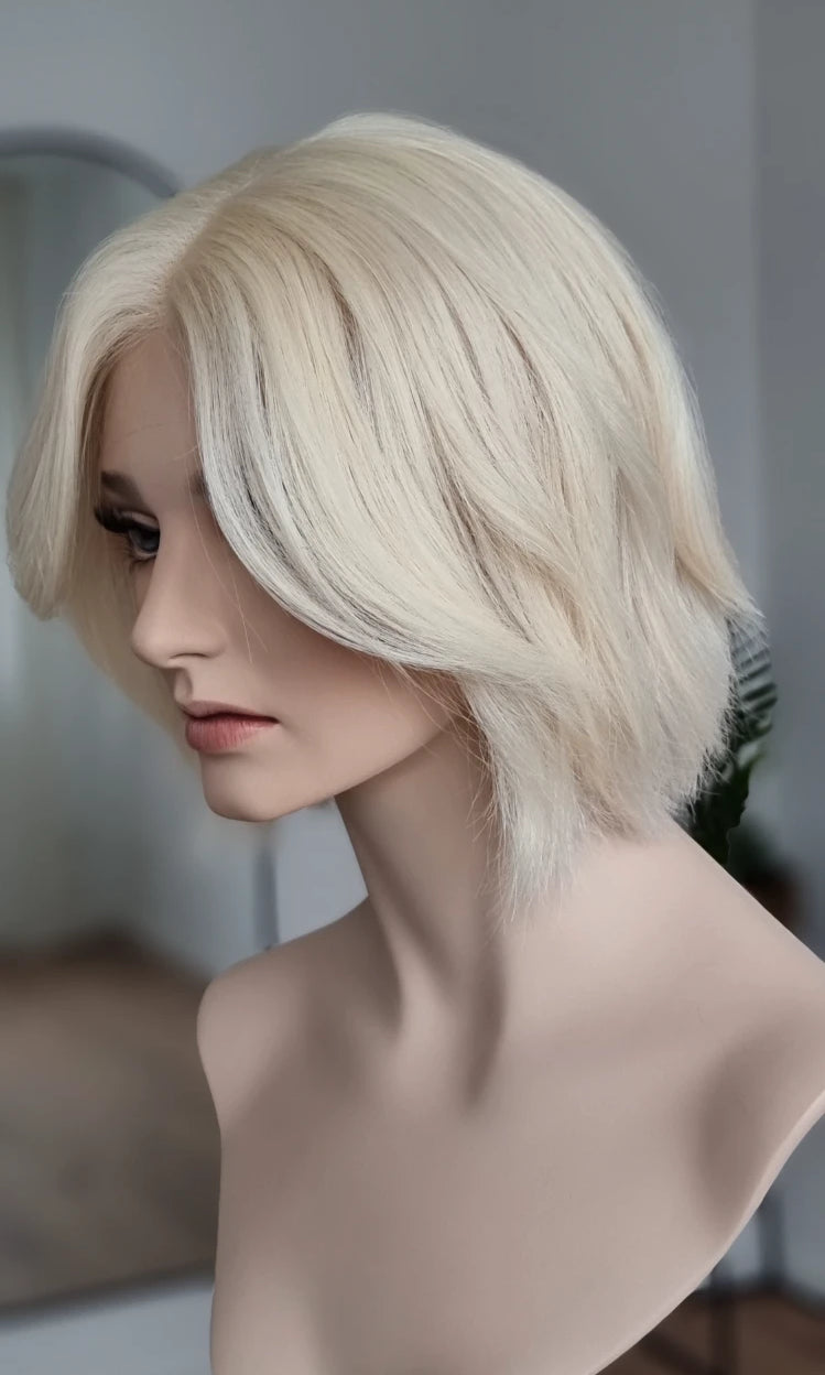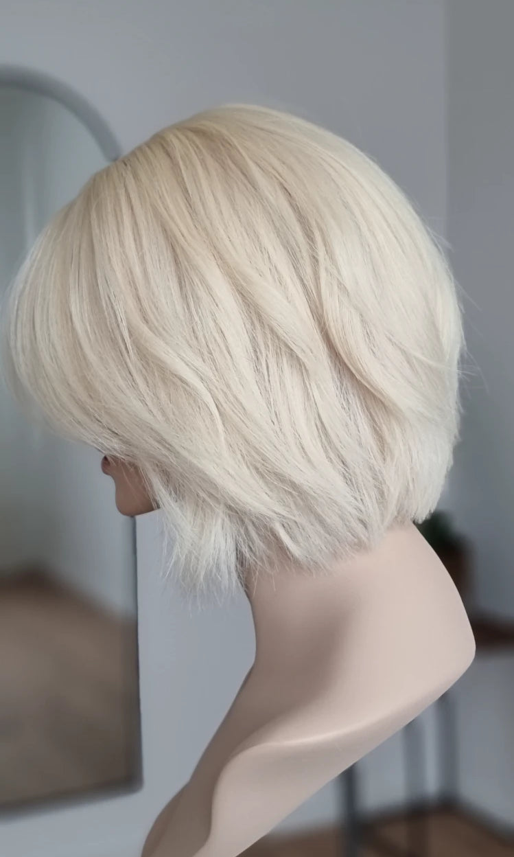Eine Perücke bedeckt den gesamten Kopf und besteht aus verschiedenen Verarbeitungstechnicken, die gemeinsam für ein natürliches Aussehen sorgen.