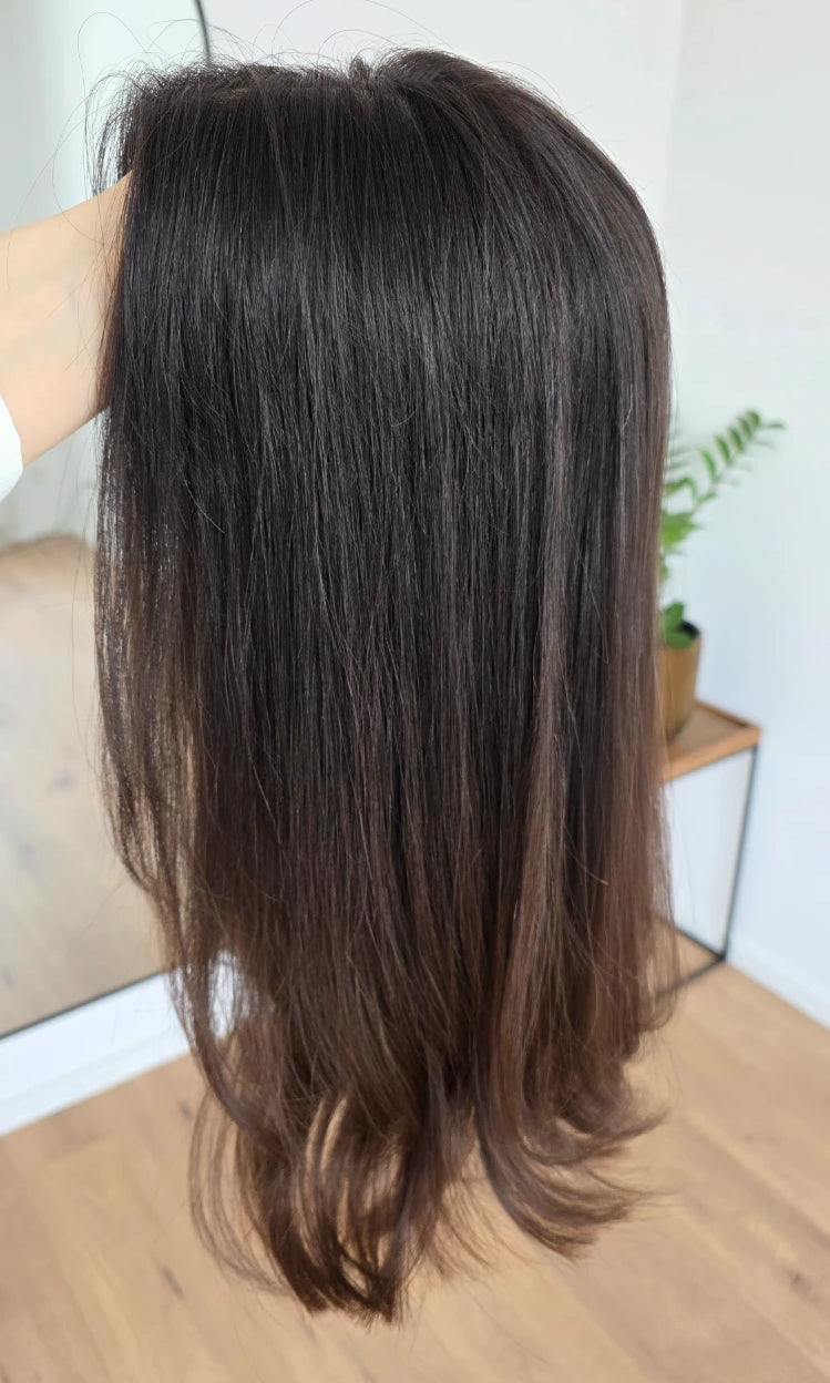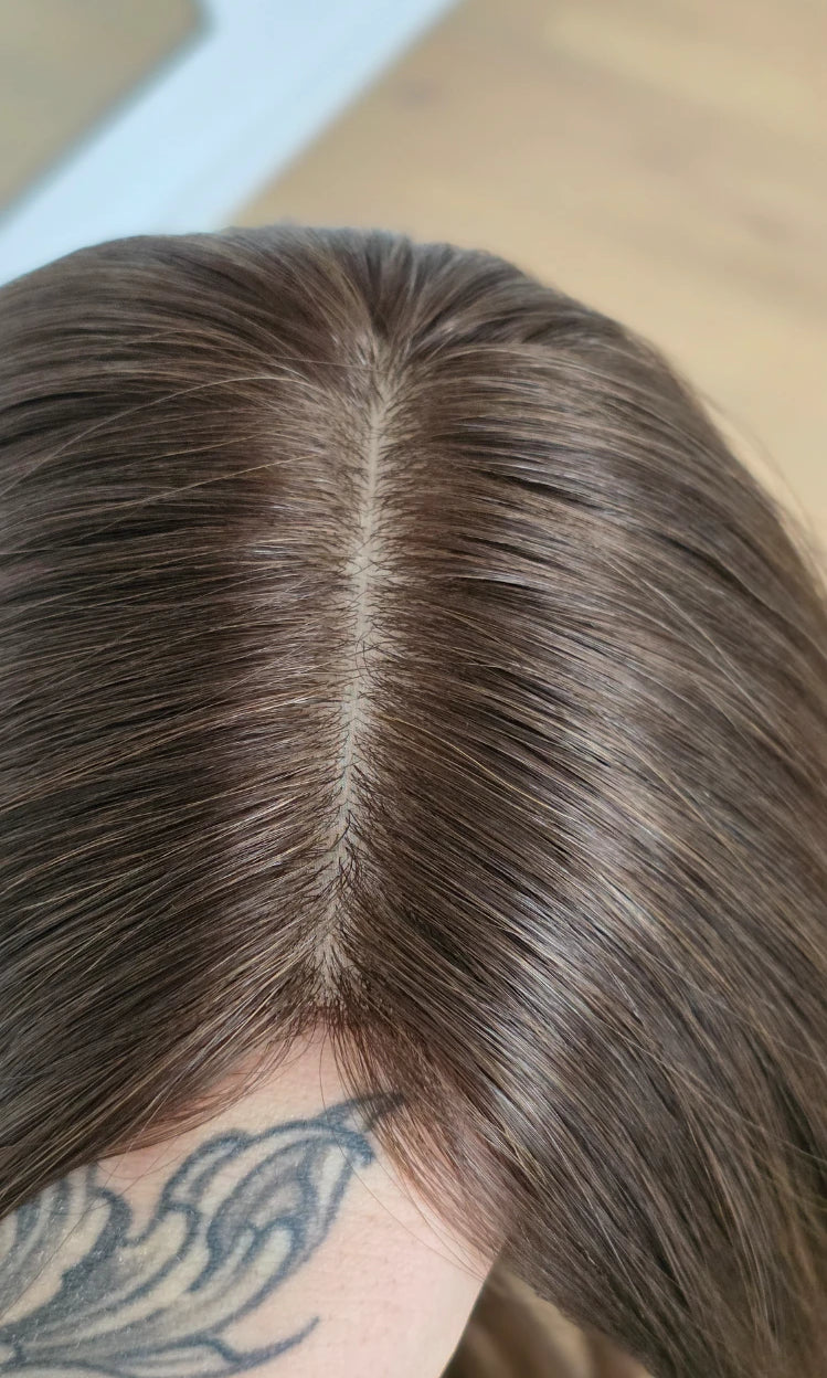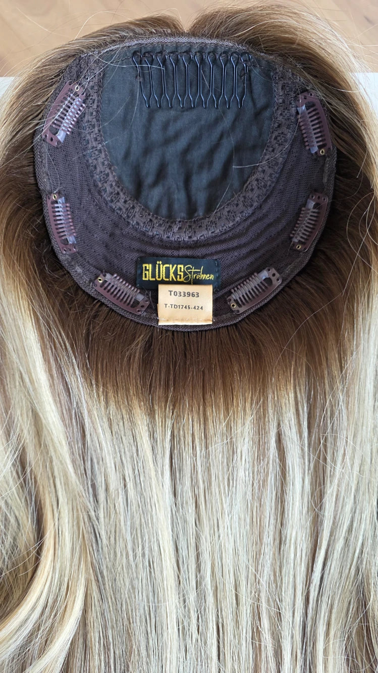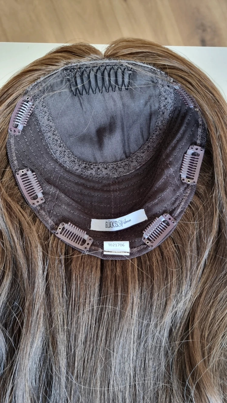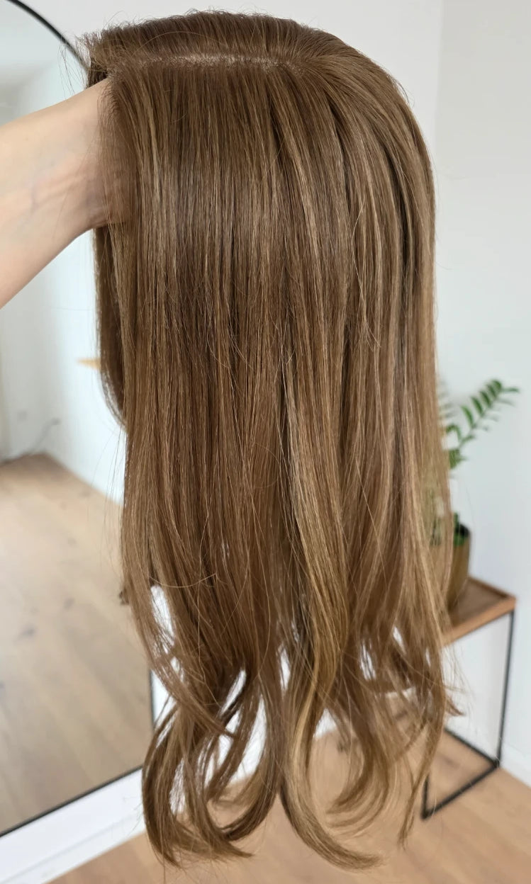 Ein Silk-Topper ist ein hochwertiges Haarteil, das den Bereich am Oberkopf abdeckt – mit dem Ziel, Volumen, Dichte und ein absolut natürliches Erscheinungsbild zu schaffen. Der Name „Silk“ bezieht sich dabei auf die spezielle Seidenlage im Topper, die die Haaransätze wie aus der Kopfhaut wachsend erscheinen lässt.