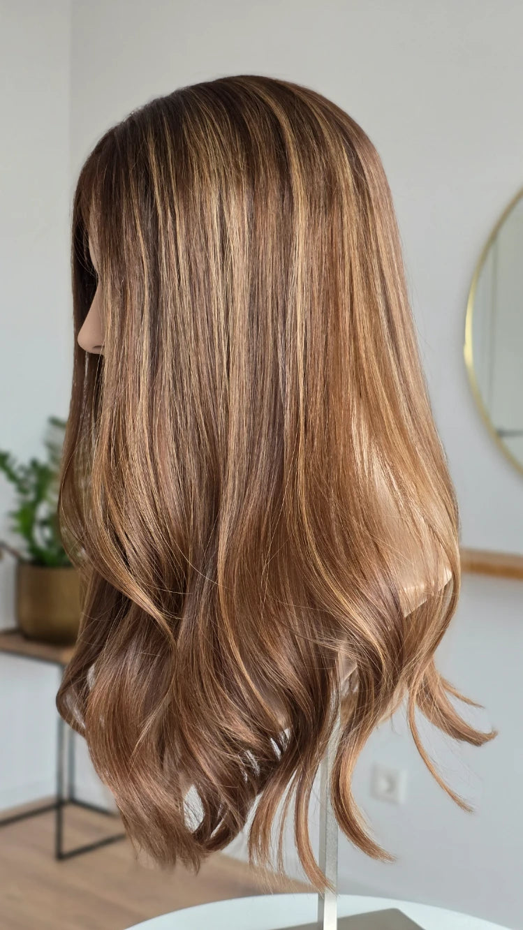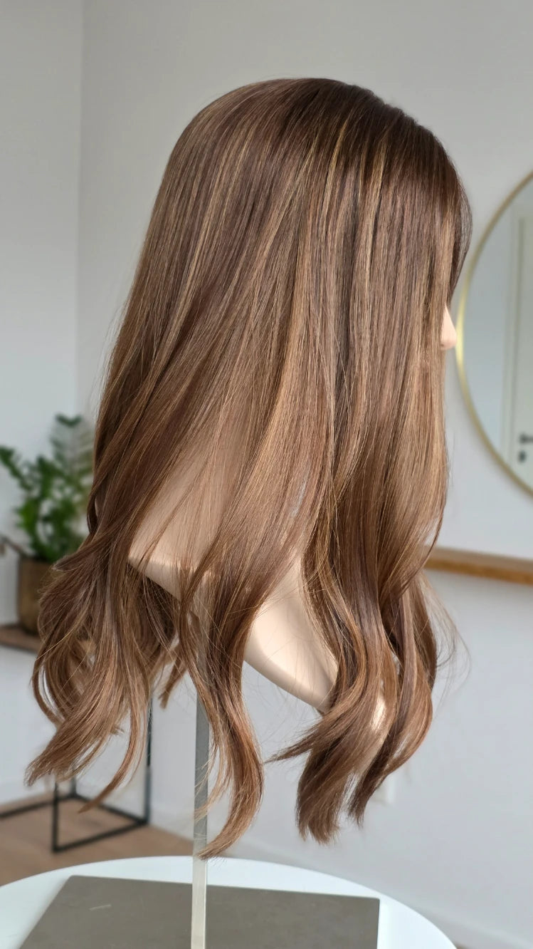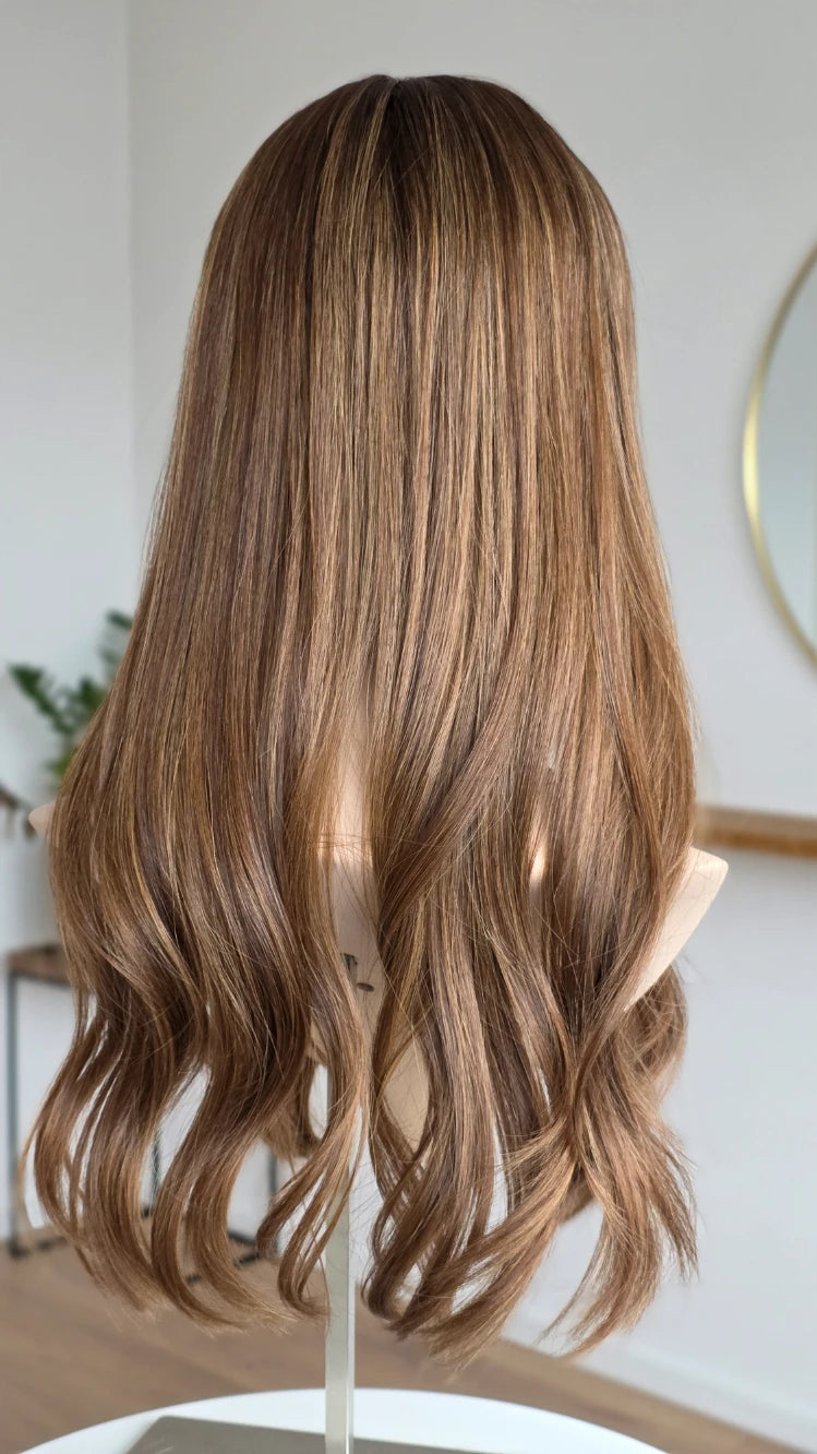 • Farbe Ansatz neutrales Mittelbraun, Längen warmes Hellbraun mit subtilen goldigen Highlights