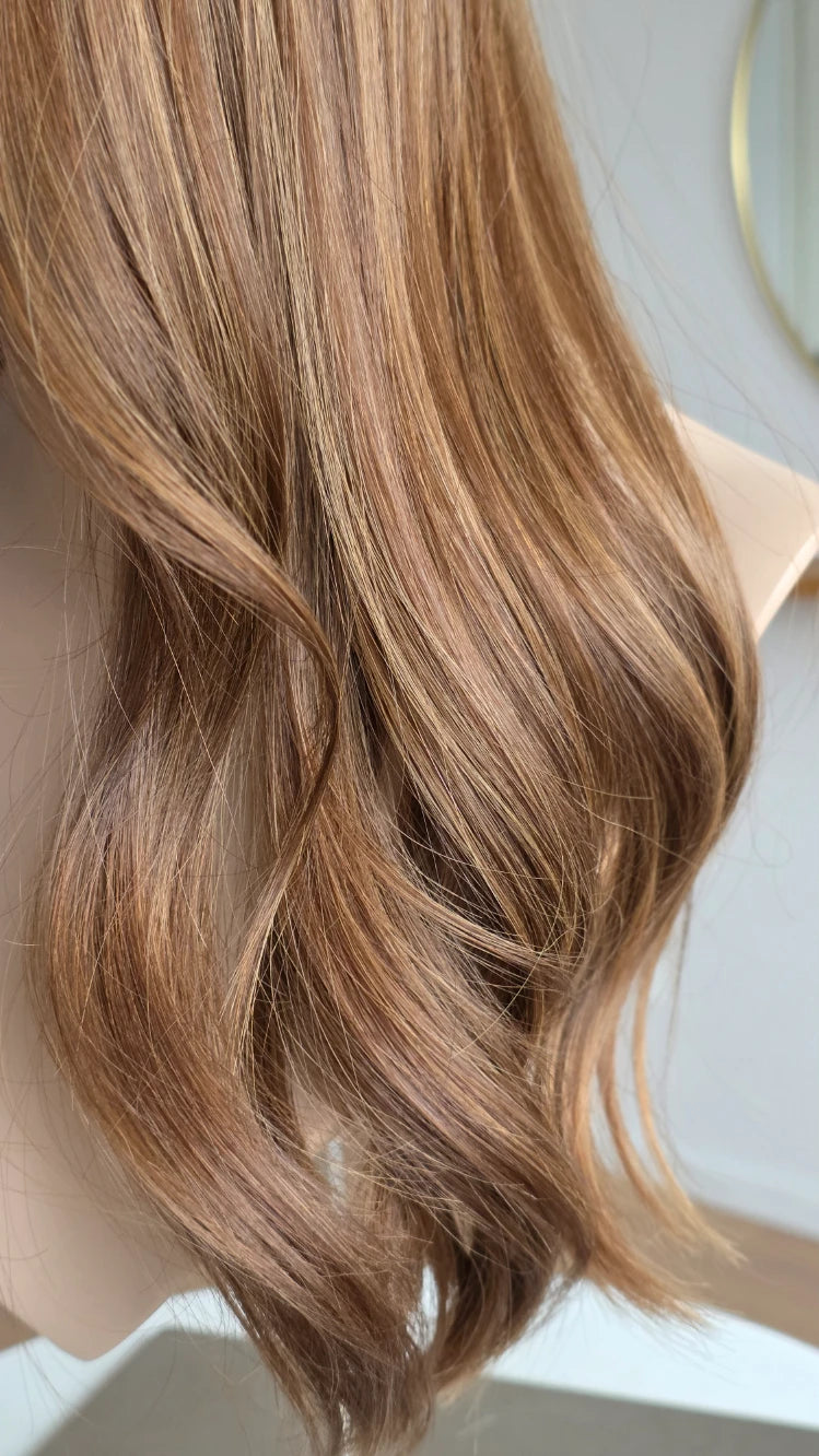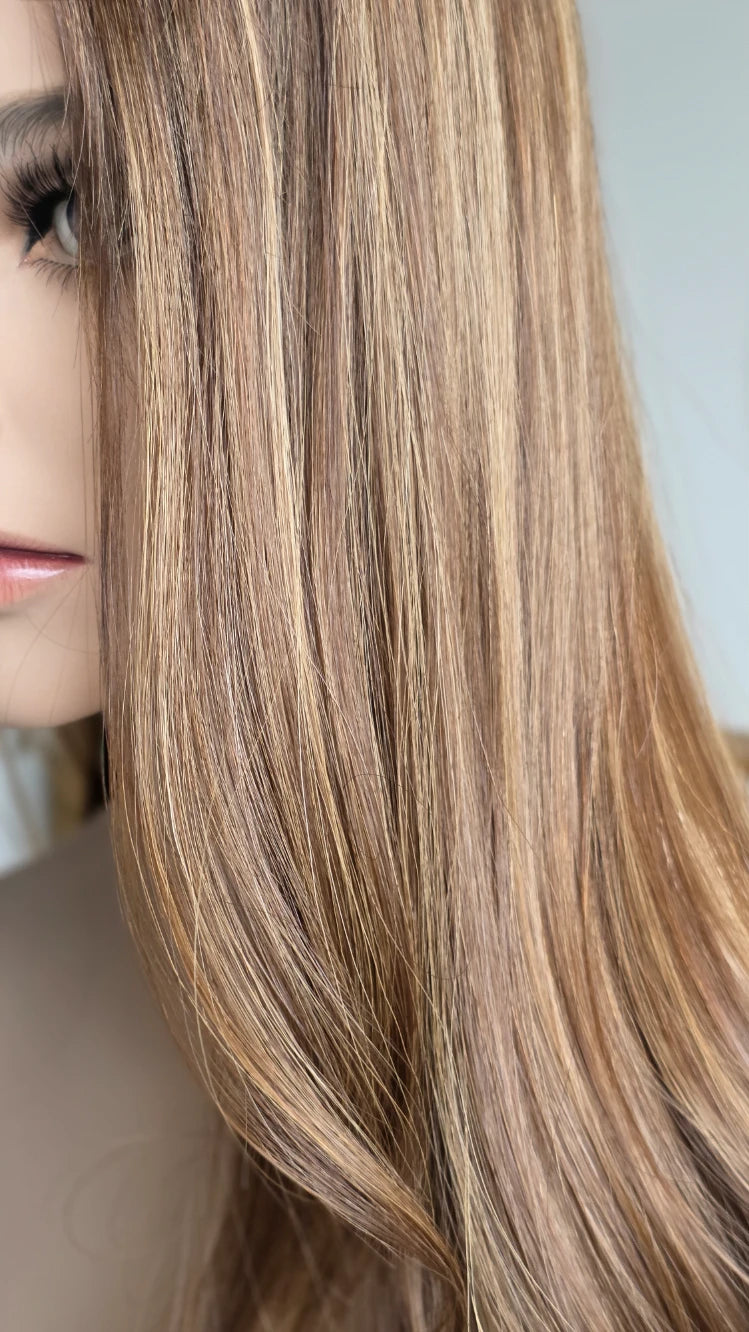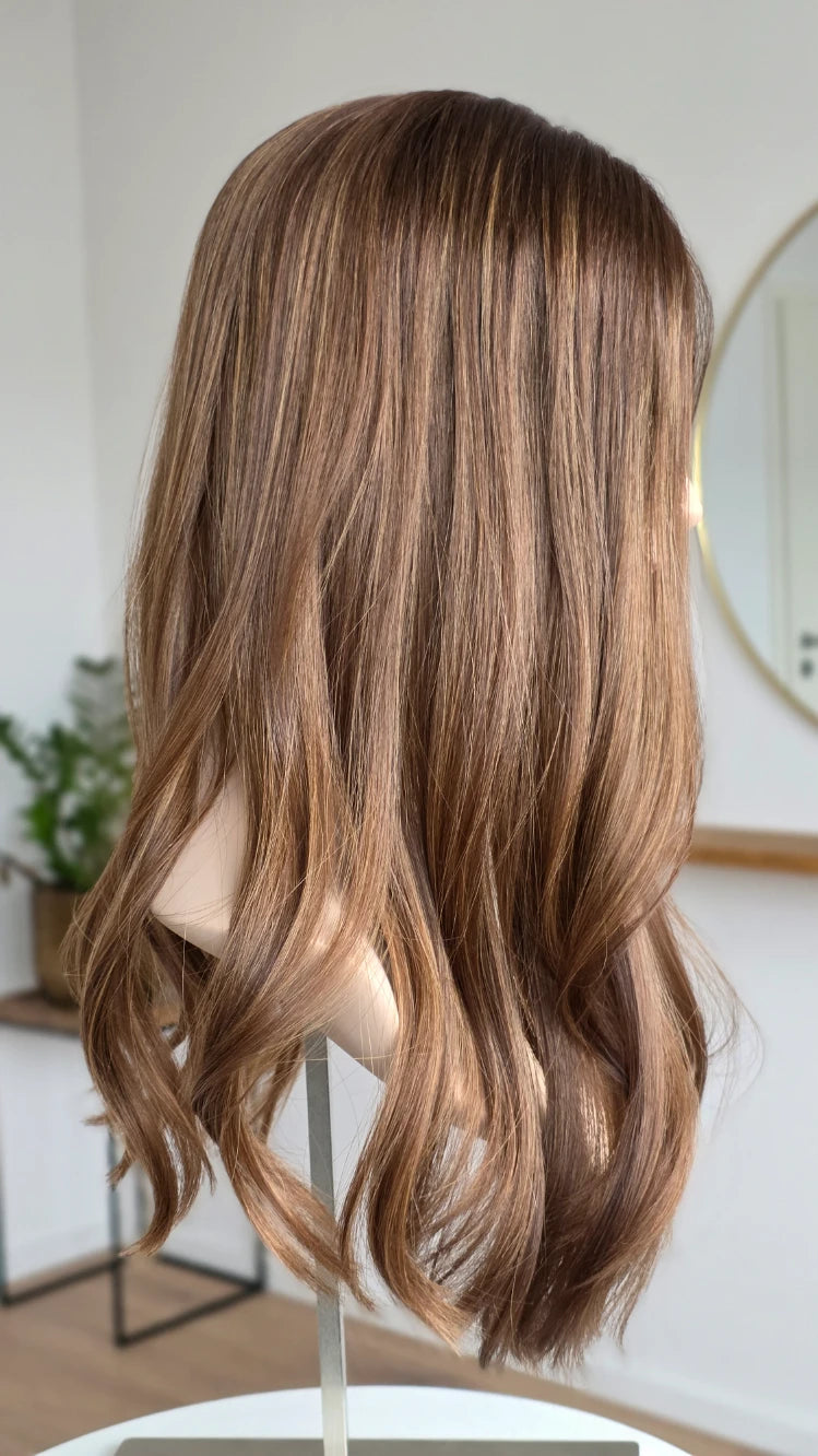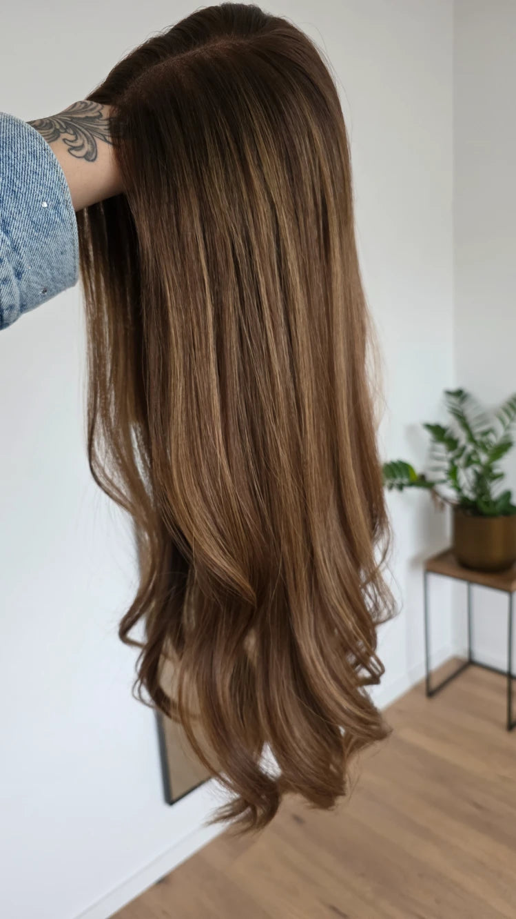 • Farbe Ansatz neutrales Mittelbraun, Längen warmes Hellbraun mit subtilen goldigen Highlights