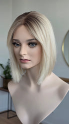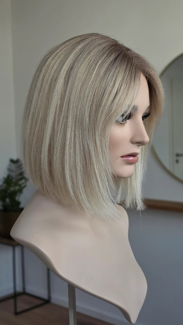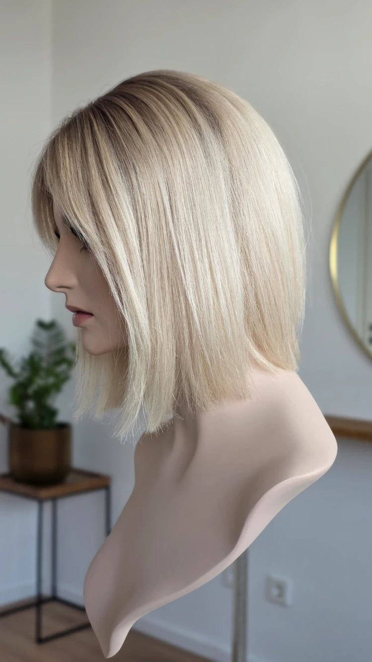 - Farbe Ansatz aschiges Mittelblond, Längen helles Blond