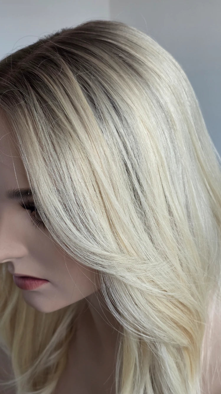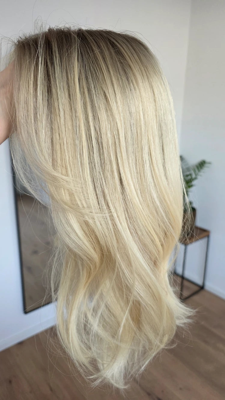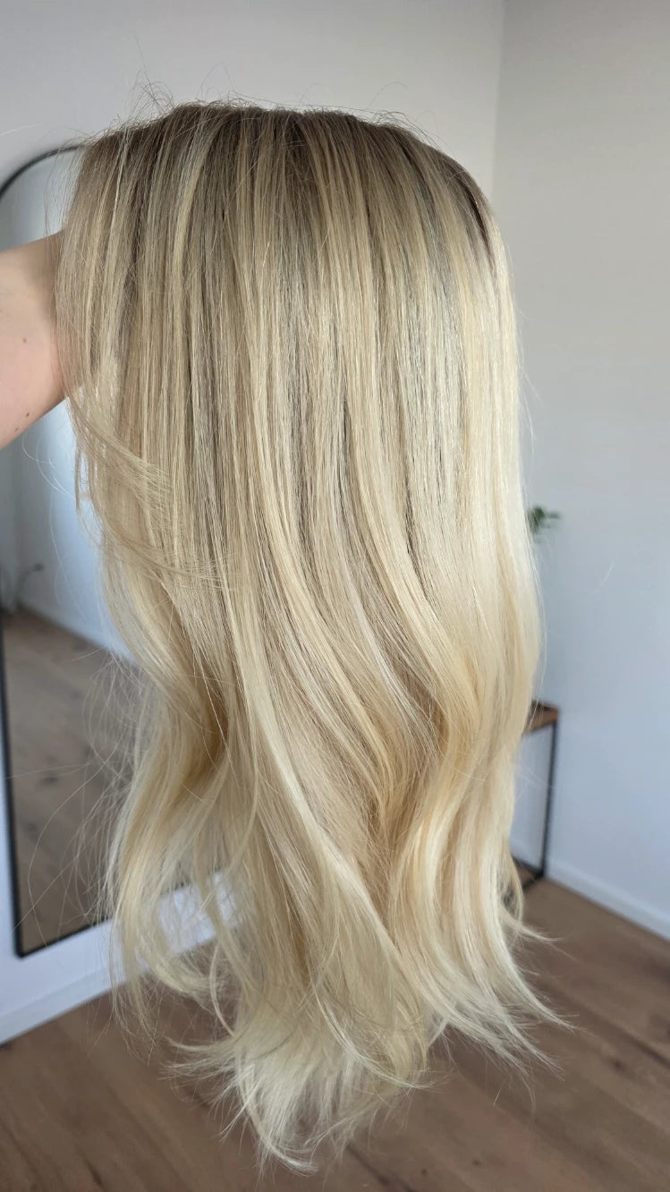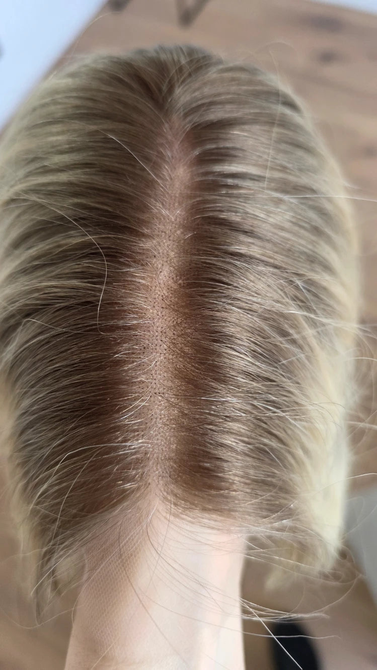 Die Knoten sind gebleicht, können allerdings nur bis zu einem gewissen Punkt blondiert werden, ohne die Integrität der Perücke zu gefährden. Da Haar ein Naturprodukt ist und somit natürlichen Schwankungen unterliegt, lassen sich manche Knoten besser aufhellen als andere. Sollten die Knoten nicht ganz aufgehellt werden können, kannst du sie mit hellem Puder oder unserem Perückenstift kaschieren.