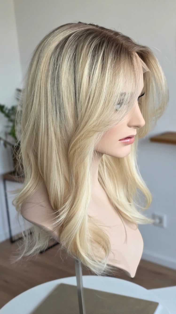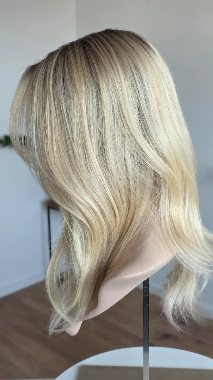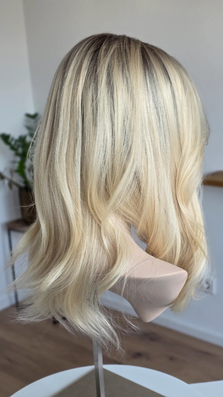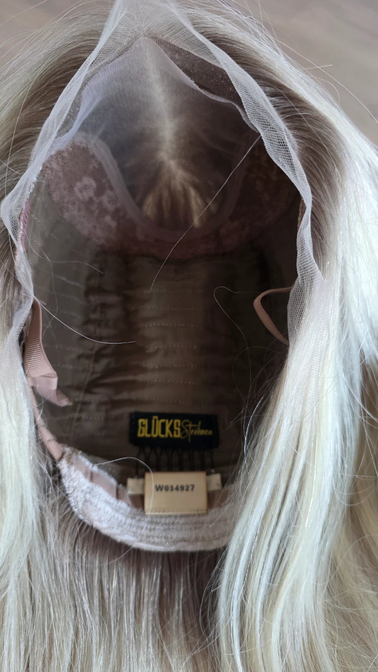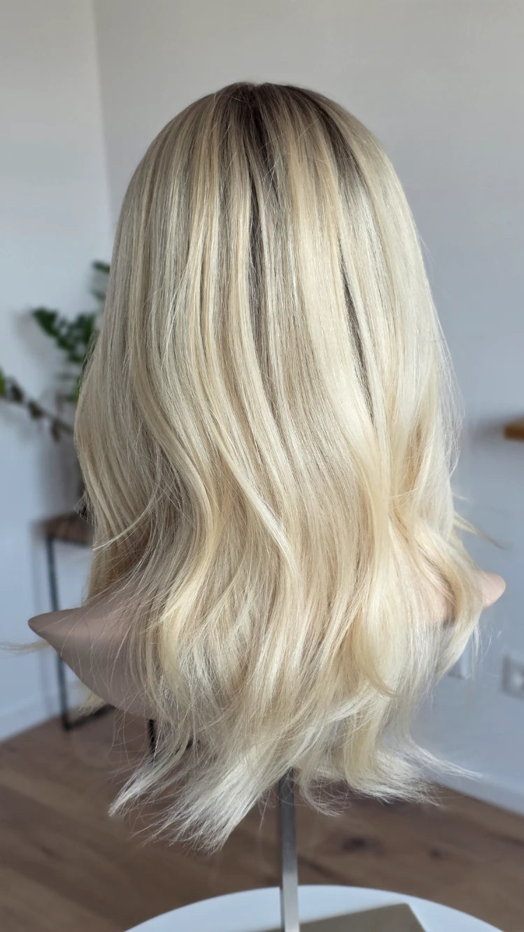 Die Knoten sind gebleicht, können allerdings nur bis zu einem gewissen Punkt blondiert werden, ohne die Integrität der Perücke zu gefährden. Da Haar ein Naturprodukt ist und somit natürlichen Schwankungen unterliegt, lassen sich manche Knoten besser aufhellen als andere. Sollten die Knoten nicht ganz aufgehellt werden können, kannst du sie mit hellem Puder oder unserem Perückenstift kaschieren.