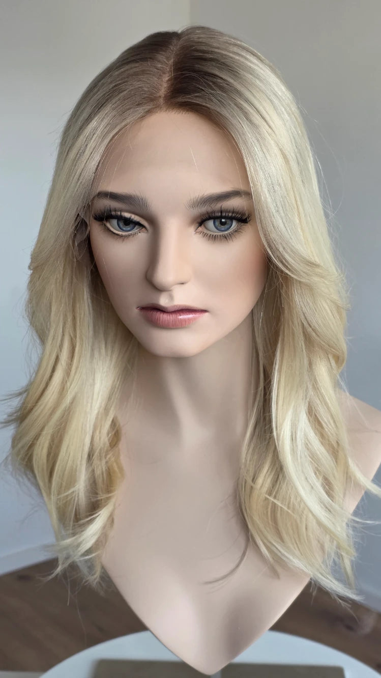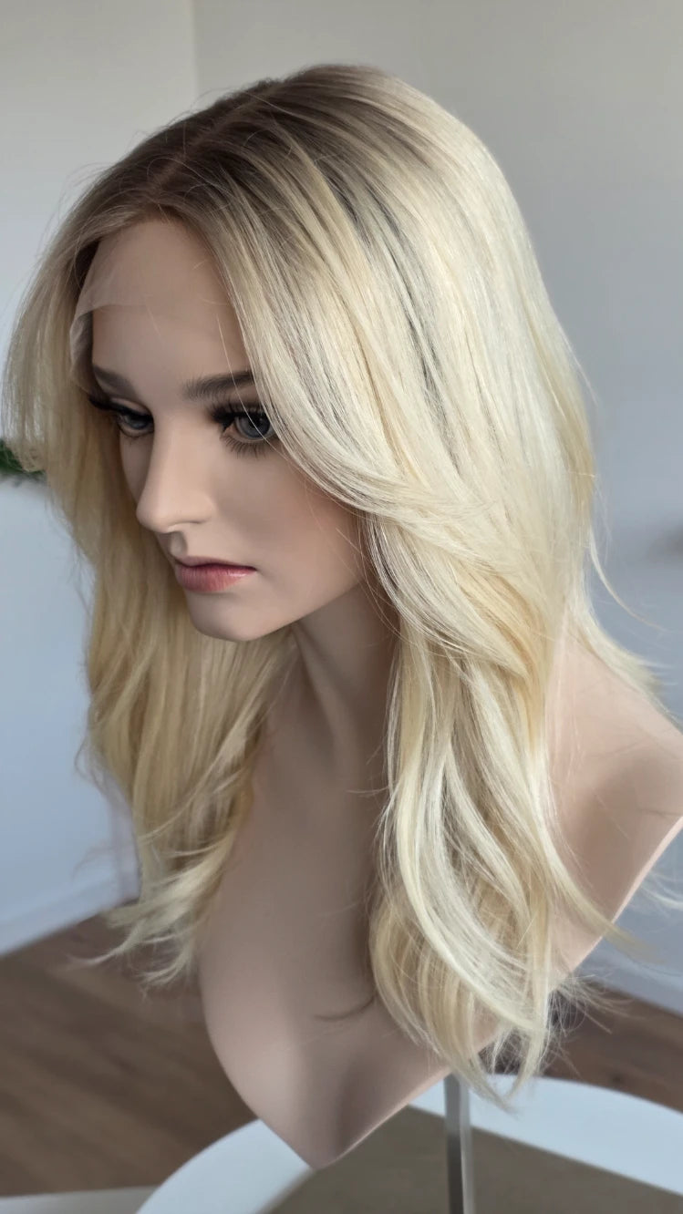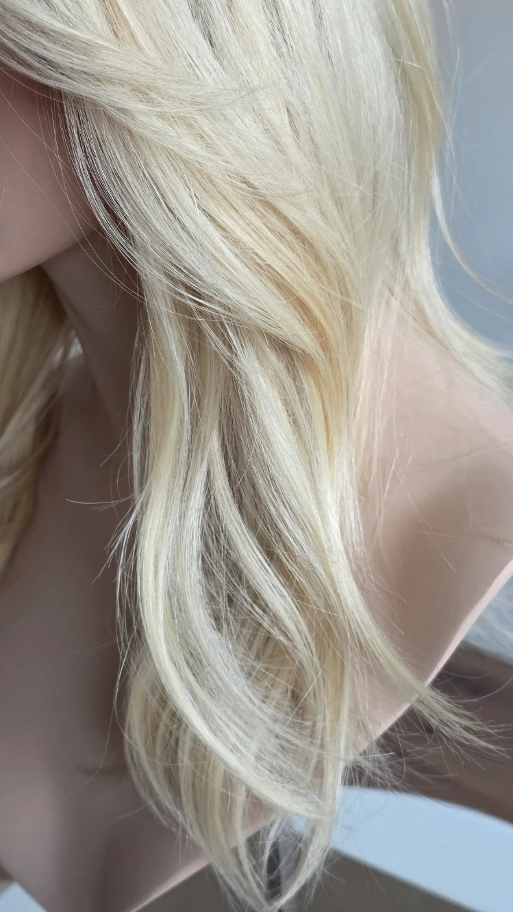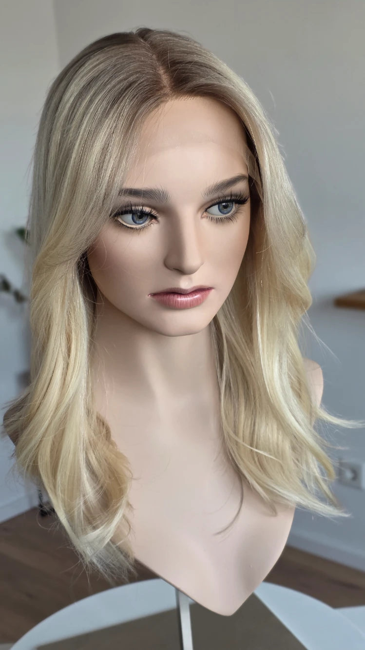 Die Knoten sind gebleicht, können allerdings nur bis zu einem gewissen Punkt blondiert werden, ohne die Integrität der Perücke zu gefährden. Da Haar ein Naturprodukt ist und somit natürlichen Schwankungen unterliegt, lassen sich manche Knoten besser aufhellen als andere. Sollten die Knoten nicht ganz aufgehellt werden können, kannst du sie mit hellem Puder oder unserem Perückenstift kaschieren.