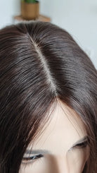 Um sicherzugehen, dass die Haarlänge für dich passend ist, nimm bitte ein flexibles Maßband und miss vom Mittelscheitel seitlich am Kopf herunter bis zu den Spitzen. Idealerweise ist der Topper dann 2 cm länger als dein eigenes Haar.